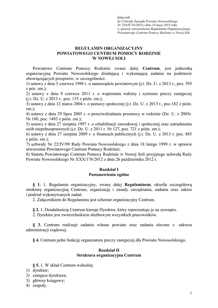 Załącznik do Uchwały Zarządu Powiatu Nowosolskiego Nr 254/IV/16/2014 z dnia 14 maja 2014 roku w sprawie zatwierdzenia Regulaminu Organizacyjnego Powiatowego Centrum Pomocy Rodzinie w Nowej Soli REGULAMIN ORGANIZACYJNY POWIATOWEGO CENTRUM POMOCY RODZINIE W NOWEJ SOLI Powiatowe Centrum Pomocy Rodzinie zwane dalej Centrum, jest jednostką organizacyjną Powiatu Nowosolskiego działającą i wykonującą zadania na podstawie obowiązujących przepisów, w szczególności: 1) ustawy z dnia 5 czerwca 1998 r. o samorządzie powiatowym (j.t. Dz. U. z 2013 r., poz. 595 z póz. zm.); 2) ustawy z dnia 9 czerwca 2011 r. o wspieraniu rodziny i systemie pieczy zastępczej (j.t. Dz. U. z 2013 r., poz. 135 z późn. zm.); 3) ustawy z dnia 12 marca 2004 r. o pomocy społecznej (j.t. Dz. U. z 2013 r., poz.182 z późn. zm.); 4) ustawy z dnia 29 lipca 2005 r. o przeciwdziałaniu przemocy w rodzinie (Dz. U. z 2005r. Nr 180, poz. 1493 z późn. zm.); 5) ustawy z dnia 27 sierpnia 1997 r. o rehabilitacji zawodowej i społecznej oraz zatrudnianiu osób niepełnosprawnych (j.t. Dz. U. z 2011 r. Nr 127, poz. 721 z późn. zm.); 6) ustawy z dnia 27 sierpnia 2009 r. o finansach publicznych (j.t. Dz. U. z 2013 r. poz. 885 z późn. zm.); 7) uchwały Nr 22/IV/99 Rady Powiatu Nowosolskiego z dnia 18 lutego 1999 r. w sprawie utworzenia Powiatowego Centrum Pomocy Rodzinie; 8) Statutu Powiatowego Centrum Pomocy Rodzinie w Nowej Soli przyjętego uchwałą Rady Powiatu Nowosolskiego Nr XXX/176/2012 z dnia 26 października 2012 r. Rozdział I Postanowienia ogólne § 1. 1. Regulamin organizacyjny, zwany dalej Regulaminem, określa szczegółową strukturę organizacyjną Centrum, organizację i zasady zarządzania, zadania oraz zakres i podział wykonywanych zadań. 2. Załącznikiem do Regulaminu jest schemat organizacyjny Centrum. § 2. 1. Działalnością Centrum kieruje Dyrektor, który reprezentuje je na zewnątrz. 2. Dyrektor jest zwierzchnikiem służbowym wszystkich pracowników. § 3. Centrum realizuje zadania własne powiatu oraz zadania zlecone z zakresu administracji rządowej. § 4. Centrum pełni funkcję organizatora pieczy zastępczej dla Powiatu Nowosolskiego. Rozdział II Struktura organizacyjna Centrum 1) 2) 3) 4) § 5. 1. W skład Centrum wchodzą: dyrektor; zastępca dyrektora; główny księgowy; zespoły. 1 1) 2) 3) 4) 5) 2. Zespoły oznacza się następującymi symbolami: PCPR I - zespół ds. pieczy zastępczej; PCPR II - zespół ds. pomocy społecznej i przeciwdziałania przemocy w rodzinie; PCPR III - zespół ds. rehabilitacji społecznej; PCPR IV - zespół ds. administracji i obsługi; PCPR V - zespół ds. finansów. 3. W skład zespołów wchodzą stanowiska pracy. Rozdział III Organizacja i zasady zarządzania § 6. 1. Dyrektora Centrum zatrudnia Zarząd Powiatu Nowosolskiego. 2. Stosunek pracy z pozostałymi pracownikami nawiązuje i rozwiązuje Dyrektor Centrum. § 7. 1. Dyrektor bezpośrednio kieruje i nadzoruje działalność merytoryczną: zastępcy dyrektora; głównego księgowego; zespołu ds. rehabilitacji społecznej; zespołu ds. administracji i obsługi; zespołu ds. finansów. 2. Dyrektor wydaje polecenia służbowe i przekazuje sprawy do załatwienia za pośrednictwem zastępcy i bezpośrednio zatrudnionym pracownikom. 3. Dyrektor Centrum wykonuje zadania określone w Statucie PCPR, a ponadto: 1) wytycza powództwo o zasądzaniu świadczeń alimentacyjnych na rzecz dziecka przebywającego w pieczy zastępczej ponad rok; 2) organizuje pracę Centrum; 3) reprezentuje Centrum na zewnątrz; 4) planuje i dysponuje środkami finansowymi przeznaczonymi na realizację zadań Centrum; 5) wydaje zarządzenia i polecenia służbowe; 6) kształtuje politykę kadrową Centrum; 7) wydaje opinie na temat kandydatów na kierowników powiatowych jednostek pomocy społecznej; 8) wydaje w imieniu Starosty decyzje administracyjne z zakresu działania Centrum; 9) koordynuje działaniami dotyczącymi realizacji zadań powiatowej strategii rozwiązywania problemów społecznych; 10) zawiera umowy i porozumienia w zakresie działalności Centrum; 11) składa właściwym organom Powiatu sprawozdania z działalności Centrum. 1) 2) 3) 4) 5) § 8. W Centrum mogą być tworzone komisje, zespoły zadaniowe, jako organy pomocnicze lub opiniodawczo-doradcze składające się z pracowników różnych komórek organizacyjnych, przedstawicieli organów współpracujących z Centrum oraz ekspertów. § 9. 1. Zastępca dyrektora bezpośrednio kieruje i nadzoruje działalność merytoryczną: 1) zespołu ds. pieczy zastępczej; 2) zespołu pomocy społecznej i przeciwdziałania przemocy w rodzinie. 2. Zastępca dyrektora w zakresie powierzonych zadań: 1) organizuje wykonanie zadań zespołów, wynikających z przepisów prawa, zarządzeń, poleceń Dyrektora, uchwał Zarządu Powiatu i Rady Powiatu; 2) przekazuje informacje, polecenia i dyspozycje pracownikom zespołów; 3) nadzoruje przygotowanie sprawozdań należących do zadań zespołów; 4) nadzoruje przygotowanie projektów uchwał, zarządzeń, porozumień, umów, decyzji i innych pism w zakresie przedmiotu działalności zespołów; 5) parafuje pisma do podpisu przez Dyrektora; 2 6) opiniuje dobór obsady zespołów, wnioskuje o wysokość wynagrodzenia, zaszeregowania oraz nagród i kar dla podległych pracowników; 7) ustala i aktualizuje szczegółowe zakresy czynności podległych pracowników; 8) powierza pracownikom zespołów wykonanie czynności i zadań dodatkowych; 9) przeprowadza kontrolę formalną i merytoryczną zespołów; 10) analizuje, kontroluje i planuje wydatki należące do właściwości zespołów. 3. Zastępca dyrektora wypełnia obowiązki Dyrektora - w przypadku jego nieobecności. § 10. 1. Główny księgowy bezpośrednio kieruje i nadzoruje działalność merytoryczną zespołu finansowego. 2. Do zadań głównego księgowego należy w szczególności: 1) prowadzenie rachunkowości jednostki; 2) dokonywania wstępnej ko