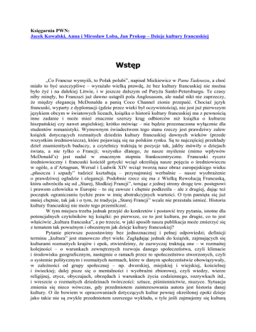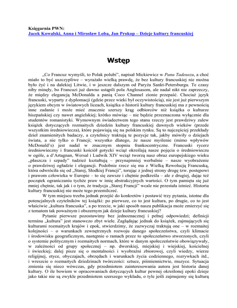 Księgarnia PWN: Jacek Kowalski, Anna i Mirosław Loba, Jan Prokop – Dzieje kultury francuskiej Wstęp „Co Francuz wymyśli, to Polak polubi”, napisał Mickiewicz w Panu Tadeuszu, a choć miało to być uszczypliwe – wyrażało wielką prawdę, że bez kultury francuskiej nie można było żyć i na dalekiej Litwie, i w jeszcze dalszym od Paryża Sankt-Petersburgu. Te czasy niby minęły, bo Francuzi już dawno ustąpili pola Anglosasom, ale nadal nikt nie zaprzeczy, że między elegancją McDonalda a panią Coco Channel zionie przepaść. Chociaż język francuski, wyparty z dyplomacji (gdzie przez wieki był oczywistością), nie jest już pierwszym językiem obcym w światowych liceach, książka o historii kultury francuskiej ma z pewnością inne zadanie i może mieć znacznie szerszy krąg odbiorców niż książka o kulturze hiszpańskiej czy nawet angielskiej; krótko mówiąc – nie będzie przeznaczona wyłącznie dla studentów romanistyki. Wymownym świadectwem tego stanu rzeczy jest prawdziwy zalew książek dotyczących rozmaitych dziedzin kultury francuskiej dawnych wieków (przede wszystkim średniowiecza), które pojawiają się na polskim rynku. Są to najczęściej przekłady dzieł znamienitych badaczy, a czytelnicy traktują te pozycje tak, jakby mówiły o dziejach świata, a nie tylko o Francji; wszystko dlatego, że nasze myślenie (mimo wpływów McDonald’s) jest nadal w znacznym stopniu frankocentryczne. Francuski rycerz średniowieczny i francuski kościół gotycki wciąż określają nasze pojęcia o średniowieczu w ogóle, a d’Artagnan, Wersal i Ludwik XIV wciąż tworzą nasz obraz europejskiego wieku „płaszcza i szpady” tudzież kształtują – przynajmniej werbalnie – nasze wyobrażenie o prawdziwej ogładzie i elegancji. Podobnie rzecz się ma z Wielką Rewolucją Francuską, która odwróciła się od „Starej, Słodkiej Francji”, torując z jednej strony drogę tzw. postępowi i prawom człowieka w Europie – to się zawsze i chętnie podkreśla – ale z drugiej, dając też początek ograniczaniu tychże praw w imię abstrakcyjnych wartości. O tym pamięta się już mniej chętnie, tak jak i o tym, że tradycja „Starej Francji” wcale nie przestała istnieć. Historia kultury francuskiej nie może tego przemilczeć. W tym miejscu trzeba jednak przejść do konkretów i postawić trzy pytania, istotne dla potencjalnych czytelników tej książki: po pierwsze, co to jest kultura, po drugie, co to jest właściwie „kultura francuska”, a po trzecie, w jaki sposób nasza publikacja może zmierzyć się z tematem tak poważnym i obszernym jak dzieje kultury francuskiej? Pytanie pierwsze pozostawimy bez jednoznacznej i pełnej odpowiedzi; definicji terminu „kultura” jest stanowczo zbyt wiele. Zaglądając jednak do książek, zajmujących się kulturami rozmaitych krajów i epok, stwierdzimy, że zazwyczaj traktują one – w rozmaitej kolejności – o warunkach zewnętrznych rozwoju danego społeczeństwa, czyli klimacie i środowisku geograficznym, następnie o ramach przez to społeczeństwo stworzonych, czyli o systemie politycznym i rozmaitych normach, które w danym społeczeństwie obowiązywały, w zależności od grupy społecznej – np. dworskiej, miejskiej i wiejskiej, kościelnej i świeckiej; dalej pisze się o mentalności i wyobraźni zbiorowej, czyli wiedzy, wierze religijnej, etyce, obyczajach, obrzędach i warunkach życia codziennego, rozrywkach itd., i wreszcie o rozmaitych dziedzinach twórczości: sztuce, piśmiennictwie, muzyce. Sytuacja zmienia się nieco wówczas, gdy przedmiotem zainteresowania autora jest historia danej kultury. O ile bowiem w opracowaniach dotyczących kultur pewnej określonej epoki dzieje jako takie nie są zwykle przedmiotem szerszego wykładu, o tyle jeśli zajmujemy się kulturą na przestrzeni dłuższych okresów, to nad historią nie można przejść do porządku dziennego. Nie da się też zaprzeczyć, że żadna kultura, będąca rodzajem dziedzictwa, zawiera w sobie przesłania dotyczące postaci i wydarzeń, które żyją i dzieją się w czasie. Można je pominąć, można też włączyć do opowieści. W tej książce miejsce historii jest skromne, aczkolwiek szersze niż w wypadku najpopularniejszego i najlepszego podręcznika kultury francuskiej, pióra Georges’a Duby’ego i Roberta Mandrou, różniącego się nie tylko osobami autorów – niezastąpionych i świetnych – lecz i zakresem, gdyż ich książka omawia kulturę Francji, poczynając od roku tysięcznego, który dla niniejszej stanowi półmetek. Jednocześnie nasza publikacja ma charakter znacznie bardziej skrótowy i podręcznikowy. Cóż to jednak jest kultura francuska widziana jako podmiot dziejów? Pytanie może wydać się kłopotliwe. Nie bez powodu Duby i Mandrou zaczęli omówienie kultury francuskiej od II tysiąclecia po Chrystusie, gdyż wcześniej nie istniało pojęcie Francuza w dzisiejszym jego rozumieniu. Czyż jednak kiedykolwiek istniało pojęcie, które nie zmieniało swojego znaczenia przez wieki? Francuzi zaś przyznają się nie tylko do monarchii Franków, lecz i do Galii rzymskiej i celtyckiej. Zgoda. Jednocześnie jednak pojawia się kolejny problem: tereny, składające się dziś na Republikę Francji, nie zawsze wchodziły w skład ziem, o których uważano, że są francuskie, a część terenów uważanych za francuskie – głównie tych zajętych podczas wojen kolonialnych – od Republiki odpadła. Ponadto np. taka kultura Bretanii, choć jest, patrząc z zewnątrz, integralnym elementem francuskiej kultury i choć każdy Francuz w zasadzie do niej się przyznaje – jednak trudno powiedzieć, aby była ona kulturą francuską. Bretania jako taka francuską nie jest i nie była, ma silne poczucie odrębności. Podobne problemy pojawią się w wypadku wielu innych regionów. Zatem odpowiedź na pytanie, co jest tematem tej książki, będzie musiała być mn