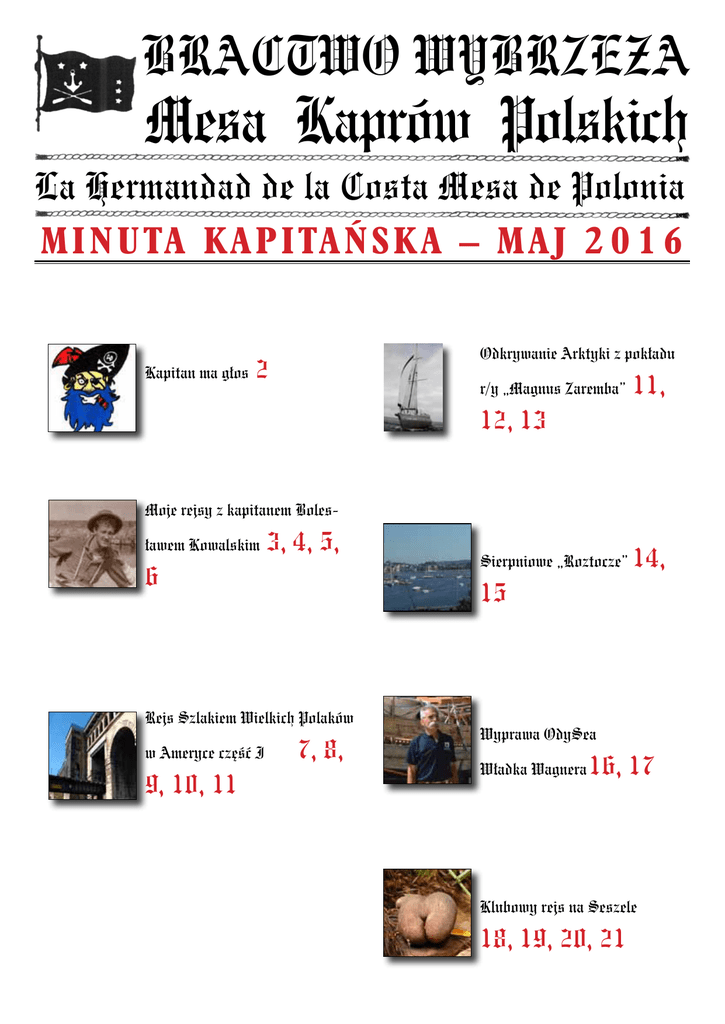 Bractwo Wybrzeża Mesa Kaprów Polskich La Hermandad de la Costa Mesa de Polonia M i n u ta Ka p i ta ń s ka – m a j 2 0 1 6 2 Kapitan ma głos Odkrywanie Arktyki z pokładu 11, r/y „Magnus Zaremba” 12, 13 Moje rejsy z kapitanem Boles 3, 4, 5, ławem Kowalskim 6 15 Rejs Szlakiem Wielkich Polaków 7, 8, w Ameryce część I 9, 10, 11 14, Sierpniowe „Roztocze” Wyprawa OdySea 16, 17 Władka Wagnera Klubowy rejs na Seszele 18, 19, 20, 21 2 Minuta Kapitańska – maj 2016 Kapitan ma głos Londyn, 5 maja 2016 Drodzy Bracia, Wiem, że tradycyjnie artykułem wstępnym każdej naszej „Minuty” jest wypowiedź pod tytułem „Kapitan ma Głos”. Przykro mi, ale nie jestem zdolny aby wypełnić ten obowiązek należycie. Przypuszczalnie wielu z was już wie, że jestem chory. Od lutego byłem dwukrotnie w szpitalu, a od marca cierpię na paskudną, obezwładniającą i przewlekłą chorobę zwaną „półpasiec”, która w moim wypadku charakteryzuje się niemal nieustannymi silnymi bólami głowy. Te bóle praktycznie uniemożliwiają pracę umysłową, jakąkolwiek koncentrację i używanie pamięci. Miałem stale nadzieję na wyzdrowienie, aby na czas swoją wypowiedź do „Minuty” w pełni sensownie napisać. Czas już minął, a moja sytuacja trwa. Proszę więc Was Bracia o przyjęcie tej informacji jako usprawiedliwienia. Oczywiście mam Wam do przekazania pewne wspólne sprawy i tematy, ale będziemy musieli zaczekać, jak prorokują lekarze, jeszcze parę tygodni. Nie wstrzymując więc obecnie wydania „Minuty” posłużę się do przekazania Wam tych spraw nieco później – za pośrednictwem naszej Grupy MKP w Internecie. Tymczasem dziękuję wszystkim oraz Radzie Siedmiu za ich skuteczne wysiłki, które zapewniają bieżące i samosterowne działanie Bractwa. OOOORZAAAAA!!! Jerzy Knabe (#2) Kapitan Bractwa Wybrzeża Powrót do strony 1 Minuta Kapitańska – maj 2016 3 Ziemowit Leopold Barański (#12) Moje rejsy z kapitanem Bolesławem Kowalskim Każdy kto zaczynał żeglarstwo morskie, siłą rzeczy robił to pod dowództwem jakiegoś kapitana i oficera wachtowego. Były to zazwyczaj pierwsze autorytety, które w jakiś sposób kształtowały dalsze losy takiego żeglarza, jego wiedzę, podejście do obowiązków i respekt dla morza. Oczywiście jeżeli taki żeglarz miał szczęście i trafił na kapitana z wiedzą i klasą to zostawało mu to na całe życie jako nieoceniony kapitał wiedzy i doświadczenia. Ja takie szczęście miałem, bo pierwsze 5 lat mojego żeglarstwa morskiego spędziłem pod dowództwem kapitana Bolesława Kowalskiego (#1) i jemu zawdzięczam naukę dobrej praktyki morskiej i sporą część wiedzy żeglarskiej. Pod komendą Bolka odbyłem 5 rejsów na różnych jachtach w latach 1956–1961 i dopiero kiedy uzyskałem stopień Jach towego Kapitana Żeglugi Wielkiej w 1961 roku nasze drogi na morzu się rozeszły, ale przyjaźń pozostała do końca życia Bolka, a w pamięci trwa nadal. Mój pierwszy rejs W maju 1953 roku zlikwidowano Ligę Morską (w której stawiałem pierwsze kroki żeglarskie) i wcielono ją do Ligi Przyjaciół Żołnierza. Zresztą już wcześniej zlikwidowano Związki Sportowe i Kluby Sportowe poddając je ścisłej kon troli państwowej. W tym też czasie większość jachtów „prze chrzczono” nadając im jedynie słuszne nazwy. Tym sposobem flagowy jacht Ligi Morskiej „Mariusz Zaruski” stał się „Młodą Gwardią”. Oczywiście o żegludze jachtowej nie było mowy (nawet na Zatoce Gdańskiej), ale na „Młodej Gwardii” były or ganizowane rejsy tzw. centralne, na które można było zakwa lifikować się przy odrobinie szczęścia poprzez macierzysty Wydział Wodny LPŻ. Oczywiście na jachcie był oficer politycz ny i na podniesieniu bandery śpiewało się Naprzód młodzieży świata..., ale się pływało. Po zaokrętowaniu w Gdyni okazało się, że kapitanem jest Tadeusz Szpakowski, a II oficerem Bolesław Kowalski (#1). Początkowo trafiłem do wachty Bolka, nota bene razem z Olgierdem Baniewiczem (później naszym Bratem, cyfra 8 i Teresą Pirożek – późniejszą żoną Bolka), ale kiedy okazało się, że etatowy bosman idzie na urlop zostałem awansowany na bosmana, a po wejściu do Ustki, gdzie wy okrętował się I oficer, wszyscy awansowali w górę, Bolek zo stał I oficerem, a ja trzecim. Oczywiście Bolek instruował mnie i pomagał mi ogarnąć nowe obowiązki. Po wyjściu z Ustki tro chę przysztormiło i refowaliśmy żagle. Na „Młodej Gwardii” bezan i grot były gaflowe, a bomy podtrzymywane dirkami. Po zarefowaniu dirki poluzowano, aby żagiel lepiej pracował. Niestety dirki wyluzowano nadmiernie, ale bom wyluzowany do kursu baksztag podtrzymywany był przez żagiel i wszyst ko wyglądało w porządku. Ja kończyłem wachtę o północy, a przejmował ją Bolek. Po wymianie sternika stałem w zej ściówce do nawigacyjnej. Niestety niewprawny nowy sternik zrobił niekontrolowany zwrot przez rufę. Bolek, który stał za mną zobaczył obracający się bom i wcisnął mnie za ramiona w głąb zejściówki. W tym momencie bom ściął naktuz kompa su i przeleciał na drugą burtę. Gdyby nie Bolek, byłbym bez Ścięty naktuz na „Młodej Gwardii”, mój pierwszy rejs głowy, bo bom przeleciał kilka centymetrów nad krawędzią luku. I tak się to zaczęło – patrzyłem w niego jak w obraz, bo nie tylko uczył mnie żeglarstwa, ale uratował mi też życie. Ja chyba też przypadłem mu do gustu, bo na późniejszych rejsach (po grudniu 1956 roku – „przewrót” Gomułki – trochę zelżało politycznie i były już możliwe rejsy morskie) zawsze proponował mi wspólne pływanie. 16.08.1956–31.08.1956 Jacht „Młoda Gwardia” Kapitan Tadeusz Szpakowski, I oficer Bolesław Kowalski Ziemowit Barański – bosman (od połowy rejsu – Ustka – III oficer) Porty: Gdynia, Gdańsk, Ustka, Jastarnia, Gdynia; Mm 628 W załodze: Teresa Pirożek, Olgierd Baniewi