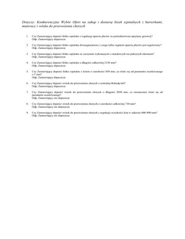 Dotyczy: Konkurencyjny Wybór Ofert na zakup i dostawę łózek szpitalnych z barierkami, materacy i wózka do przewożenia chorych 1. Czy Zamawiający dopuści łóżko szpitalne z regulacją oparcia pleców za pośrednictwem sprężyny gazowej? Odp. Zamawiający dopuszcza 2. Czy Zamawiający dopuści łóżko szpitalne dwusegmentowe z czego tylko segment oparcia pleców jest regulowany? Odp. Zamawiający dopuszcza 3. Czy Zamawiający dopuści łóżko szpitalne ze szczytami wykonanymi z metalowych rur pokrytych chromem? Odp. Zamawiający dopuszcza 4. Czy Zamawiający dopuści łóżko szpitalne o długości całkowitej 2130 mm? Odp. Zamawiający dopuszcza 5. Czy Zamawiający dopuści łóżko szpitalne z leżem o szerokości 850 mm, co różni się od parametru oczekiwanego o 5 mm? Odp. Zamawiający dopuszcza 6. Czy Zamawiający dopuści wózek do przewożenia chorych z centralną blokadą kół? Odp. Zamawiający dopuszcza 7. Czy Zamawiający dopuści wózek do przewożenia chorych o długości 2050 mm, co nieznacznie różni się od parametru oczekiwanego? Odp. Zamawiający nie dopuszcza 8. Czy Zamawiający dopuści wózek do przewożenia chorych o szerokości całkowitej 730 mm? Odp. Zamawiający nie dopuszcza 9. Czy Zamawiający dopuści wózek do przewożenia chorych z regulacją wysokości leża w zakresie 600-900 mm? Odp. Zamawiający nie dopuszcza