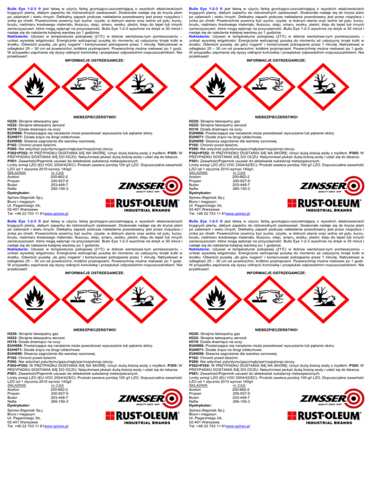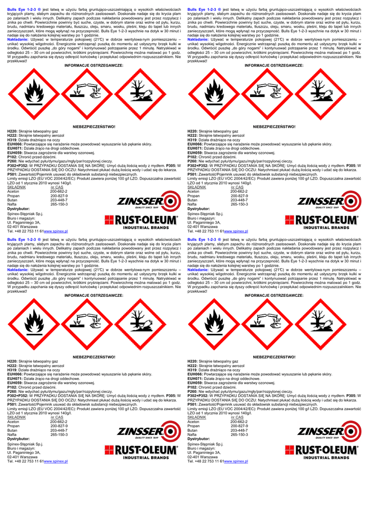 Bulls Eye 1-2-3 ® jest łatwą w użyciu farbą gruntująco-uszczelniającą o wysokich właściwościach kryjących plamy, słabym zapachu do różnorodnych zastosowań. Doskonale nadaje się do krycia plam po zalaniach i wielu innych. Delikatny zapach podczas nakładania powodowany jest przez rozpylacz i znika po chwili. Powierzchnie powinny być suche, czyste, w dobrym stanie oraz wolne od pyłu, kurzu, brudu, nadmiaru kredowego materiału, tłuszczu, oleju, smaru, wosku, pleśni, kleju do tapet lub innych zanieczyszczeń, które mogą wpłynąć na przyczepność. Bulls Eye 1-2-3 wyschnie na dotyk w 30 minut i nadaje się do nałożenia kolejnej warstwy po 1 godzinie. Nakładanie: Używać w temperaturze pokojowej (21°C) w dobrze wentylowa nym pomieszczeniu – unikać wysokiej wilgotności. Energicznie wstrząsnąć puszką do momentu aż usłyszymy brzęk kulki w środku. Odwrócić puszkę „do góry nogami” i kontynuować potrząsanie przez 1 minutę. Natryskiwać w odległości 25 – 30 cm od powierzchni, krótkimi pryśnięciami. Powierzchnię można malować po 1 godz. W przypadku zapchania się dyszy odkręcić końcówkę i przepłukać odpowiednim rozpuszczalnikiem. Nie przekłuwać! INFORMACJE OSTRZEGAWCZE: Bulls Eye 1-2-3 ® jest łatwą w użyciu farbą gruntująco-uszczelniającą o wysokich właściwościach kryjących plamy, słabym zapachu do różnorodnych zastosowań. Doskonale nadaje się do krycia plam po zalaniach i wielu innych. Delikatny zapach podczas nakładania powodowany jest przez rozpylacz i znika po chwili. Powierzchnie powinny być suche, czyste, w dobrym stanie oraz wolne od pyłu, kurzu, brudu, nadmiaru kredowego materiału, tłuszczu, oleju, smaru, wosku, pleśni, kleju do tapet lub innych zanieczyszczeń, które mogą wpłynąć na przyczepność. Bulls Eye 1-2-3 wyschnie na dotyk w 30 minut i nadaje się do nałożenia kolejnej warstwy po 1 godzinie. Nakładanie: Używać w temperaturze pokojowej (21°C) w dobrze wentylowa nym pomieszczeniu – unikać wysokiej wilgotności. Energicznie wstrząsnąć puszką do momentu aż usłyszymy brzęk kulki w środku. Odwrócić puszkę „do góry nogami” i kontynuować potrząsanie przez 1 minutę. Natryskiwać w odległości 25 – 30 cm od powierzchni, krótkimi pryśnięciami. Powierzchnię można malować po 1 godz. W przypadku zapchania się dyszy odkręcić końcówkę i przepłukać odpowiednim rozpuszczalnikiem. Nie przekłuwać! INFORMACJE OSTRZEGAWCZE: NIEBEZPIECZEŃSTWO! H220: Skrajnie łatwopalny gaz H222: Skrajnie łatwopalny aerozol H319: Działa drażniąco na oczy EUH066: Powtarzające się narażenie może powodować wysuszanie lub pękanie skóry. EUH071: Działa żrąco na drogi oddechowe. EUH059: Stwarza zagrożenie dla warstwy ozonowej. P102: Chronić przed dziećmi. P260: Nie wdychać pyłu/dymu/gazu/mgły/par/rozpylonej cieczy. P302+P352: W PRZYPADKU DOSTANIA SIĘ NA SKÓRĘ: Umyć dużą ilością wody z mydłem. P305: W PRZYPADKU DOSTANIA SIĘ DO OCZU: Natychmiast płukać dużą ilością wody i udać się do lekarza. P501: Zawartość/Pojemnik usuwać do składowisk substancji niebezpiecznych. Limity emisji LZO (EU VOC 2004/42/EC): Produkt zawiera poniżej 100 g/l LZO. Dopuszczalna zawartość LZO od 1 stycznia 2010 wynosi 140g/l. SKŁADNIK nr CAS Aceton 200-662-2 Propan 200-827-9 Butan 203-448-7 Nafta 265-150-3 Dystrybutor: Spinex-Stępniak Sp.j. Biuro i magazyn: Ul. Paganiniego 3A, 02-401 Warszawa Tel. +48 22 753 11 61www.spinex.pl NIEBEZPIECZEŃSTWO! H220: Skrajnie łatwopalny gaz H222: Skrajnie łatwopalny aerozol H319: Działa drażniąco na oczy EUH066: Powtarzające się narażenie może powodować wysuszanie lub pękanie skóry. EUH071: Działa żrąco na drogi oddechowe. EUH059: Stwarza zagrożenie dla warstwy ozonowej. P102: Chronić przed dziećmi. P260: Nie wdychać pyłu/dymu/gazu/mgły/par/rozpylonej cieczy. P302+P352: W PRZYPADKU DOSTANIA SIĘ NA SKÓRĘ: Umyć dużą ilością wody z mydłem. P305: W PRZYPADKU DOSTANIA SIĘ DO OCZU: Natychmiast płukać dużą ilością wody i udać się do lekarza. P501: Zawartość/Pojemnik usuwać do składowisk substancji niebezpiecznych. Limity emisji LZO (EU VOC 2004/42/EC): Produkt zawiera poniżej 100 g/l LZO. Dopuszczalna zawartość LZO od 1 stycznia 2010 wynosi 140g/l. SKŁADNIK nr CAS Aceton 200-662-2 Propan 200-827-9 Butan 203-448-7 Nafta 265-150-3 Dystrybutor: Spinex-Stępniak Sp.j. Biuro i magazyn: Ul. Paganiniego 3A, 02-401 Warszawa Tel. +48 22 753 11 61www.spinex.pl Bulls Eye 1-2-3 ® jest łatwą w użyciu farbą gruntująco-uszczelniającą o wysokich właściwościach kryjących plamy, słabym zapachu do różnorodnych zastosowań. Doskonale nadaje się do krycia plam po zalaniach i wielu innych. Delikatny zapach podczas nakładania powodowany jest przez rozpylacz i znika po chwili. Powierzchnie powinny być suche, czyste, w dobrym stanie oraz wolne od pyłu, kurzu, brudu, nadmiaru kredowego materiału, tłuszczu, oleju, smaru, wosku, pleśni, kleju do tapet lub innych zanieczyszczeń, które mogą wpłynąć na przyczepność. Bulls Eye 1-2-3 wyschnie na dotyk w 30 minut i nadaje się do nałożenia kolejnej warstwy po 1 godzinie. Nakładanie: Używać w temperaturze pokojowej (21°C) w dobrze wentylowa nym pomieszczeniu – unikać wysokiej wilgotności. Energicznie wstrząsnąć puszką do momentu aż usłyszymy brzęk kulki w środku. Odwrócić puszkę „do góry nogami” i kontynuować potrząsanie przez 1 minutę. Natryskiwać w odległości 25 – 30 cm od powierzchni, krótkimi pryśnięciami. Powierzchnię można malować po 1 godz. W przypadku zapchania się dyszy odkręcić końcówkę i przepłukać odpowiednim rozpuszczalnikiem. Nie przekłuwać! INFORMACJE OSTRZEGAWCZE: Bulls Eye 1-2-3 ® jest łatwą w użyciu farbą gruntująco-uszczelniającą o wysokich właściwościach kryjących plamy, słabym zapachu do różnorodnych zastosowań. Doskonale nadaje się do krycia plam po zalaniac