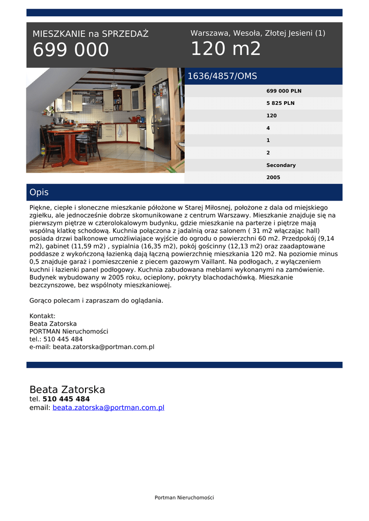 Warszawa, Wesoła, Złotej Jesieni (1) MIESZKANIE na SPRZEDAŻ 120 m2 699 000 1636/4857/OMS 699 000 PLN 5 825 PLN 120 4 1 2 Secondary 2005 Opis Piękne, ciepłe i słoneczne mieszkanie półożone w Starej Miłosnej, położone z dala od miejskiego zgiełku, ale jednocześnie dobrze skomunikowane z centrum Warszawy. Mieszkanie znajduje się na pierwszym piętrze w czterolokalowym budynku, gdzie mieszkanie na parterze i piętrze mają wspólną klatkę schodową. Kuchnia połączona z jadalnią oraz salonem ( 31 m2 włączając hall) posiada drzwi balkonowe umożliwiajace wyjście do ogrodu o powierzchni 60 m2. Przedpokój (9,14 m2), gabinet (11,59 m2) , sypialnia (16,35 m2), pokój gościnny (12,13 m2) oraz zaadaptowane poddasze z wykończoną łazienką dają łączną powierzchnię mieszkania 120 m2. Na poziomie minus 0,5 znajduje garaż i pomieszczenie z piecem gazowym Vaillant. Na podłogach, z wyłączeniem kuchni i łazienki panel podłogowy. Kuchnia zabudowana meblami wykonanymi na zamówienie. Budynek wybudowany w 2005 roku, ocieplony, pokryty blachodachówką. Mieszkanie bezczynszowe, bez wspólnoty mieszkaniowej. Gorąco polecam i zapraszam do oglądania. Kontakt: Beata Zatorska PORTMAN Nieruchomości tel.: 510 445 484 e-mail: [email protected] Beata Zatorska tel. 510 445 484 email: [email protected] Portman Nieruchomości Powered by TCPDF (www.tcpdf.org)