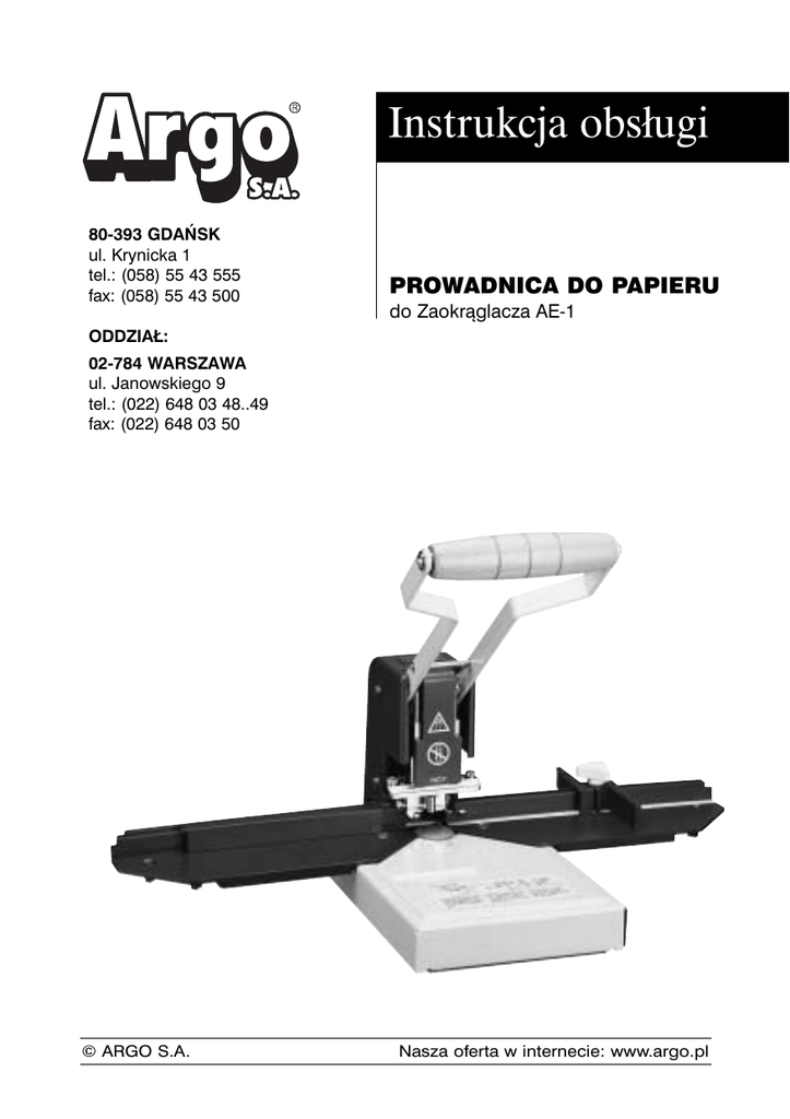 Instrukcja obsługi 80-393 GDAŃSK ul. Krynicka 1 tel.: (058) 55 43 555 fax: (058) 55 43 500 PROWADNICA DO PAPIERU do Zaokrąglacza AE-1 ODDZIAŁ: 02-784 WARSZAWA ul. Janowskiego 9 tel.: (022) 648 03 48..49 fax: (022) 648 03 50 © ARGO S.A. Nasza oferta w internecie: www.argo.pl PROWADNICA DO PAPIERU Prowadnica umożliwia rozszerzenie możliwości zaokrąglacza AE-1. Łatwy sposób montowania pozwala na precyzyjne wykonywanie półokrągłych otworów do zawieszek w kalendarzach oraz standardowych okrągłych otworów, pojedynczych lub podwójnych, o średnicy odpowiedniej do segregatorów. Uwaga: prowadnica wymaga zastosowania w zaokrąglaczu AE-1 odpowiednich noży. Nóż D21 do wycinania otworu na zawieszkę do kalendarza (promień 13/16'', 21 mm) Nóż D6 do wykonywania okrągłych otworów (średnica 1”, 6 mm) ELEMENTY 1. 2. 3. 4. 5. Lewy ogranicznik Lewa strona prowadnicy Prawa strona prowadnicy Śruba ogranicznika Regulowany prawy ogranicznik 6. Śrubki mocujące 7. Nakrętka 8. Podkładka SPOSÓB MONTAŻU PROWADNICY 1. Montowanie prowadnicy należy rozpocząć od odkręcenia śrubek imbusowych i zdjęcia ograniczników papieru znajdujących się z dwóch stron urządzenia. Następnie należy odkręcić znajdujące się obok ograniczników dwie zaślepiające śruby imbusowe. © ARGO S.A. Nasza oferta w internecie: www.argo.pl 2. Zainstaluj lewą (2) i prawą (3) stronę prowadnicy, mocując ją śrubkami (6) w miejscach osłoniętych wcześniej przez zaślepiające śruby imbusowe. 3. Półokrągły otwór: Zainstaluj lewy ogranicznik (1) zgodnie ze wskazaną na nim nazwą „semicircle“, na lewej stronie prowadnicy. Następnie zainstaluj prawy regulowany ogranicznik (5) zgodnie ze wskazaną na nim nazwą „semicircle“ na prawej stronie prowadnicy. Ustaw odpowiedni format papieru korzystając ze skali zablokuj ogranicznik dokręcając śrubę (4). Pamiętaj aby zastosować nóż D21. 4. Okrągły otwór: Zainstaluj lewy ogranicznik (1) zgodnie ze wskazaną na nim nazwą „hole“, na lewej stronie prowadnicy. Następnie zainstaluj prawy regulowany ogranicznik (5) zgodnie ze wskazaną na nim nazwą „hole“ na prawej stronie prowadnicy, korzystając ze śruby (4). Pamiętaj aby zastosować nóż D6. 5. W celu wykonania otworu centralnie np. w kartce formatu A4, należy przesunąć prawy ogranicznik i umocować go w miejscu oznaczonym na skali „A4“ z czerwonym trójkątem. Dokręć śrubę (4). © ARGO S.A. Nasza oferta w internecie: www.argo.pl 6.1 W celu wykonania 2 otworów np. W kartce formatu A4, należy przesunąć prawy regulowany ogranicznik na miejsce na skali oznaczone tylko czerwonym trójkątem. W tak ustalonej pozycji, dosuń kartkę do końca ogranicznika i wykonaj otwór. 6.2 Następnie przekręć kartkę papieru na druga stronę. 6.3 Dosuń kartkę do i wykonaj otwór. końca ogranicznika Uwaga! Aby ustawić format papieru A5 posługuj się kropkami umieszczonymi na skali. KONSERWACJA 1. Używaj miękkiej szmatki z wodą lub naturalnymi detergentami. 2. Nie używaj rozpuszczalnika czy benzyny. 3. Korzystając z prowadnicy nie używaj siły. © ARGO S.A. Nasza oferta w internecie: www.argo.pl