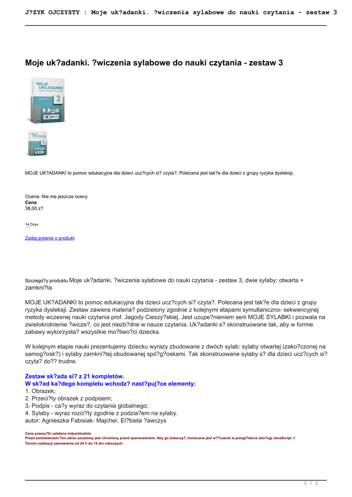 J?ZYK OJCZYSTY : Moje uk?adanki. ?wiczenia sylabowe do nauki czytania - zestaw 3 Moje uk?adanki. ?wiczenia sylabowe do nauki czytania - zestaw 3 MOJE UK?ADANKI to pomoc edukacyjna dla dzieci ucz?cych si? czyta?. Polecana jest tak?e dla dzieci z grupy ryzyka dysleksji. Ocena: Nie ma jeszcze oceny Cena 38,00 z? Zadaj pytanie o produkt Szczegó?y produktu Moje uk?adanki. ?wiczenia sylabowe do nauki czytania - zestaw 3, dwie sylaby: otwarta + zamkni?ta MOJE UK?ADANKI to pomoc edukacyjna dla dzieci ucz?cych si? czyta?. Polecana jest tak?e dla dzieci z grupy ryzyka dysleksji. Zestaw zawiera materia? podzielony zgodnie z kolejnymi etapami symultaniczno- sekwencyjnej metody wczesnej nauki czytania prof. Jagody Cieszy?skiej. Jest uzupe?nieniem serii MOJE SYLABKI i pozwala na zwielokrotnienie ?wicze?, co jest niezb?dne w nauce czytania. Uk?adanki s? skonstruowane tak, aby w formie zabawy wykorzysta? wszystkie mo?liwo?ci dziecka. W kolejnym etapie nauki prezentujemy dziecku wyrazy zbudowane z dwóch sylab: sylaby otwartej (zako?czonej na samog?osk?) i sylaby zamkni?tej obudowanej spó?g?oskami. Tak skonstruowane sylaby s? dla dzieci ucz?cych si? czyta? do?? trudne. Zestaw sk?ada si? z 21 kompletów. W sk?ad ka?dego kompletu wchodz? nast?puj?ce elementy: 1. Obrazek; 2. Przeci?ty obrazek z podpisem; 3. Podpis - ca?y wyraz do czytania globalnego; 4. Sylaby - wyraz rozci?ty zgodnie z podzia?em na sylaby. autor: Agnieszka Fabisiak- Majcher, El?bieta ?awczys Cena przesy?ki ustalana indywidualnie. Przed zamówieniem Ten adres pocztowy jest chroniony przed spamowaniem. Aby go zobaczy?, konieczne jest w??czenie w przegl?darce obs?ugi JavaScript. // Termin realizacji zamówienia od 24 h do 14 dni roboczych. 1 / 2 J?ZYK OJCZYSTY : Moje uk?adanki. ?wiczenia sylabowe do nauki czytania - zestaw 3 Opinie Nikt jeszcze nie ocenia? tego produktu. 2 / 2 Powered by TCPDF (www.tcpdf.org)