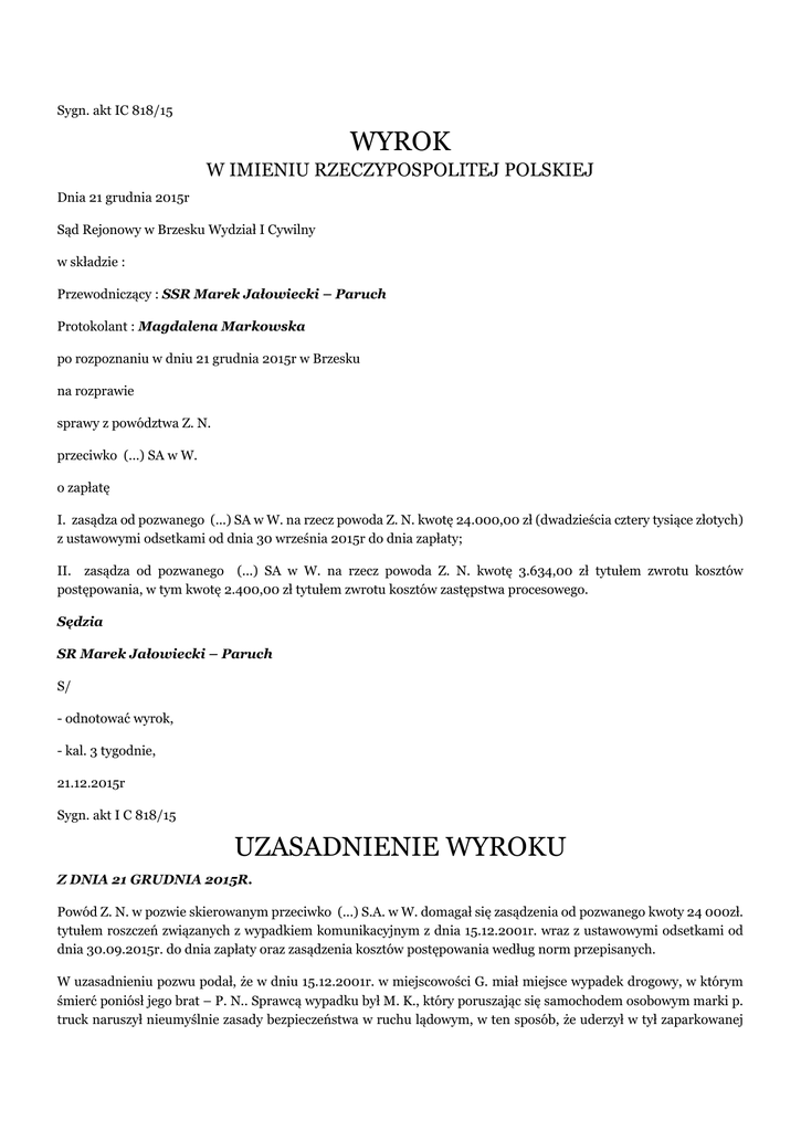 Sygn. akt IC 818/15 WYROK W IMIENIU RZECZYPOSPOLITEJ POLSKIEJ Dnia 21 grudnia 2015r Sąd Rejonowy w Brzesku Wydział I Cywilny w składzie : Przewodniczący : SSR Marek Jałowiecki – Paruch Protokolant : Magdalena Markowska po rozpoznaniu w dniu 21 grudnia 2015r w Brzesku na rozprawie sprawy z powództwa Z. N. przeciwko (...) SA w W. o zapłatę I. zasądza od pozwanego (...) SA w W. na rzecz powoda Z. N. kwotę 24.000,00 zł (dwadzieścia cztery tysiące złotych) z ustawowymi odsetkami od dnia 30 września 2015r do dnia zapłaty; II. zasądza od pozwanego (...) SA w W. na rzecz powoda Z. N. kwotę 3.634,00 zł tytułem zwrotu kosztów postępowania, w tym kwotę 2.400,00 zł tytułem zwrotu kosztów zastępstwa procesowego. Sędzia SR Marek Jałowiecki – Paruch S/ - odnotować wyrok, - kal. 3 tygodnie, 21.12.2015r Sygn. akt I C 818/15 UZASADNIENIE WYROKU Z DNIA 21 GRUDNIA 2015R. Powód Z. N. w pozwie skierowanym przeciwko (...) S.A. w W. domagał się zasądzenia od pozwanego kwoty 24 000zł. tytułem roszczeń związanych z wypadkiem komunikacyjnym z dnia 15.12.2001r. wraz z ustawowymi odsetkami od dnia 30.09.2015r. do dnia zapłaty oraz zasądzenia kosztów postępowania według norm przepisanych. W uzasadnieniu pozwu podał, że w dniu 15.12.2001r. w miejscowości G. miał miejsce wypadek drogowy, w którym śmierć poniósł jego brat – P. N.. Sprawcą wypadku był M. K., który poruszając się samochodem osobowym marki p. truck naruszył nieumyślnie zasady bezpieczeństwa w ruchu lądowym, w ten sposób, że uderzył w tył zaparkowanej naczepy i w wyniku tego zdarzenia śmierć poniósł kierowca M. K. i pasażer p. P. N.. Postanowieniem z dnia 23.03.2002r Komenda Powiatowa Policji w K. umorzyła postepowanie z powodu śmierci sprawcy. W zakresie obowiązkowego ubezpieczenia odpowiedzialności cywilnej, sprawca wypadku posiadał polisę w (...) S.A. w W., co czyni pozwanego zobowiązanym do naprawienia szkody. W związku z powyższym powód zwrócił się do pozwanego z roszczeniem o wypłatę stosownego zadośćuczynienia. Pozwany przyznał na rzecz powoda kwotę 6 000zł tytułem zadośćuczynienia za naruszenie dóbr osobistych. W odpowiedzi na pozew pozwany wniósł o oddalenie powództwa oraz zasądzenie kosztów postępowania według norm przepisanych. W uzasadnieniu podał, że bezspornym w sprawie jest to, że pozwany ponosi odpowiedzialność ubezpieczeniową z tytułu obowiązkowego ubezpieczenia odpowiedzialności cywilnej posiadaczy pojazdów mechanicznych oraz to, że pozwany prowadził postępowanie likwidacyjne w związku ze zgłoszonym roszczeniem. Pozwany wypłacił powodowi kwotę 6 000zł zadośćuczynienia za naruszenie dóbr osobistych powoda. Zarzucił, że od chwili zdarzenia w wyniku którego śmierć poniósł brat powoda upłynęło ponad 13 lat i rzeczywistym powodem wystąpienia z pozwem jest chęć poprawy sytuacji finansowej. Wysokość żądanego zadośćuczynienia przekracza możliwości przeciętnego ubezpieczonego i ubezpieczającego. Podniósł także że dochodzone pozwem roszczenie jest wygórowane, powód w wyniku wypadku nie stał się osobą samotną i śmierć brata nie wpłynęła na osłabienie jego aktywności życiowej lub rodzinnej. Sąd ustalił następujący stan faktyczny W dniu 15.12.2001r. w miejscowości G. doszło do wypadku drogowego, w którym śmierć poniósł brat powoda – P. N.. Sprawcą wypadku był M. K., który poruszając się samochodem osobowym p. truck, nie zachował należytej ostrożności i najechał na tył prawidłowo zaparkowanego zestawu składającego się z ciągnika siodłowego i naczepy. W wyniku najechania śmierć poniósł kierowca p. oraz pasażer P. N.. Przyczyna najechania na tył naczepy jest nieznana. Kierowca p. nie podejmował żadnych manewrów obronnych. Po zdarzeniu jego noga znajdowała się na pedale gazu. Dowód: postanowienie KPP w K. z 29.03.2002r sygn. akt 2DS.1257/02 o umorzeniu postępowania k.38 i 39 akt likwidacji szkody (...) W zakresie obowiązkowego ubezpieczenia odpowiedzialności cywilnej, sprawca wypadku posiadał polisę w (...) S.A. w W.. W związku z powyższym powód pismem z dnia 08.09.2015r. zwrócił się do pozwanego z roszczeniem o wypłatę zadośćuczynienia w wysokości 40.000,00 zł. Ubezpieczyciel wypłacił Z. N. kwotę 6.000,00 zł tytułem zadośćuczynienia, decyzją z 29.09.2015r. Dowód:, zgłoszenie szkody osobowej z dnia 08.09.2015r. – akta szkody nr (...) k.24, zawiadomienie o przyznaniu oraz wypłacie zadośćuczynienia k. 19 akt (...) P. N. przed śmiercią mieszkał w jednym domu razem z powodem i matką. Około 5, 6 lat przed śmiercią P. N. zmarł ich ojciec. Powód z P. N. miał dobre relacje, razem chodzili na dyskoteki, razem spędzali święta, wakacje. P. N. dawał pieniądze bratu, kupował mu prezenty. Powód ciężko przeżył śmierć brata, płakał po jego śmierci, do chwili obecnej przeżywa śmierć brata, odwiedza jego grób co niedzielę. Z. N. jest żonaty ma trójkę dzieci. Ożenił się w 2003r. P. N. przed śmiercią pracował w Niemczech. Dowód: zeznania świadka Z. K. k. 33, częściowo powoda Z. N. k. 33 P. N. był jedynym bratem powoda. W chwili jego śmierci powód miał 22 lata, zmarły brat był starszy od niego o 6 lat. P. N. był kawalerem. Po śmierci brata powód leczy się u neurologa. Przyjmuje lekarstwa neurol i aureks. Czasami czuje się dobrze, ale odczuwa nawroty choroby. Odczuwa blokadę nóg na tle nerwowym. Pracuje jako stolarz. Po śmierci ojca, zmarły P. N. był odpowiedzialny za utrzymanie rodziny. Dowód: zeznania powoda Z. N. k. 33 Powyższych ustaleń faktycznych Sąd dokonał na podstawie wyżej wymienionych dokumentów, zeznań świadka oraz powoda. Dokumenty te nie były kwestionowane przez strony, nie budziły wątpliwości Sądu co do swojej autentyczności, zatem zasługują na wiarę. Postanowienie o umorzeniu ma status dokumentu urzędowego w rozumieniu art. 244 kpc i stanowi dow