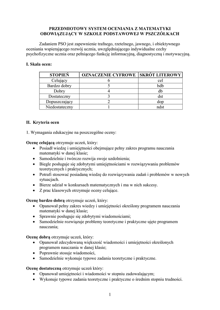 PRZEDMIOTOWY SYSTEM OCENIANIA Z MATEMATYKI OBOWIĄZUJĄCY W SZKOLE PODSTAWOWEJ W PSZCZÓŁKACH Zadaniem PSO jest zapewnienie trafnego, rzetelnego, jawnego, i obiektywnego oceniania wspierającego rozwój ucznia, uwzględniającego indywidualne cechy psychofizyczne ucznia oraz pełniącego funkcję informacyjną, diagnostyczną i motywacyjną. I. Skala ocen: STOPIEŃ Celujący Bardzo dobry Dobry Dostateczny Dopuszczający Niedostateczny OZNACZENIE CYFROWE SKRÓT LITEROWY 6 cel 5 bdb 4 db 3 dst 2 dop 1 ndst II. Kryteria ocen 1. Wymagania edukacyjne na poszczególne oceny: Ocenę celującą otrzymuje uczeń, który: Posiadł wiedzę i umiejętności obejmujące pełny zakres programu nauczania matematyki w danej klasie; Samodzielnie i twórczo rozwija swoje uzdolnienia; Biegle posługuje się zdobytymi umiejętnościami w rozwiązywaniu problemów teoretycznych i praktycznych; Potrafi stosować posiadaną wiedzę do rozwiązywania zadań i problemów w nowych sytuacjach. Bierze udział w konkursach matematycznych i ma w nich sukcesy. Z prac klasowych otrzymuje oceny celujące. Ocenę bardzo dobrą otrzymuje uczeń, który: Opanował pełny zakres wiedzy i umiejętności określony programem nauczania matematyki w danej klasie; Sprawnie posługuje się zdobytymi wiadomościami; Samodzielnie rozwiązuje problemy teoretyczne i praktyczne ujęte programem nauczania; Ocenę dobrą otrzymuje uczeń, który: Opanował zdecydowaną większość wiadomości i umiejętności określonych programem nauczania w danej klasie; Poprawnie stosuje wiadomości, Samodzielnie wykonuje typowe zadania teoretyczne i praktyczne. Ocenę dostateczną otrzymuje uczeń który: Opanował umiejętności i wiadomości w stopniu zadowalającym; Wykonuje typowe zadania teoretyczne i praktyczne o średnim stopniu trudności. 1 Ocenę dopuszczającą otrzymuje uczeń, który: Ma braki w opanowaniu programu, ale te braki nie przekraczają możliwości uzyskania przez ucznia podstawowej wiedzy z matematyki w ciągu dalszej nauki; Rozwiązuje zadania teoretyczne i praktyczne o niewielkim stopniu trudności. Ocenę niedostateczną otrzymuje uczeń, który: Nie opanował wiadomości i umiejętności określonych programem nauczania matematyki w danej klasie, a braki w wiadomościach i umiejętnościach nie pozwalają na dalsze zdobywanie wiedzy z tego przedmiotu; Nie jest w stanie wykonać zadań o niewielkim stopniu trudności. III. Formy sprawdzania i oceniania bieżącego wiedzy i umiejętności uczniów. 1. Nauczyciel na lekcjach matematyki może stosować następujące formy sprawdzania wiedzy i umiejętności ucznia: a) odpowiedzi ustne (m.in. udział w dyskusji, dialog, argumentowanie, wnioskowanie) b) prace pisemne w klasie: kartkówka dotyczy 3 ostatnich tematów zagadnień; bez zapowiedzi; czas trwania do 20 minut; sprawdzian zapowiedziany na 1- 3 dni wcześniej przed terminem, czas trwania do 30 minut; praca klasowa, zapowiedziana z tygodniowym wyprzedzeniem, poprzedzona wpisem do dziennika; czas trwania 1 godzina lekcyjna. testy różnego typu(otwarty, wyboru, zamknięty, problemowy, zadaniowy), zapowiedziany z kilkudniowym wyprzedzeniem, sprawdzający znajomość treści problemowych etapami; czas trwania do 60 minut. ( W klasie szóstej bez zapowiedzi). prace domowe: ćwiczenia, notatki, c) aktywność na lekcji: częste zgłaszanie się w czasie lekcji i udzielanie poprawnych odpowiedzi; rozwiązywanie zadań dodatkowych na lekcji, d) aktywność pozalekcyjna: a) rozwiązywanie zadań dodatkowych, b) udział w konkursach matematycznych, c) systematyczny udział w zajęciach koła matematycznego – klasy szóste. 2. Liczba i częstotliwość pomiarów jest zależna od realizowanego programu nauczania oraz liczby godzin w danej klasie. 3.Prace klasowe, sprawdziany, odpowiedzi ustne i prace domowe są obowiązkowe. 4. Uczeń nieobecny na pracy klasowej, teście ma obowiązek ją zaliczyć w czasie 1 tygodnia licząc od dnia powrotu z nieobecności. 5. Nauczyciel ma obowiązek zwrócić sprawdzone prace klasowe, sprawdziany, testy i kartkówki w terminie do dwóch tygodni roboczych. 2 6. Przy ocenianiu stosuje się następujący przelicznik procentowy -ocena niedostateczna – 0% do 30% -ocena dopuszczająca – 31% do 49% -ocena dostateczna – 50% do 74% -ocena dobra – 75% do 87% -ocena bardzo dobra – 88% do 94% -ocena celująca – 95% do 100% 7. Uczeń ma prawo do dwukrotnego zgłoszenia nieprzygotowania do lekcji w ciągu semestru, jest to odnotowane w dzienniku lekcyjnym w/w symbolem. 8. Częste nieprzygotowanie (powyżej 2 razy) jest traktowane jako brak wiadomości z danego zakresu i podlega ocenie niedostatecznej. 9. Przez nieprzygotowanie do lekcji rozumiemy: brak pracy domowej, nieprzygotowanie do odpowiedzi zajęć – brak zeszytu, ćwiczeń, przyborów.. 10. Aktywność na lekcji jest traktowana jako prezentacja umiejętności i wiedzy ucznia i podlega ocenie. 11. Za niesamodzielną pracę podczas pomiaru wiedzy i umiejętności uczeń otrzymuje ocenę niedostateczną. IV. Kryteria oceniania prac pisemnych z matematyki. 1. Aby zachować maksymalną obiektywność oceny prac pisemnych nauczyciel: stosuje punktację za wybór poprawnej metody rozwiązania i konsekwencję w jej stosowaniu oraz poprawność wyniku, w razie wątpliwości, co do prawidłowości rozumowania ucznia, nauczyciel przeprowadza rozmowę w celu ich wyjaśnienia, uzależnia ostateczną ocenę nie tylko od liczby zdobytych punktów, ale również od ilości rozwiązanych w pełni zadań. V. Formy poprawy oceny niedostatecznej przez uczniów 1. Poprawie podlegają prace klasowe. 2. Uczeń ma prawo do poprawy otrzymanej z pracy klasowej oceny niedostatecznej w terminie tygodnia od jej otrzymania. 3. Ocena otrzymana z poprawy jest wpisywana do dziennika obok wcześniej otrzymanej oceny niedostatecznej. 4. Kartkówki, odpowiedzi ustne, prace domowe nie podlegają poprawie. 3 V. Umowa w sprawie nie przygotowania się ucznia do zajęć. 1