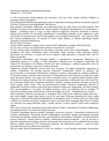 Sterowanie populacją i eksploatacja populacji Wykład 11 / 12-01-2012 71-78% powierzchni Ziemi pokryta jest morzami, więc być może zasoby morskie (białko) są znacznie większe niż lądowe. Kryl (kilkanaście-kilkadziesiąt gatunków) stanowi największą biomasę pośród wszystkich żyjących na Ziemi. Przekracza prawdopodobnie 700 mln ton. Inny gatunek, morskiego widłonoga, jest rozprzestrzeniony po całej Ziemi, jest najliczniejszy. Oba próbuje się intensywnie eksploatować. Morza jednak są skrajnie nieproduktywne w porównaniu z lądami – produkują tylko 1/3 tego co lądy. Znaczna większość obszarów morskich to obszary praktycznie pustynne. W obszarach subpolarnych i upwellingu (chłodne, żyzne, głębinowe wody wynoszone na wierzch przez szelf kontynentalny, przy brzegach kontynentów – np. Ameryki Płd.) jest wyższa produktywność. W sezonie El Nino wiatry słabną, co hamuje upwelling między Australią a Ameryką Południową. Roczny zbiór żywności: oceany 0,004; najmniej wydajne tereny rolnicze 0,02; najbardziej wydajne 100 (GJ/ha/rok) nie ma więc co liczyć na zaspokojenie potrzeb żywieniowych z oceanów. W toni wodnej prawo grawitacji ma niewielkie znaczenie wobec praw hydrodynamiki – ciążenie zastąpione jest przez turbulentny opór środowiska. Duże rozmiary ciała ułatwiają szybkie poruszanie się zwierząt w wodzie (ale nie na lądzie!). Stąd największe zwierzęta które żyły na Ziemi są morskie. Najmniejszy turbulentny opór stawiają obiekty o największych rozmiarach. Bakteriom jest najtrudniej pływać. Co wynika z liczby Reynoldsa, zależnej m.in. od długości organizmu. Im większa lb. Reynoldsa (i im dłuższy obiekt) tym opór wynikający z adhezji cząsteczek wody do powierzchni ma mniejsze znaczenie, mniej go hamuje. Organizmy morskie drapieżne muszą mieć duże rozmiary. Na lądach największe organizmy to rośliny, roślinożercy też bywają sporych rozmiarów. Drapieżniki zwykle są mniejsze lub porównywalne z rozmiarami roślinożerców. Mniejsze rozmiary zapewniają im większą mobilność. W morzach rośliny są bardzo małe (większość to fitoplankton) bo nie mają się do czego przyczepić poza obszarem litoralu, nie mogą więc mieć rozmiarów drzew. W morzach każde kolejne piętro troficzne ma większe rozmiary. Jest też znacznie więcej poziomów troficznych (np. rekin może być na 6 poziomie troficznym). Każdemu transferowi energii z jednego poziomu na drugi towarzyszą straty energii (tylko około 10% jest przekazywana dalej). Człowiek eksploatuje głównie te drapieżniki wyższych rzędów troficznych poza rekinami (najwyższy drapieżnik), ale dużo rekinów łowi się przypadkowo i też giną. Na lądach możemy żywić się roślinami, jest to wydajne. W oceanach nie praktycznie roślin którymi człowiek mógłby się żywić – fitoplankton jest za mały. Skoro struktura troficzna jest jaka jest w oceanach, skoro rekin może upolować każdą inną rybę taki rekin mógłby ścigać jedną ławicę ryb aż by całą zjadł. Dlaczego jakiekolwiek ofiary nadal mogą żyć w morzach? Powód prawdopodobnie to dostępność tlenu w wodzie, która jest dość niska i maleje ze wzrostem zasolenia i temperatury. Duże zwierzęta łatwo zaciągają dług tlenowy. Rekiny czy tuńczyki nie mogą dowolnie dużo i szybko pływać. Ławica małych rybek może zamęczyć rekina. Duże ryby muszą mieć ogromną powierzchnię skrzeli. Jeden z największych rekinów, długoszpar, jest planktonożerny. Nie może się szybko poruszać. Człowiek eksploatuje głównie gatunki zajmujące szczytowe pozycje w łańcuchach pokarmowych (wielkie drapieżniki). Ubywanie dużych drapieżników powoduje spadek przeciętnego poziomu troficznego do jakiego należą złowione ryby. Każdemu złowionemu osobnikowi można przypisać poziom troficzny i potem policzyć średnią. Fishing-down-marine-foodwebs – tak się nazywa to zjawisko obniżania przeciętnego poziomu troficznego złowionej ryby, jest to ogólnoświatowy trend. Połowy sardeli stanowiły 15% światowych połowów, ale intensywne połowy + sezon El Nino spowodował prawie jej całkowite wyginięcie. Jak jest mniej dużych drapieżników to łowi się mniejsze, co jest bardziej racjonalne teoretycznie (wydajniejsze energetycznie), ale nie jest to zaplanowana gospodarka, tylko przymus wynikający z tego, że dużych ryb jest coraz mniej – z czego jednak wiele to ofiary tzw. zjawiska przyłowu, czyli przypadkowego łowienia np. rekinów. Rekiny mają zaś znaczącą strukturotwórczą rolę w ekosystemach morskich. Brak kontroli z ich strony czasami się dostrzega, np. gdzieniegdzie rosną mocno populacje fok szarych, co ma negatywne konsekwencje dla ryb którymi się żywią a które są też łowione przez rybaków, i ich populacje bardzo się zmniejszają. W Bałtyku szczytowym drapieżcą pelagicznym był i powinien być dorsz. Eliminacja dorsza jak się uważa doprowadziła do tego, że Bałtyk się eutrofizuje – wzrost ilość sardynek i szprota – zooplanktonożerców. Przez co rozrasta się fitoplankton. Coraz więcej jest też różnych meduz i żebropławów, bo mniejszą mają konkurencję, a one same nie są przez nic zjadane („ślepy zaułek energetyczny”). Drapieżniki odżywiają się ofiarami gatunków o chwilowo największych liczebnościach. Ofiary z populacji rzadkich są ignorowane (switching). O wyborze gatunków eksploatowanych przez człowieka decydują względy ekonomiczne a nie ekologiczne. Peru miało kiedyś ogromną flotę rybacką i łowiło sardelę, którą zresztą się głównie przerabiało na paszę. To była podstawa gospodarki. Kiedy połowy zaczęły maleć, sypała się gospodarka, a zamiast zmniejszyć połowy, łowiło się je jeszcze bardziej – a więc przeciwnie do naturalnych drapieżników. Dorsz, kiedyś był bardzo tani i dostępny, zredukowało to bardzo jego liczebność (około 10 krotnie od lat 5