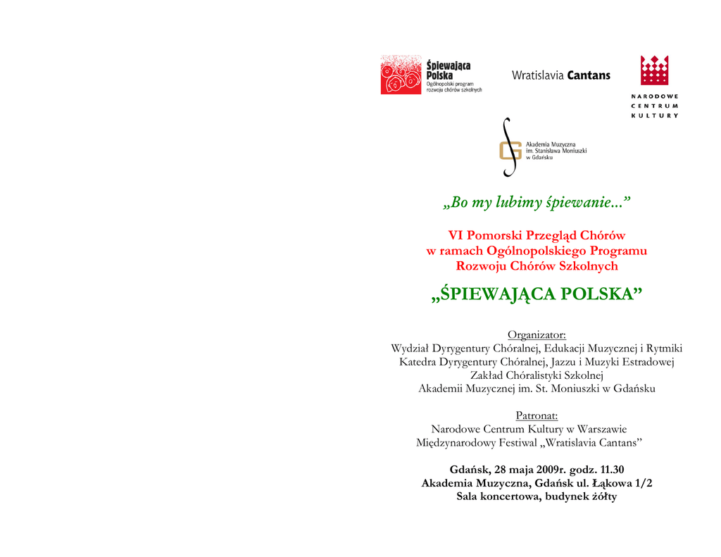 „Bo my lubimy śpiewanie...” VI Pomorski Przegląd Chórów w ramach Ogólnopolskiego Programu Rozwoju Chórów Szkolnych „ŚPIEWAJĄCA POLSKA” Organizator: Wydział Dyrygentury Chóralnej, Edukacji Muzycznej i Rytmiki Katedra Dyrygentury Chóralnej, Jazzu i Muzyki Estradowej Zakład Chóralistyki Szkolnej Akademii Muzycznej im. St. Moniuszki w Gdańsku Patronat: Narodowe Centrum Kultury w Warszawie Międzynarodowy Festiwal „Wratislavia Cantans” Gdańsk, 28 maja 2009r. godz. 11.30 Akademia Muzyczna, Gdańsk ul. Łąkowa 1/2 Sala koncertowa, budynek Ŝółty Skład JURY VI Pomorskiego Przeglądu Chórów „Śpiewająca Polska” prof. AM Marcin Tomczak Prorektor Akademii Muzycznej w Gdańsku prof. AM dr hab.Waldemar Górski Dziekan Wydziału IV Akademii Muzycznej w Gdańsku prof. Anna Fiebig Kierownik Zakładu Emisji Głosu Wydziału IV Akademii Muzycznej w Gdańsku asyst. Michał Kozorys – sekretarz JURY Organizacja: asyst. Michał Kozorys kierownictwo merytoryczne i organizacyjne Justyna Pobłocka prowadzenie studenci: Marianna Klauza Kacper Kłosiński Janina Stobierska JuŜ po raz szósty spotykamy się w gościnnych progach Akademii Muzycznej w Gdańsku, by z radością wysłuchać chórów biorących udział w Pomorskim Przeglądzie Chórów „Śpiewająca Polska”. „Śpiewająca Polska” to program skierowany do dzieci i młodzieŜy, by przez śpiew mogli radować się Ŝyciem, doświadczać bogactwa muzyki, czerpać satysfakcję ze wspólnego śpiewania; by przez przyjemnie spędzony czas uczyli się wewnętrznej dyscypliny, otwierali na świat kultury. Narodowe Centrum Kultury zarządza programem przy pomocy partnera, jakim jest Festiwal „Wratislavia Cantans”. Festiwal sprawuje opiekę metodyczną i merytoryczną dzięki zespołowi koordynatorów regionalnych pod kierunkiem GraŜyny Rogali-Szczerek, koordynatora ogólnopolskiego. W regionie pomorskim koordynacją wszelkich form dokształcania oraz organizacją seminariów metodyczno-warsztatowych zajmuje się asystent Michał Kozorys, wykładowca na Wydziale Dyrygentury Chóralnej, Edukacji Muzycznej i Rytmiki Akademii Muzycznej w Gdańsku. Program „Śpiewająca Polska” pozyskuje patronat i wsparcie instytucji artystycznych. Stałą opiekę nad przedsięwzięciem sprawuje Katedra Dyrygentury Chóralnej, Jazzu i Muzyki Estradowej oraz Zakład Chóralistyki Szkolnej Akademii Muzycznej w Gdańsku kierowany przez prof. AM dr hab. Waldemara Górskiego, dziekana Wydziału IV. Podsumowaniem niech będą słowa Hymnu Śpiewającej Polski: „bo my lubimy śpiewanie........” PROGRAM VI Pomorskiego Przeglądu Chórów „Śpiewająca Polska” Koncert Chóru Kameralnego 441 Hz dyrygent – Anna Borkowicz Karolina Wiśniewska Hymn Śpiewającej Polski Okruchy słońca muz. Michał Sulej, sł. Wincenty Faber w wykonaniu wszystkich chórów biorących udział w VI Pomorskim Przeglądzie Chórów Ogłoszenie wyników VI Pomorskiego Przeglądu Chórów „Śpiewająca Polska” Wręczenie dyplomów i pucharów dyrygent – Michał Kozorys akompaniament – Kacper Kłosiński PROGRAM PRZESŁUCHAŃ KONKURSOWYCH 1. Chór Szkoły Podstawowej w Kłodawie dyrygent – Krzysztof Rek „Wesoła gama C-dur” „Chodź, pomaluj mój świat” z rep. zespołu „2+1” „Tak bardzo się starałem” z rep. zespołu „Czerwone gitary” 2. Chór Szkoły Podstawowej nr 20 w Gdyni dyrygent – Joanna Polak „Bo po to morze jest” z repertuaru zespołu szantowego „Arfik” „Hej, w zielenym gaiku” – kanon „Geografia na wesoło” 3. Chór Szkoły Podstawowej nr 14 im. Ks. G. Piramowicza w Gdańsku dyrygent – Ilona Orzechowska „Jesteśmy dziećmi ziemi” – oprac. GraŜyna Orlińska „Nadzieja” – oprac. M. Ziąber „Piosenka drewnianych lalek” – oprac. C. Domagała „Hymn Szkoły im. Ks. Jana Twardowskiego w BoŜympolu Wielkim” sł. i muz. ks. Filip Krauze 4. Chór Dziecięcy Szkoły Podstawowej nr 40 w Gdyni dyrygent – Jolanta Karge akompaniament – Anna Miotk „Sum” – A. Dzwolak „Do re mi fa sol” – kanon „Nieście chwałę mocarze” – Mikołaj Gomólka – Psalm 29 opr. P. Piątek 5. Chór Publicznego Gimnazjum im. Morskiego Dywizjonu Lotniczego w Pucku dyrygent – Maja Muza-Kwarta akompaniament – Krystian Formella „Gaude Mater Polonia” – Wincenty z Kielc „Jak promień słońca” – muz. Piotr Kaja, sł. Tadeusz Szarwaryn „Bieszczady” – muz. i sł. Andrzej Starzec 8. Chór I Gdańskiego Liceum Katolickiego im. św. Wojciecha w Gdańsku dyrygent – Aleksandra Świątek akompaniament – Ewa Rytel „Nobody knows the trouble” – Murzyńska pieśń ludowa – opracowanie własne „Hallelujah praise the Lord” – opracowanie własne „When the Saints Go Marchin’ In” – opracowanie na 2 głosy Ŝeńskie aranŜacja: Jeff Guillen 9. Chór „Scherzi Musicali” z XIX Liceum Ogólnokształcącego im. M. Mokwy w Gdańsku dyrygent – Daria Polanowska „Agnus Dei” „I get around” „Bystra wodicka” – muz. E. Bury 6. Szkolny Chór Zespołu Kształcenia i Wychowania Publicznej Szkoły Podstawowej i Gimnazjum w Pinczynie dyrygent – Wojciech Gdaniec „Prosimy was o uśmiech” – muz. Adam Markowicz sł. Wanda Chotomska oprac. W. Gdaniec „Awantura-wielka bzdura” – muz. Zbigniew Ciechan sł.Anna Bernat opr. W. Gdaniec „A ten psotnik wiatr” – muz. Jan Maklakiewicz sł. M. A. Kasprzycka „Zaloty dziewczęcia i chłopaka” – kociewska melodia ludowa oprac. W. Gdaniec 7. Chór „Bel canto” Szkoły Podstawowej i Gimnazjum w BoŜympolu dyrygent – Aleksandra Ropela „Kolibiónka dla Jezusa” – sł. i muz. Tomasz Fopke „Będę śpiewał tobie” 10. Chór Liceum Ogólnokształcącego im. A. Mickiewicza w Miastku dyrygent – Katarzyna Bąk „Święty, święty, święty” – H. M. Górecki „Święty Duchu przyjdź” – M. Leśniewska „Swing low sweet Chariot” – opr. W. Sołtysik