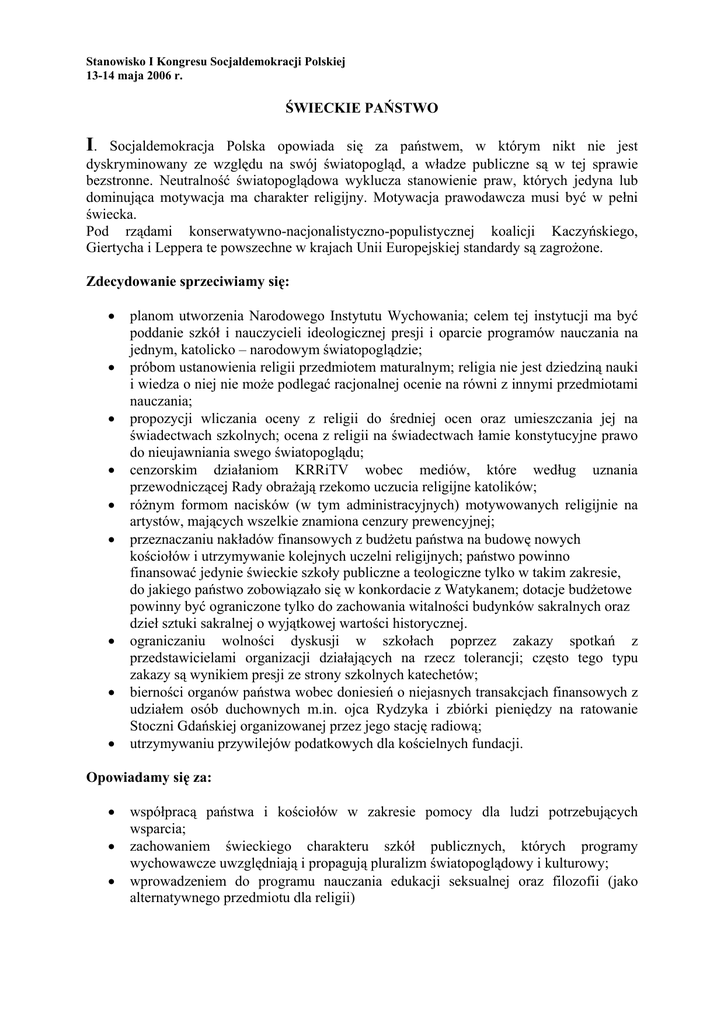 Stanowisko I Kongresu Socjaldemokracji Polskiej 13-14 maja 2006 r. ŚWIECKIE PAŃSTWO I. Socjaldemokracja Polska opowiada się za państwem, w którym nikt nie jest dyskryminowany ze względu na swój światopogląd, a władze publiczne są w tej sprawie bezstronne. Neutralność światopoglądowa wyklucza stanowienie praw, których jedyna lub dominująca motywacja ma charakter religijny. Motywacja prawodawcza musi być w pełni świecka. Pod rządami konserwatywno-nacjonalistyczno-populistycznej koalicji Kaczyńskiego, Giertycha i Leppera te powszechne w krajach Unii Europejskiej standardy są zagrożone. Zdecydowanie sprzeciwiamy się: • • • • • • • • • planom utworzenia Narodowego Instytutu Wychowania; celem tej instytucji ma być poddanie szkół i nauczycieli ideologicznej presji i oparcie programów nauczania na jednym, katolicko – narodowym światopoglądzie; próbom ustanowienia religii przedmiotem maturalnym; religia nie jest dziedziną nauki i wiedza o niej nie może podlegać racjonalnej ocenie na równi z innymi przedmiotami nauczania; propozycji wliczania oceny z religii do średniej ocen oraz umieszczania jej na świadectwach szkolnych; ocena z religii na świadectwach łamie konstytucyjne prawo do nieujawniania swego światopoglądu; cenzorskim działaniom KRRiTV wobec mediów, które według uznania przewodniczącej Rady obrażają rzekomo uczucia religijne katolików; różnym formom nacisków (w tym administracyjnych) motywowanych religijnie na artystów, mających wszelkie znamiona cenzury prewencyjnej; przeznaczaniu nakładów finansowych z budżetu państwa na budowę nowych kościołów i utrzymywanie kolejnych uczelni religijnych; państwo powinno finansować jedynie świeckie szkoły publiczne a teologiczne tylko w takim zakresie, do jakiego państwo zobowiązało się w konkordacie z Watykanem; dotacje budżetowe powinny być ograniczone tylko do zachowania witalności budynków sakralnych oraz dzieł sztuki sakralnej o wyjątkowej wartości historycznej. ograniczaniu wolności dyskusji w szkołach poprzez zakazy spotkań z przedstawicielami organizacji działających na rzecz tolerancji; często tego typu zakazy są wynikiem presji ze strony szkolnych katechetów; bierności organów państwa wobec doniesień o niejasnych transakcjach finansowych z udziałem osób duchownych m.in. ojca Rydzyka i zbiórki pieniędzy na ratowanie Stoczni Gdańskiej organizowanej przez jego stację radiową; utrzymywaniu przywilejów podatkowych dla kościelnych fundacji. Opowiadamy się za: • • • współpracą państwa i kościołów w zakresie pomocy dla ludzi potrzebujących wsparcia; zachowaniem świeckiego charakteru szkół publicznych, których programy wychowawcze uwzględniają i propagują pluralizm światopoglądowy i kulturowy; wprowadzeniem do programu nauczania edukacji seksualnej oraz filozofii (jako alternatywnego przedmiotu dla religii) • prawem kobiety do świadomego macierzyństwa, co wiąże się zarówno z prawem do aborcji, jak i współfinansowaniem przez państwo zapłodnień in vitro. • zachowaniem całkowitej bezstronności światopoglądowej instytucji państwowych; niedopuszczalne jest umieszczanie symboli religijnych w urzędach i sądach (jak np. w sądzie na warszawskiej Pradze), które rozpatrują różne spory dotyczące obywateli i rozstrzygają o ich prawach i obowiązkach. II. Konstytucja RP stanowi w swej preambule, że nasz kraj jest wspólnym domem „Narodu Polskiego – wszystkich obywateli Rzeczypospolitej”. Ta konstytucyjna formuła wskazuje, że państwo opiera się na politycznej wspólnocie wszystkich obywateli – niezależnie od ich etnicznego pochodzenia czy wyznawanej religii. Rządząca Polską prawica podważa konstytucyjne gwarancje neutralności światopoglądowej państwa. Z projektu Konstytucji IV RP Prawa i Sprawiedliwości wynika, że polityczna wspólnota obywateli ma być zastąpiona wspólnotą opartą na więzi etniczno – religijnej. Państwo według PiS nie respektuje różnorodności światopoglądów, postaw i katalogów moralnych, a także nie uznaje ich za równoprawne. W Polsce braci Kaczyńskich, Giertycha i Leppera światopogląd katolicki ma charakter dominujący, a w jego krzewienie zaangażowane są instytucje państwowe.. Dziś lewica – przy ideologicznej ofensywie radykalnej prawicy i milczącym przyzwoleniu na klerykalizację państwa Platformy Obywatelskiej – musi bronić tych standardów. III. Socjaldemokracja Polska chce budować pluralistyczne społeczeństwo, w którym jest miejsce na rozmaite światopoglądy, wyznania i kultury, a państwo jest zobowiązane tę różnorodność respektować i chronić tak, aby każdy obywatel Rzeczypospolitej – niezależnie od wyznawanych przez siebie poglądów czuł się pełnoprawnym członkiem wspólnoty.