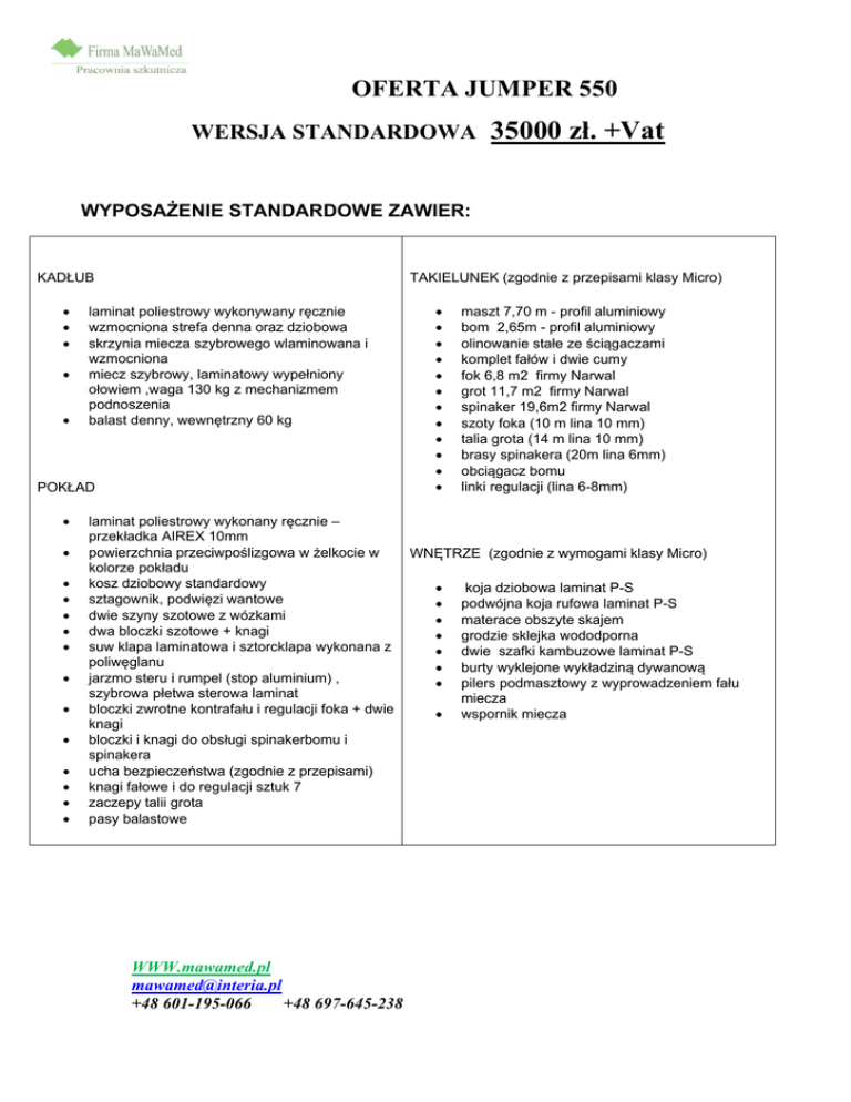 OFERTA JUMPER 550 WERSJA STANDARDOWA 35000 zł. +Vat WYPOSAŻENIE STANDARDOWE ZAWIER: KADŁUB TAKIELUNEK (zgodnie z przepisami klasy Micro) laminat poliestrowy wykonywany ręcznie wzmocniona strefa denna oraz dziobowa skrzynia miecza szybrowego wlaminowana i wzmocniona miecz szybrowy, laminatowy wypełniony ołowiem ,waga 130 kg z mechanizmem podnoszenia balast denny, wewnętrzny 60 kg POKŁAD laminat poliestrowy wykonany ręcznie – przekładka AIREX 10mm powierzchnia przeciwpoślizgowa w żelkocie w kolorze pokładu kosz dziobowy standardowy sztagownik, podwięzi wantowe dwie szyny szotowe z wózkami dwa bloczki szotowe + knagi suw klapa laminatowa i sztorcklapa wykonana z poliwęglanu jarzmo steru i rumpel (stop aluminium) , szybrowa płetwa sterowa laminat bloczki zwrotne kontrafału i regulacji foka + dwie knagi bloczki i knagi do obsługi spinakerbomu i spinakera ucha bezpieczeństwa (zgodnie z przepisami) knagi fałowe i do regulacji sztuk 7 zaczepy talii grota pasy balastowe WWW.mawamed.pl [email protected] +48 601-195-066 +48 697-645-238 maszt 7,70 m - profil aluminiowy bom 2,65m - profil aluminiowy olinowanie stałe ze ściągaczami komplet fałów i dwie cumy fok 6,8 m2 firmy Narwal grot 11,7 m2 firmy Narwal spinaker 19,6m2 firmy Narwal szoty foka (10 m lina 10 mm) talia grota (14 m lina 10 mm) brasy spinakera (20m lina 6mm) obciągacz bomu linki regulacji (lina 6-8mm) WNĘTRZE (zgodnie z wymogami klasy Micro) koja dziobowa laminat P-S podwójna koja rufowa laminat P-S materace obszyte skajem grodzie sklejka wododporna dwie szafki kambuzowe laminat P-S burty wyklejone wykładziną dywanową pilers podmasztowy z wyprowadzeniem fału miecza wspornik miecza