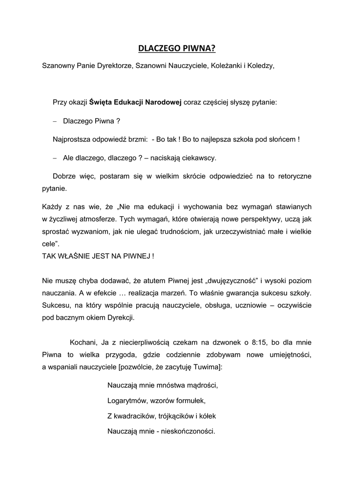 DLACZEGO PIWNA? Szanowny Panie Dyrektorze, Szanowni Nauczyciele, Koleżanki i Koledzy, Przy okazji Święta Edukacji Narodowej coraz częściej słyszę pytanie: Dlaczego Piwna ? Najprostsza odpowiedź brzmi: - Bo tak ! Bo to najlepsza szkoła pod słońcem ! Ale dlaczego, dlaczego ? – naciskają ciekawscy. Dobrze więc, postaram się w wielkim skrócie odpowiedzieć na to retoryczne pytanie. Każdy z nas wie, że „Nie ma edukacji i wychowania bez wymagań stawianych w życzliwej atmosferze. Tych wymagań, które otwierają nowe perspektywy, uczą jak sprostać wyzwaniom, jak nie ulegać trudnościom, jak urzeczywistniać małe i wielkie cele”. TAK WŁAŚNIE JEST NA PIWNEJ ! Nie muszę chyba dodawać, że atutem Piwnej jest „dwujęzyczność” i wysoki poziom nauczania. A w efekcie … realizacja marzeń. To właśnie gwarancja sukcesu szkoły. Sukcesu, na który wspólnie pracują nauczyciele, obsługa, uczniowie – oczywiście pod bacznym okiem Dyrekcji. Kochani, Ja z niecierpliwością czekam na dzwonek o 8:15, bo dla mnie Piwna to wielka przygoda, gdzie codziennie zdobywam nowe umiejętności, a wspaniali nauczyciele [pozwólcie, że zacytuję Tuwima]: Nauczają mnie mnóstwa mądrości, Logarytmów, wzorów formułek, Z kwadracików, trójkącików i kółek Nauczają mnie - nieskończoności. Wisława Szymborska napisała, że żyjemy dłużej, ale krótszymi zdaniami, i w tym życiowym zamieszaniu, poplątaniu, pogubieniu, właśnie oni pokazują nam właściwy kierunek, wartość słowa mówionego i pisanego. Piwna to miejsce, gdzie spędzam prawie połowę każdego dnia, jest ona moim drugim domem, a nauczyciele zastępują rodziców. I uwierzcie mi – NIE JEST TU CAŁY CZAS POWAŻNIE, wszakże: Gdyby do szkoły chodziły anioły, nie wiem, jakie stawiano by stopnie. Tyle tylko, że przerwa (…) wyglądałaby całkiem okropnie”. To tutaj zrodziły się pierwsze przyjaźnie, które mam nadzieję przetrwają po opuszczeniu murów szkoły. To tutaj mam przyjaciół, na których mogę liczyć, razem się śmiejemy i razem płaczemy. Dlaczego więc Piwna?, ulica która ma zaledwie 611 metrów długości ? Odpowiedź jest prosta: owszem, ulica krótka, ale znana, bo na mapie edukacyjnej Polski – najlepsza ! Kochani Nauczyciele z okazji dzisiejszego święta dziękuję Wam, w imieniu własnym i całej społeczności szkolnej, za poświęcenie, czas i cierpliwość, za cały ogrom przekazywanej wiedzy, za gorące serca i pomocne dłonie. Życzę Wam uśmiechu, optymizmu, samych słonecznych z wykonywanej pracy. Michalina Brykczyńska dni i satysfakcji