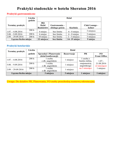 Praktyki studenckie w hotelu Sheraton 2016 Praktyki gastronomiczne Dział Liczba godzin Terminy praktyk 200 h 1.07. - 4.08.2016 200 h 5.08. - 9.09.2016 2.09. - 29.09.2016 200 h Łączna liczba miejsc BQ Dział Bankietów Gastronomia obsługa gościa Kuchnia 6 miejsc 6 miejsc 10 miejsc 22 miejsca bez limitu bez limitu bez limitu bez limitu 6 - 8 miejsc 6 - 8 miejsc 2 - 3 miejsca 14- 19 miejsc Club Lounge kelner 3 miejsca 3 miejsca 3 miejsca 9 miejsc Praktyki hotelarskie Terminy praktyk godzin 1.07. - 4.08.2016 5.08. - 9.09.2016 2.09. - 29.09.2016 Dział Liczba 200 h 200 h 200 h Łączna liczba miejsc Sprzedaż i Planowanie (dział konferencji) 1 osoba z db. angielskim 1 osoba z db. angielskim 1 osoba z db. angielskim 3 miejsca Rezerwacje 1 miejsce 1 miejsce 1 miejsce 3 miejsca PR FO Front Office 1 osoba z bardzo dobrą. znajomością angielskiego na 3 miesiące 1.07.31.08.2016 (2 miesiące) 1 miejsce 1 miejsce 1 miejsce Uwaga: Do działów PR, Planowania, FO osoby przechodzą rozmowę rekrutacyjną