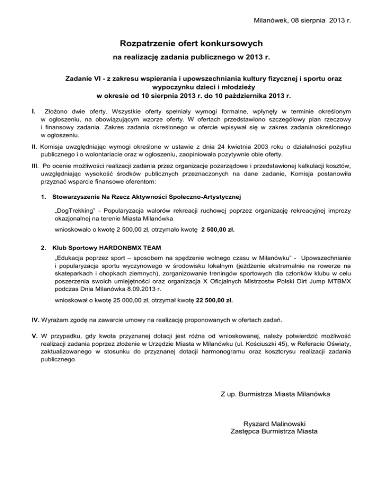 Milanówek, 08 sierpnia 2013 r. Rozpatrzenie ofert konkursowych na realizację zadania publicznego w 2013 r. Zadanie VI - z zakresu wspierania i upowszechniania kultury fizycznej i sportu oraz wypoczynku dzieci i młodzieży w okresie od 10 sierpnia 2013 r. do 10 października 2013 r. I. Złożono dwie oferty. Wszystkie oferty spełniały wymogi formalne, wpłynęły w terminie określonym w ogłoszeniu, na obowiązującym wzorze oferty. W ofertach przedstawiono szczegółowy plan rzeczowy i finansowy zadania. Zakres zadania określonego w ofercie wpisywał się w zakres zadania określonego w ogłoszeniu. II. Komisja uwzględniając wymogi określone w ustawie z dnia 24 kwietnia 2003 roku o działalności pożytku publicznego i o wolontariacie oraz w ogłoszeniu, zaopiniowała pozytywnie obie oferty. III. Po ocenie możliwości realizacji zadania przez organizacje pozarządowe i przedstawionej kalkulacji kosztów, uwzględniając wysokość środków publicznych przeznaczonych na dane zadanie, Komisja postanowiła przyznać wsparcie finansowe oferentom: 1. Stowarzyszenie Na Rzecz Aktywności Społeczno-Artystycznej „DogTrekking” - Popularyzacja walorów rekreacji ruchowej poprzez organizację rekreacyjnej imprezy okazjonalnej na terenie Miasta Milanówka wnioskowało o kwotę 2 500,00 zł, otrzymało kwotę 2 500,00 zł. 2. Klub Sportowy HARDONBMX TEAM „Edukacja poprzez sport – sposobem na spędzenie wolnego czasu w Milanówku” - Upowszechnianie i popularyzacja sportu wyczynowego w środowisku lokalnym (jeżdżenie ekstremalnie na rowerze na skateparkach i chopkach ziemnych), zorganizowanie treningów sportowych dla członków klubu w celu poszerzenia swoich umiejętności oraz organizacja X Oficjalnych Mistrzostw Polski Dirt Jump MTBMX podczas Dnia Milanówka 8.09.2013 r. wnioskował o kwotę 25 000,00 zł, otrzymał kwotę 22 500,00 zł. IV. Wyrażam zgodę na zawarcie umowy na realizację proponowanych w ofertach zadań. V. W przypadku, gdy kwota przyznanej dotacji jest różna od wnioskowanej, należy potwierdzić możliwość realizacji zadania poprzez złożenie w Urzędzie Miasta w Milanówku (ul. Kościuszki 45), w Referacie Oświaty, zaktualizowanego w stosunku do przyznanej dotacji harmonogramu oraz kosztorysu realizacji zadania publicznego. Z up. Burmistrza Miasta Milanówka Ryszard Malinowski Zastępca Burmistrza Miasta