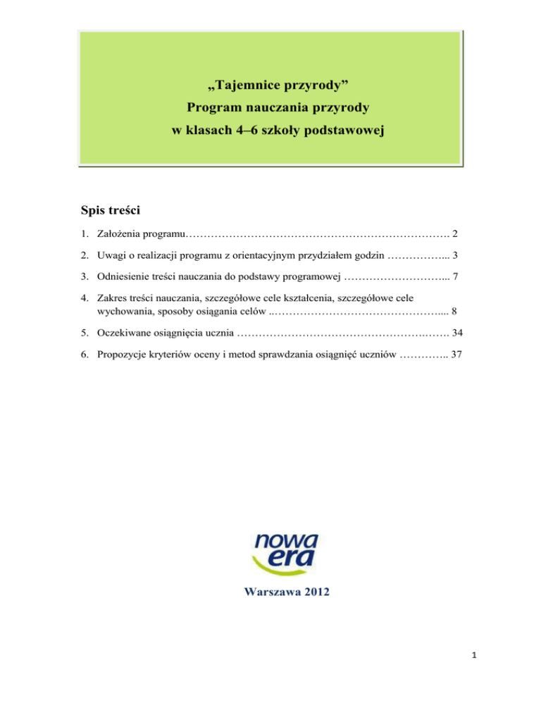 „Tajemnice przyrody” Program nauczania przyrody w klasach 4–6 szkoły podstawowej Spis treści 1. Założenia programu………………………………………………………………. 2 2. Uwagi o realizacji programu z orientacyjnym przydziałem godzin ……………... 3 3. Odniesienie treści nauczania do podstawy programowej ………………………... 7 4. Zakres treści nauczania, szczegółowe cele kształcenia, szczegółowe cele wychowania, sposoby osiągania celów ..……………………………………….... 8 5. Oczekiwane osiągnięcia ucznia …………………………………………….……. 34 6. Propozycje kryteriów oceny i metod sprawdzania osiągnięć uczniów ………….. 37 Warszawa 2012 1 1. Założenia programu Głównym celem nauczania w szkole podstawowej jest wyposażenie uczniów w niezbędną wiedzę dającą solidne podstawy do poznawania przedmiotów przyrodniczych w gimnazjum, oraz skorelowane z tą wiedzą umiejętności. Rozwojowi intelektualnemu i psychomotorycznemu ucznia powinien towarzyszyć rozwój sfery emocjonalnej, społecznej i etycznej. Realizacja tych założeń powinna odbywać się podczas realizacji nauczania w szkole podstawowej, w tym na lekcjach przyrody. Poniższy program nauczania przyrody „Tajemnice przyrody” jest zgodny z rozporządzeniem MEN z dnia 27 sierpnia 2012 r. w sprawie podstawy programowej wychowania przedszkolnego oraz kształcenia ogólnego w poszczególnych typach szkół (Dz. U. z 2012 r., poz. 977). Program uwzględnia określone w podstawie programowej cele kształcenia (wymagania ogólne), treści nauczania (wymagania szczegółowe), a także umiejętności ponadprzedmiotowe sformułowane we wstępnej części podstawy oraz założenia wychowawcze wynikające z treści przyrodniczych. Koncepcja programu oparta jest na najnowszych osiągnięciach dydaktyki czynnościowej, pedagogiki i psychologii. Program uwzględnia wszystkie elementy zalecane w rozporządzeniu MEN z dnia 23 czerwca 2012 r. w sprawie dopuszczania do użytku w szkole programów wychowania przedszkolnego i programów nauczania oraz dopuszczania do użytku szkolnego podręczników (Dz. U. z 2012 r., poz. 752), czyli: szczegółowe cele kształcenia i wychowania, treści zgodne z treściami nauczania zawartymi w podstawie programowej kształcenia ogólnego, sposoby osiągania celów kształcenia i wychowania, z uwzględnieniem możliwości indywidualizacji pracy w zależności od potrzeb i możliwości uczniów oraz warunków, w jakich program będzie realizowany, opis założonych osiągnięć ucznia, propozycje kryteriów oceny i metod sprawdzania osiągnięć ucznia. Układ materiału nauczania dostosowany jest do możliwości poznawczych uczniów klas 4–6 szkoły podstawowej, uwzględnia też indywidualne potrzeby edukacyjne zarówno uczniów zdolnych, zainteresowanych przedmiotem, jak również tych, którzy mają trudności w nauce. Naukę przyrody rozpoczyna się od realizacji treści społecznych, dzięki czemu dzieci uczą się właściwego funkcjonowania w klasie i szkole, a także budowania poprawnych relacji w kontaktach międzyludzkich. Następnie czwartoklasiści zapoznają się z najbliższą okolicą, 2 zjawiskami atmosferycznymi, które można obserwować na co dzień, uczą się posługiwać przyrządami służącymi do pomiarów i obserwacji. Zostają również wprowadzeni w zagadnienia dotyczące budowy i funkcjonowania organizmu człowieka oraz problematykę zdrowotną. Najbliższe im elementy środowisk: lądowego i wodnego oraz panujące w nich zależności poznają podczas wycieczek i zajęć terenowych. W kolejnych latach edukacji przyrodniczej uczniowie poznają Polskę, a następnie strefy krajobrazowe świata. W klasach 5 i 6 zostają wprowadzone treści dotyczące budowy materii, zachodzących w przyrodzie prostych zjawisk optycznych, akustycznych, mechanicznych, magnetycznych i elektrycznych oraz przemian chemicznych, które można zaobserwować na co dzień. Duży nacisk położono na efektywne poznawanie otaczającego świata poprzez, prowadzenie doświadczeń, obserwacji i pomiarów. Program ma strukturę modułową (jest zbudowany z części, których kolejność w mniejszym lub większym stopniu można zmieniać bez szkody dla całości programu), układ treści dostosowany jest do pór roku, co w dużym stopniu ułatwia realizację zajęć poza salą lekcyjną. Program jako dokument opisuje całościowo zakres kształcenia przyrodniczego na II etapie edukacyjnym. Ułatwieniem rocznego planowania pracy nauczyciela jest orientacyjny przydział godzin przeznaczonych na realizację poszczególnych działów programowych, uwzględniający lekcje w terenie, powtórzenia, a w klasie 6 także lekcje powtórzeniowe przed sprawdzianem. Dodatkowym elementem programu jest odniesienie treści nauczania do podstawy programowej przez wskazanie numerów szczegółowych wymagań zawartych w podstawie programowej, realizowanych w poszczególnych działach. W realizacji założeń niniejszego programu nauczania pomocne są publikacje serii „Tajemnice przyrody” – podręczniki z płytami CD-ROM oraz ich obudowa dydaktyczna, w której skład wchodzą: zeszyty ćwiczeń, multimedialne podręczniki dla nauczycieli, filmy edukacyjne, a także Książki Nauczyciela z płytami CD-ROM i „Pomysły na lekcje”. „Pomysły na lekcje” zawierają propozycje przeprowadzenia lekcji oraz artykuły dydaktyczne pomocne nauczycielom w codziennej pracy. W Książkach Nauczyciela znajdują się rozkłady materiału, plany wynikowe, sprawdziany w dwóch wersjach podstawowych i trzeciej, z zadaniami trudniejszymi , testy diagnozujące oraz konkursy przyrodnicze. 2. Uwagi o realizacji programu z orientacyjnym przydziałem godzin Zgodnie z założeniem podstawy programowej, że „dziecko najwięcej uczy się, działając”, w podręczniku zamieszczone zostały instrukcje „Krok po kroku”, w których jasno,