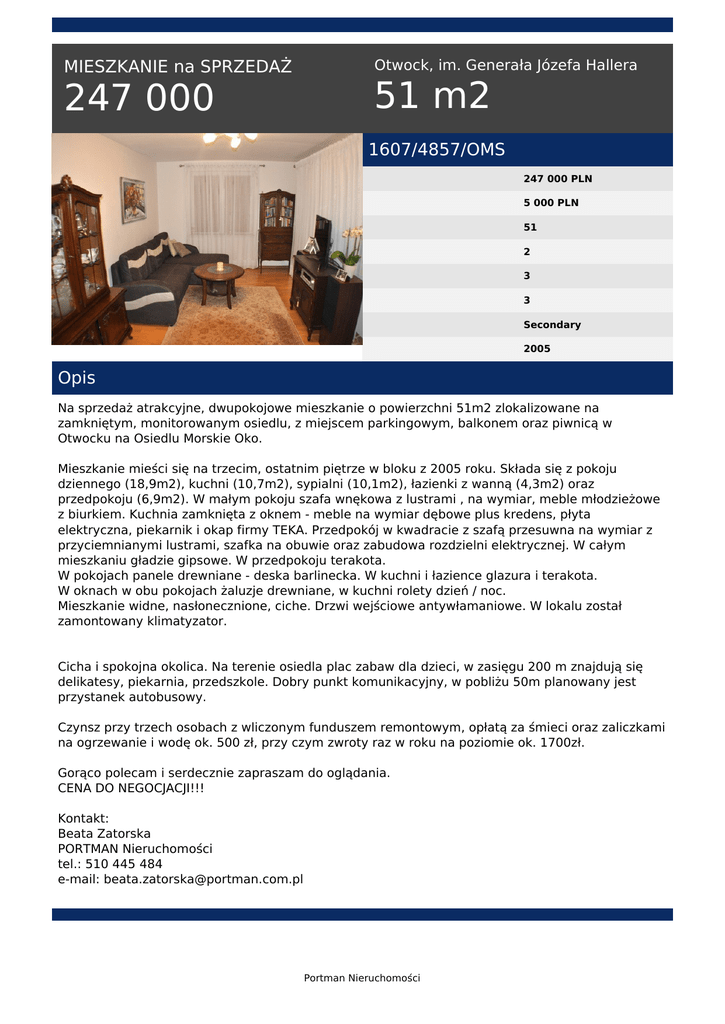 Otwock, im. Generała Józefa Hallera MIESZKANIE na SPRZEDAŻ 51 m2 247 000 1607/4857/OMS 247 000 PLN 5 000 PLN 51 2 3 3 Secondary 2005 Opis Na sprzedaż atrakcyjne, dwupokojowe mieszkanie o powierzchni 51m2 zlokalizowane na zamkniętym, monitorowanym osiedlu, z miejscem parkingowym, balkonem oraz piwnicą w Otwocku na Osiedlu Morskie Oko. Mieszkanie mieści się na trzecim, ostatnim piętrze w bloku z 2005 roku. Składa się z pokoju dziennego (18,9m2), kuchni (10,7m2), sypialni (10,1m2), łazienki z wanną (4,3m2) oraz przedpokoju (6,9m2). W małym pokoju szafa wnękowa z lustrami , na wymiar, meble młodzieżowe z biurkiem. Kuchnia zamknięta z oknem - meble na wymiar dębowe plus kredens, płyta elektryczna, piekarnik i okap firmy TEKA. Przedpokój w kwadracie z szafą przesuwna na wymiar z przyciemnianymi lustrami, szafka na obuwie oraz zabudowa rozdzielni elektrycznej. W całym mieszkaniu gładzie gipsowe. W przedpokoju terakota. W pokojach panele drewniane - deska barlinecka. W kuchni i łazience glazura i terakota. W oknach w obu pokojach żaluzje drewniane, w kuchni rolety dzień / noc. Mieszkanie widne, nasłonecznione, ciche. Drzwi wejściowe antywłamaniowe. W lokalu został zamontowany klimatyzator. Cicha i spokojna okolica. Na terenie osiedla plac zabaw dla dzieci, w zasięgu 200 m znajdują się delikatesy, piekarnia, przedszkole. Dobry punkt komunikacyjny, w pobliżu 50m planowany jest przystanek autobusowy. Czynsz przy trzech osobach z wliczonym funduszem remontowym, opłatą za śmieci oraz zaliczkami na ogrzewanie i wodę ok. 500 zł, przy czym zwroty raz w roku na poziomie ok. 1700zł. Gorąco polecam i serdecznie zapraszam do oglądania. CENA DO NEGOCJACJI!!! Kontakt: Beata Zatorska PORTMAN Nieruchomości tel.: 510 445 484 e-mail: [email protected] Portman Nieruchomości Beata Zatorska tel. 510 445 484 email: [email protected] Portman Nieruchomości Powered by TCPDF (www.tcpdf.org)