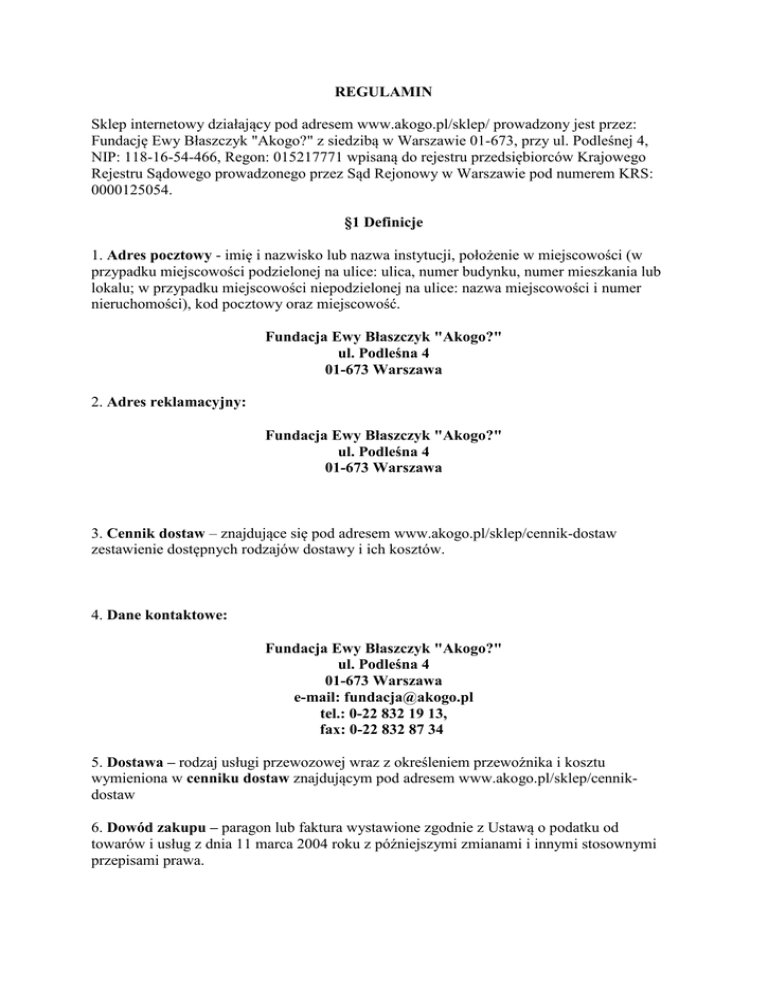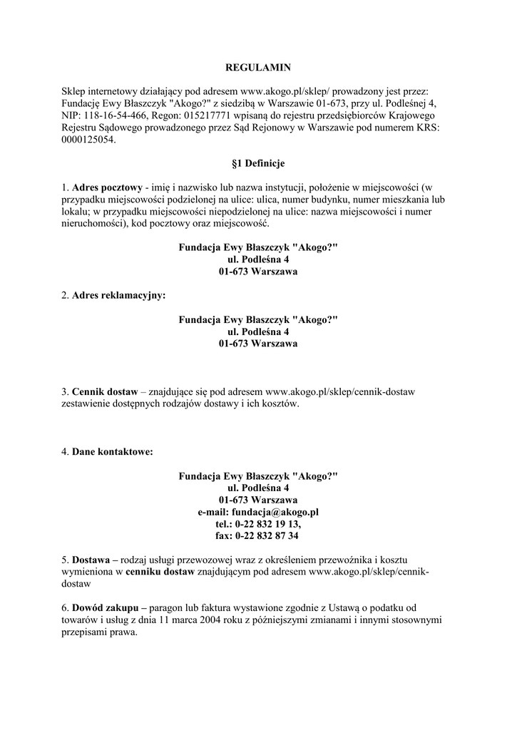 REGULAMIN Sklep internetowy działający pod adresem www.akogo.pl/sklep/ prowadzony jest przez: Fundację Ewy Błaszczyk "Akogo?" z siedzibą w Warszawie 01-673, przy ul. Podleśnej 4, NIP: 118-16-54-466, Regon: 015217771 wpisaną do rejestru przedsiębiorców Krajowego Rejestru Sądowego prowadzonego przez Sąd Rejonowy w Warszawie pod numerem KRS: 0000125054. §1 Definicje 1. Adres pocztowy - imię i nazwisko lub nazwa instytucji, położenie w miejscowości (w przypadku miejscowości podzielonej na ulice: ulica, numer budynku, numer mieszkania lub lokalu; w przypadku miejscowości niepodzielonej na ulice: nazwa miejscowości i numer nieruchomości), kod pocztowy oraz miejscowość. Fundacja Ewy Błaszczyk "Akogo?" ul. Podleśna 4 01-673 Warszawa 2. Adres reklamacyjny: Fundacja Ewy Błaszczyk "Akogo?" ul. Podleśna 4 01-673 Warszawa 3. Cennik dostaw – znajdujące się pod adresem www.akogo.pl/sklep/cennik-dostaw zestawienie dostępnych rodzajów dostawy i ich kosztów. 4. Dane kontaktowe: Fundacja Ewy Błaszczyk "Akogo?" ul. Podleśna 4 01-673 Warszawa e-mail: [email protected] tel.: 0-22 832 19 13, fax: 0-22 832 87 34 5. Dostawa – rodzaj usługi przewozowej wraz z określeniem przewoźnika i kosztu wymieniona w cenniku dostaw znajdującym pod adresem www.akogo.pl/sklep/cennikdostaw 6. Dowód zakupu – paragon lub faktura wystawione zgodnie z Ustawą o podatku od towarów i usług z dnia 11 marca 2004 roku z późniejszymi zmianami i innymi stosownymi przepisami prawa. 7. Karta produktu – pojedyncza podstrona sklepu zawierająca informacje o pojedynczym produkcie. 8. Klient – pełnoletnia osoba fizyczna posiadająca pełną zdolność do czynności prawnych, osoba prawna lub jednostka organizacyjna nie posiadająca osobowości prawnej a posiadająca zdolność do czynności prawnych, dokonująca u Sprzedającego zakupu związanego bezpośrednio z jej działalnością gospodarczą lub zawodową. 9. Kodeks cywilny – ustawa kodeks cywilny z dnia 23 kwietnia 1964 roku z późniejszymi zmianami. 10. Kodeks dobrych praktyk – zbiór zasad postępowania, a w szczególności norm etycznych i zawodowych, o których mowa w art 2 pkt. 5 Ustawy o przeciwdziałaniu nieuczciwym praktykom rynkowym z dnia 23 sierpnia 2007 roku z późniejszymi zmianami. 11. Konsument – pełnoletnia osoba fizyczna posiadająca pełną zdolność do czynności prawnych, dokonująca u Sprzedającego zakupu niezwiązanego bezpośrednio z jej działalnością gospodarczą lub zawodową. 12. Koszyk – lista produktów sporządzona z oferowanych w sklepie produktów na podstawie wyborów Kupującego. 13. Kupujący – zarówno Konsument, jak i Klient. 14. Miejsce wydania rzeczy – adres pocztowy lub punkt odbioru wskazane w zamówieniu przez Kupującego. 15. Moment wydania rzeczy – moment, w którym Kupujący lub wskazana przez niego do odbioru osoba trzecia obejmie rzecz w posiadanie. 16. Płatność – metoda dokonania zapłaty za przedmiot umowy i dostawę wymieniona pod adresem www.akogo.pl/sklep/cennik-dostaw 17. Prawo konsumenckie – ustawa o prawach konsumenta z dnia 30 maja 2014 roku. 18. Produkt – minimalna i niepodzielna ilość rzeczy, która może być przedmiotem zamówienia, a która podana jest w sklepie Sprzedającego jako jednostka miary przy określeniu jego ceny (cena/jednostka). 19. Przedmiot umowy – produkty i dostawa będące przedmiotem umowy. 20. Przedmiot świadczenia – przedmiot umowy. 21. Punkt odbioru – miejsce wydania rzeczy nie będące adresem pocztowym, wymienione w zestawieniu udostępnionym przez Sprzedającego w sklepie. 22. Rzecz – rzecz ruchoma mogąca być lub będąca przedmiotem umowy. 23. Sklep – serwis internetowy dostępny pod adresem www.akogo.pl/sklep za pośrednictwem którego Kupujący może złożyć zamówienie. 24. Sprzedający: Fundacja Ewy Błaszczyk "Akogo?" z siedzibą w Warszawie 01-673, przy ul. Podleśnej 4, NIP: 118-16-54-466, Regon: 015217771 wpisaną do rejestru przedsiębiorców Krajowego Rejestru Sądowego prowadzonego przez Sąd Rejonowy w Warszawie pod numerem KRS: 0000125054 25.System – zespół współpracujących ze sobą urządzeń informatycznych i oprogramowania, zapewniający przetwarzanie i przechowywanie, a także wysyłanie i odbieranie danych poprzez sieci telekomunikacyjne za pomocą właściwego dla danego rodzaju sieci urządzenia końcowego w rozumieniu prawa telekomunikacyjnego. 26. Termin realizacji – termin dostarczenia produktu podany na stronie www.akogo.pl/sklep/cennik-dostaw 27. Umowa – umowa zawierana poza lokalem przedsiębiorcy lub na odległość w rozumieniu Ustawy o prawach konsumenta z dnia 30 maja 2014 roku w przypadku Konsumentów i umowa sprzedaży w rozumieniu art. 535 Ustawy kodeks cywilny z dnia 23 kwietnia 1964 roku w przypadku Kupujących. 28. Wada – zarówno wada fizyczna, jak i wada prawna. 29. Wada fizyczna– niezgodność rzeczy sprzedanej z umową, a w szczególności jeśli rzecz: a. nie ma ona właściwości, które rzecz tego rodzaju powinna mieć ze względu na cel w umowie oznaczony albo wynikający z okoliczności lub przeznaczenia; b. nie ma właściwości, o których istnieniu Sprzedający zapewnił Konsumenta, c. nie nadaje się do celu, o którym Konsument poinformował Sprzedającego przy zawarciu umowy, a Sprzedający nie zgłosił zastrzeżenia co do takiego jej przeznaczenia; d. została Konsumentowi wydana w stanie niezupełnym; e. w razie nieprawidłowego jej zamontowania i uruchomienia, jeżeli czynności te zostały wykonane przez Sprzedającego lub osobę trzecią, za którą Sprzedający ponosi odpowiedzialność, albo przez Konsumenta, który postąpił według instrukcji otrzymanej od Sprzedającego; f. nie ma ona właściwości, o której zapewniał producent lub jego przedstawiciel lub osoba, która wprowadza rzecz do obrotu w zakresie swojej działalności gospodarczej oraz osoba, która przez umieszczenie na rzeczy sprzedanej swojej nazwy, znaku towaroweg