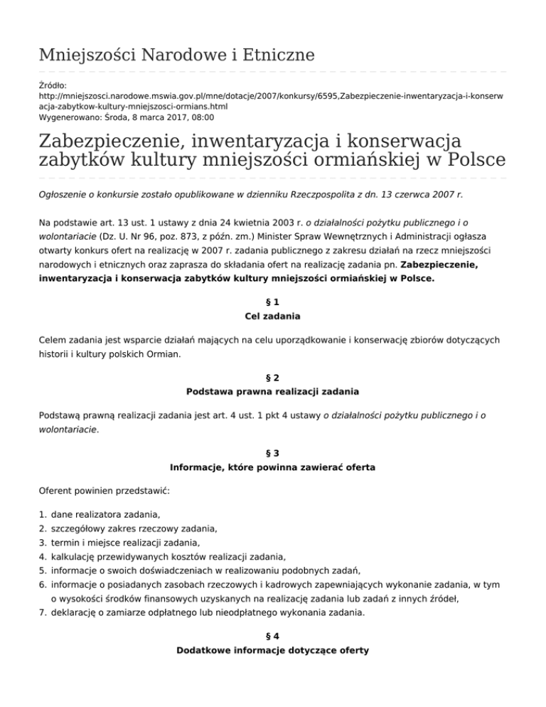 Mniejszości Narodowe i Etniczne Źródło: http://mniejszosci.narodowe.mswia.gov.pl/mne/dotacje/2007/konkursy/6595,Zabezpieczenie-inwentaryzacja-i-konserw acja-zabytkow-kultury-mniejszosci-ormians.html Wygenerowano: Środa, 8 marca 2017, 08:00 Zabezpieczenie, inwentaryzacja i konserwacja zabytków kultury mniejszości ormiańskiej w Polsce Ogłoszenie o konkursie zostało opublikowane w dzienniku Rzeczpospolita z dn. 13 czerwca 2007 r. Na podstawie art. 13 ust. 1 ustawy z dnia 24 kwietnia 2003 r. o działalności pożytku publicznego i o wolontariacie (Dz. U. Nr 96, poz. 873, z późn. zm.) Minister Spraw Wewnętrznych i Administracji ogłasza otwarty konkurs ofert na realizację w 2007 r. zadania publicznego z zakresu działań na rzecz mniejszości narodowych i etnicznych oraz zaprasza do składania ofert na realizację zadania pn. Zabezpieczenie, inwentaryzacja i konserwacja zabytków kultury mniejszości ormiańskiej w Polsce. §1 Cel zadania Celem zadania jest wsparcie działań mających na celu uporządkowanie i konserwację zbiorów dotyczących historii i kultury polskich Ormian. §2 Podstawa prawna realizacji zadania Podstawą prawną realizacji zadania jest art. 4 ust. 1 pkt 4 ustawy o działalności pożytku publicznego i o wolontariacie. §3 Informacje, które powinna zawierać oferta Oferent powinien przedstawić: 1. dane realizatora zadania, 2. szczegółowy zakres rzeczowy zadania, 3. termin i miejsce realizacji zadania, 4. kalkulację przewidywanych kosztów realizacji zadania, 5. informacje o swoich doświadczeniach w realizowaniu podobnych zadań, 6. informacje o posiadanych zasobach rzeczowych i kadrowych zapewniających wykonanie zadania, w tym o wysokości środków finansowych uzyskanych na realizację zadania lub zadań z innych źródeł, 7. deklarację o zamiarze odpłatnego lub nieodpłatnego wykonania zadania. §4 Dodatkowe informacje dotyczące oferty 1. Na realizację zadania Minister Spraw Wewnętrznych i Administracji planuje przekazać środki w wysokości 27.704 PLN. 2. Realizacja zadania powinna nastąpić w okresie od dnia 1 sierpnia 2007 r. do dnia 31 grudnia 2007 r. §5 Wymagania formalne 1. Warunkiem przystąpienia do konkursu jest złożenie w terminie 30 dni od dnia, w którym ukazało się ogłoszenie, oferty zgodnej ze wzorem określonym w rozporządzeniu Ministra Pracy i Polityki Społecznej z dnia 27 grudnia 2005 r. w sprawie wzoru oferty realizacji zadania publicznego, ramowego wzoru umowy o wykonanie zadania publicznego i wzoru sprawozdania z wykonania tego zadania (Dz. U. Nr 264, poz. 2207). 2. Rozpatrywane będą jedynie oferty złożone przez Oferenta, który spełnia łącznie następujące wymogi formalne: 1. jest organizacją pozarządową lub też inną jednostką, której celem statutowym jest działanie na rzecz rozwoju kultury, 2. jego cele statutowe są zbieżne z zadaniami z zakresu wspierania rozwoju kultury mniejszości ormiańskiej, 3. dysponuje odpowiednio wyszkoloną kadrą, zdolną do realizacji zadania, 4. posiada doświadczenie niezbędne do realizacji zadania, 5. jest wiarygodny pod względem finansowym, 6. przedłoży kompletną ofertę w terminie określonym w ogłoszeniu. 3. Oferenci, przystępujący do konkursu ofert, którzy nie mają możliwości samodzielnej realizacji zadania, powinni załączyć do oferty, pod rygorem nieważności, dokumenty potwierdzające możliwość wykonania pełnego zakresu zadania we współpracy ze wskazanym w ofercie podmiotem (osobą fizyczną lub prawną) np.: umowę przyrzeczenia zawarcia umowy o wspólnej realizacji zadania, umowę konsorcyjną itp. §6 Termin i kryteria stosowane przy dokonywaniu wyboru oferty Wyniki konkursu podane będą nie później niż 10 dni po upływie terminu składania ofert. Podstawą wyboru oferty jest ocena przedstawionych przez oferenta propozycji realizacji punktów wymienionych w § 1-5. §7 Warunek przekazania dotacji Warunkiem przekazania dotacji jest zawarcie przed datą rozpoczęcia realizacji projektu, umowy według wzoru określonego w Rozporządzeniu Ministra Pracy i Polityki Społecznej z dnia 27 grudnia 2005 r. w sprawie wzoru oferty realizacji zadania publicznego, ramowego wzoru umowy o wykonanie zadania publicznego i wzoru sprawozdania z wykonania tego zadania (Dz. U. Nr 264, poz. 2207). §8 Informacja o zrealizowanych w latach 2006 i 2007 zadaniach publicznych tego samego rodzaju W roku 2006 Ministerstwo Spraw Wewnętrznych i Administracji przeznaczyło na realizację zadań służących podtrzymywaniu tożsamości kulturowej mniejszości ormiańskiej kwotę 96.879 PLN, a w roku 2007 kwotę 149.987 PLN. §9 Informacje dotyczące organizatora konkursu ofert 1. W przypadku zaistnienia wątpliwości, dodatkowych informacji udzielają pracownicy Wydziału Mniejszości Narodowych i Etnicznych Departamentu Wyznań Religijnych oraz Mniejszości Narodowych i Etnicznych MSWiA, pod numerem telefonu (22) 60 119 75 lub pod adresem poczty elektronicznej: [email protected] 2. Oferty należy składać w Departamencie Wyznań Religijnych oraz Mniejszości Narodowych i Etnicznych MSWiA, ul. Batorego 5, 02-591 Warszawa. § 10 Zastrzeżenie Ogłaszający zastrzega sobie prawo unieważnienia konkursu i z tego tytułu nie przysługuje Oferentom roszczenie przeciwko ogłaszającemu. Wstecz Drukuj Generuj PDF Powiadom znajomego