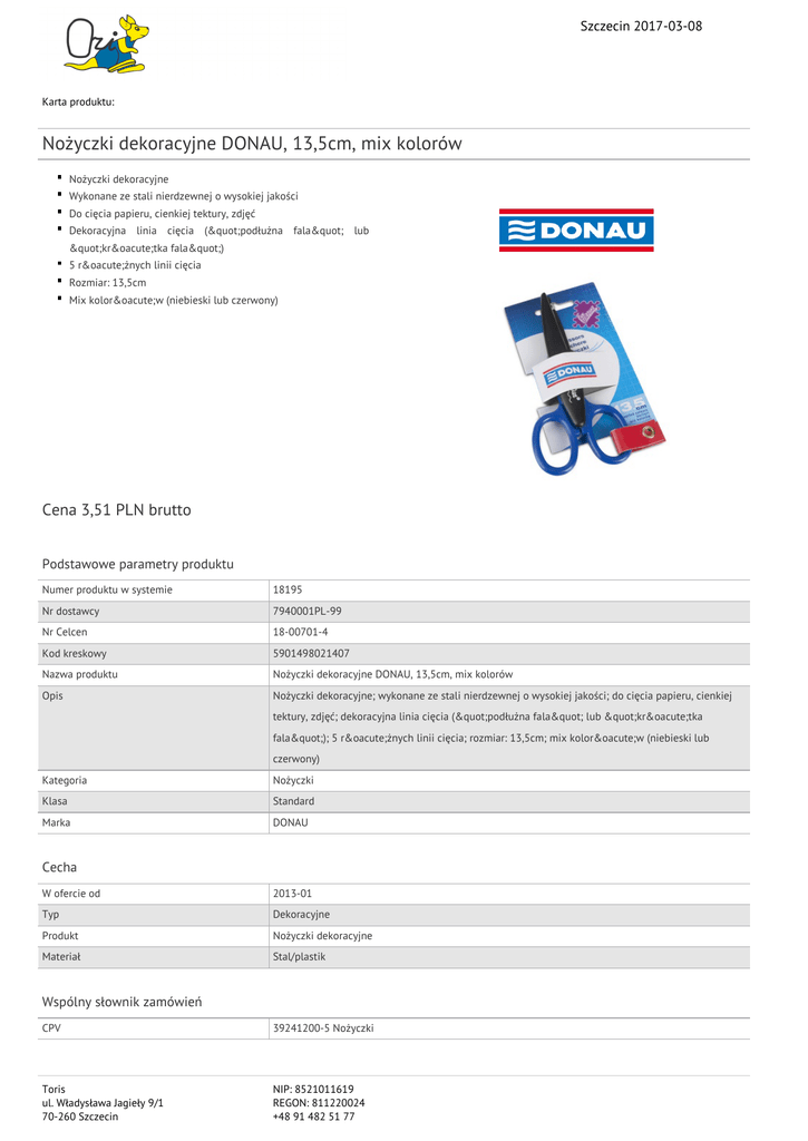 Szczecin 2017-03-08 Karta produktu: Nożyczki dekoracyjne DONAU, 13,5cm, mix kolorów Nożyczki dekoracyjne Wykonane ze stali nierdzewnej o wysokiej jakości Do cięcia papieru, cienkiej tektury, zdjęć Dekoracyjna linia cięcia ("podłużna fala" lub "krótka fala") 5 różnych linii cięcia Rozmiar: 13,5cm Mix kolorów (niebieski lub czerwony) Cena 3,51 PLN brutto Podstawowe parametry produktu Numer produktu w systemie 18195 Nr dostawcy 7940001PL-99 Nr Celcen 18-00701-4 Kod kreskowy 5901498021407 Nazwa produktu Nożyczki dekoracyjne DONAU, 13,5cm, mix kolorów Opis Nożyczki dekoracyjne; wykonane ze stali nierdzewnej o wysokiej jakości; do cięcia papieru, cienkiej tektury, zdjęć; dekoracyjna linia cięcia ("podłużna fala" lub "krótka fala"); 5 różnych linii cięcia; rozmiar: 13,5cm; mix kolorów (niebieski lub czerwony) Kategoria Nożyczki Klasa Standard Marka DONAU Cecha W ofercie od 2013-01 Typ Dekoracyjne Produkt Nożyczki dekoracyjne Materiał Stal/plastik Wspólny słownik zamówień CPV 39241200-5 Nożyczki Toris ul. Władysława Jagieły 9/1 70-260 Szczecin NIP: 8521011619 REGON: 811220024 +48 91 482 51 77 Szczecin 2017-03-08 Karta katalogowa produktu cd. Nożyczki dekoracyjne DONAU, 13,5cm, mix kolorów Certyfikaty Nowy produkt w ofercie Standard Hit Standard Wymiary Rozmiar 13,5cm Kolor Kolor Mix kolorów Pozostałe zdjęcia produktu Serdecznie zapraszamy do współpracy Toris zespół. Toris ul. Władysława Jagieły 9/1 70-260 Szczecin NIP: 8521011619 REGON: 811220024 +48 91 482 51 77