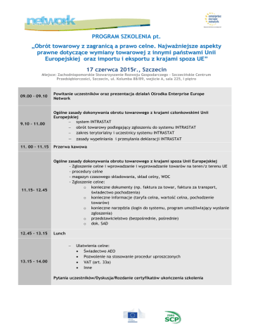 PROGRAM SZKOLENIA pt. „Obrót towarowy z zagranicą a prawo celne. Najważniejsze aspekty prawne dotyczące wymiany towarowej z innymi państwami Unii Europejskiej oraz importu i eksportu z krajami spoza UE” 17 czerwca 2015r., Szczecin Miejsce: Zachodniopomorskie Stowarzyszenie Rozwoju Gospodarczego – Szczecińskie Centrum Przedsiębiorczości, Szczecin, ul. Kolumba 88/89, wejście A, sala 225, I piętro 09.00 – 09.10 Powitanie uczestników oraz prezentacja działań Ośrodka Enterprise Europe Network 9.10 – 11.00 Ogólne zasady dokonywania obrotu towarowego z krajami członkowskimi Unii Europejskiej system INTRASTAT obrót towarowy podlegający zgłoszeniu do systemu INTRASTAT zakres terytorialny i uczestnicy systemu INTRASTAT zasady wypełniania i przesyłania deklaracji INTRASTAT 11. 00 – 11.15 11.15 – 12.45 12.45 – 13.15 Przerwa kawowa Ogólne zasady dokonywania obrotu towarowego z krajami spoza Unii Europejskiej - Zgłoszenie celne i wprowadzanie i wyprowadzanie towarów na teren/z terenu UE - procedury celne - magazyn czasowego składowania, skład celny, WOC - Zgłoszenie celne: o konieczne dokumenty (np. faktura za towar, faktura za transport, świadectwo pochodzenia) o konieczne informacje (taryfa celna, wartość celna, pochodzenie towarów) o konieczne narzędzia (login do systemu, program umożliwiający wysłanie zgłoszenia) o przedstawicielstwo (bezpośrednie, pośrednie) o dok. SAD Lunch 13.15 – 14.00 Ułatwienia celne: Świadectwo AEO Pozwolenie na stosowanie procedur uproszczonych VAT (art. 33a) Inne Pytania uczestników/Dyskusja/Rozdanie certyfikatów ukończenia szkolenia