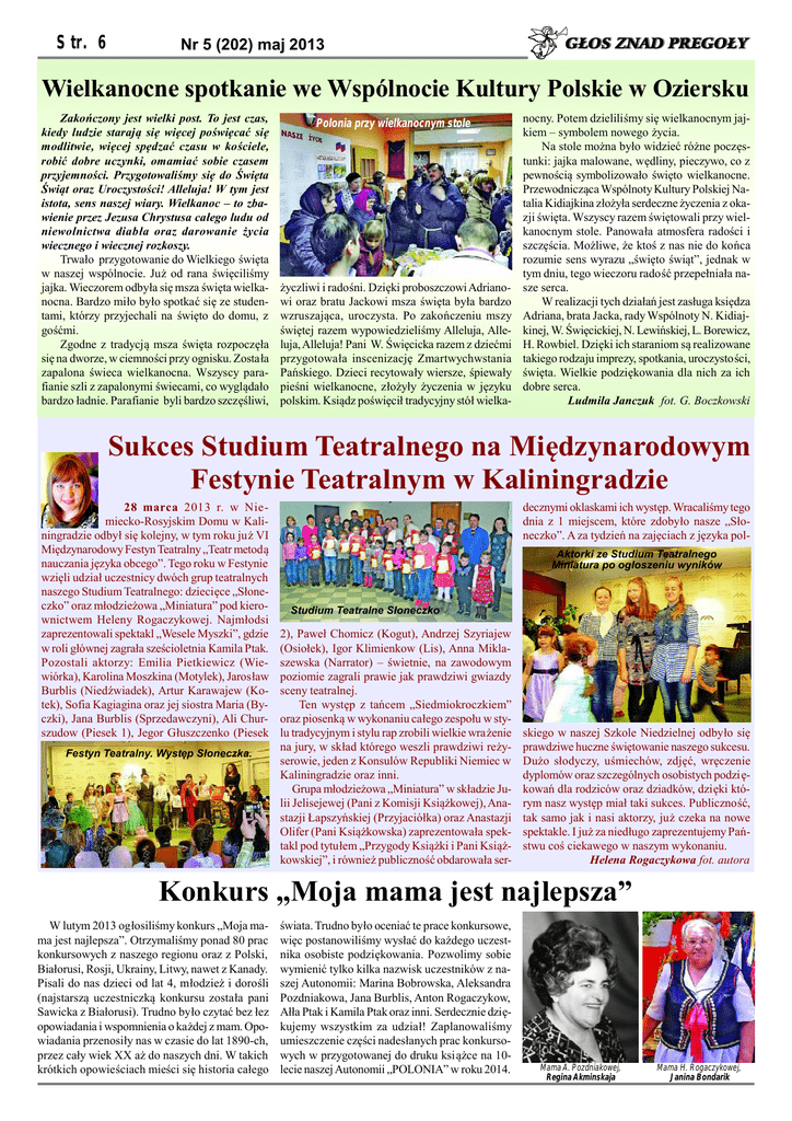 Str. 6 Nr 5 (202) maj 2013 Wielkanocne spotkanie we Wspólnocie Kultury Polskie w Oziersku Zakończony jest wielki post. To jest czas, kiedy ludzie starają się więcej poświęcać się modlitwie, więcej spędzać czasu w kościele, robić dobre uczynki, omamiać sobie czasem przyjemności. Przygotowaliśmy się do Święta Świąt oraz Uroczystości! Alleluja! W tym jest istota, sens naszej wiary. Wielkanoc – to zbawienie przez Jezusa Chrystusa całego ludu od niewolnictwa diabła oraz darowanie życia wiecznego i wiecznej rozkoszy. Trwało przygotowanie do Wielkiego święta w naszej wspólnocie. Już od rana święciliśmy jajka. Wieczorem odbyła się msza święta wielkanocna. Bardzo miło było spotkać się ze studentami, którzy przyjechali na święto do domu, z gośćmi. Zgodne z tradycją msza święta rozpoczęła się na dworze, w ciemności przy ognisku. Została zapalona świeca wielkanocna. Wszyscy parafianie szli z zapalonymi świecami, co wyglądało bardzo ładnie. Parafianie byli bardzo szczęśliwi, Polonia przy wielkanocnym stole życzliwi i radośni. Dzięki proboszczowi Adrianowi oraz bratu Jackowi msza święta była bardzo wzruszająca, uroczysta. Po zakończeniu mszy świętej razem wypowiedzieliśmy Alleluja, Alleluja, Alleluja! Pani W. Święcicka razem z dziećmi przygotowała inscenizację Zmartwychwstania Pańskiego. Dzieci recytowały wiersze, śpiewały pieśni wielkanocne, złożyły życzenia w języku polskim. Ksiądz poświęcił tradycyjny stół wielka- nocny. Potem dzieliliśmy się wielkanocnym jajkiem – symbolem nowego życia. Na stole można było widzieć różne poczęstunki: jajka malowane, wędliny, pieczywo, co z pewnością symbolizowało święto wielkanocne. Przewodnicząca Wspólnoty Kultury Polskiej Natalia Kidiajkina złożyła serdeczne życzenia z okazji święta. Wszyscy razem świętowali przy wielkanocnym stole. Panowała atmosfera radości i szczęścia. Możliwe, że ktoś z nas nie do końca rozumie sens wyrazu „święto świąt”, jednak w tym dniu, tego wieczoru radość przepełniała nasze serca. W realizacji tych działań jest zasługa księdza Adriana, brata Jacka, rady Wspólnoty N. Kidiajkinej, W. Święcickiej, N. Lewińskiej, L. Borewicz, H. Rowbiel. Dzięki ich staraniom są realizowane takiego rodzaju imprezy, spotkania, uroczystości, święta. Wielkie podziękowania dla nich za ich dobre serca. Ludmila Janczuk fot. G. Boczkowski Sukces Studium Teatralnego na Międzynarodowym Festynie Teatralnym w Kaliningradzie 28 marca 2013 r. w Niemiecko-Rosyjskim Domu w Kaliningradzie odbył się kolejny, w tym roku już VI Międzynarodowy Festyn Teatralny „Teatr metodą nauczania języka obcego”. Tego roku w Festynie wzięli udział uczestnicy dwóch grup teatralnych naszego Studium Teatralnego: dziecięce „Słoneczko” oraz młodzieżowa „Miniatura” pod kierownictwem Heleny Rogaczykowej. Najmłodsi zaprezentowali spektakl „Wesele Myszki”, gdzie w roli głównej zagrała sześcioletnia Kamila Ptak. Pozostali aktorzy: Emilia Pietkiewicz (Wiewiórka), Karolina Moszkina (Motylek), Jarosław Burblis (Niedźwiadek), Artur Karawajew (Kotek), Sofia Kagiagina oraz jej siostra Maria (Byczki), Jana Burblis (Sprzedawczyni), Ali Churszudow (Piesek 1), Jegor Głuszczenko (Piesek Festyn Teatralny. Występ Słoneczka. decznymi oklaskami ich występ. Wracaliśmy tego dnia z 1 miejscem, które zdobyło nasze „Słoneczko”. A za tydzień na zajęciach z języka polAktorki ze Studium Teatralnego Miniatura po ogłoszeniu wyników Studium Teatralne Słoneczko 2), Paweł Chomicz (Kogut), Andrzej Szyriajew (Osiołek), Igor Klimienkow (Lis), Anna Miklaszewska (Narrator) – świetnie, na zawodowym poziomie zagrali prawie jak prawdziwi gwiazdy sceny teatralnej. Ten występ z tańcem „Siedmiokroczkiem” oraz piosenką w wykonaniu całego zespołu w stylu tradycyjnym i stylu rap zrobili wielkie wrażenie na jury, w skład którego weszli prawdziwi reżyserowie, jeden z Konsulów Republiki Niemiec w Kaliningradzie oraz inni. Grupa młodzieżowa „Miniatura” w składzie Julii Jelisejewej (Pani z Komisji Książkowej), Anastazji Łapszyńskiej (Przyjaciółka) oraz Anastazji Olifer (Pani Książkowska) zaprezentowała spektakl pod tytułem „Przygody Książki i Pani Książkowskiej”, i również publiczność obdarowała ser- skiego w naszej Szkole Niedzielnej odbyło się prawdziwe huczne świętowanie naszego sukcesu. Dużo słodyczy, uśmiechów, zdjęć, wręczenie dyplomów oraz szczególnych osobistych podzi ękowań dla rodziców oraz dziadków, dzięki którym nasz występ miał taki sukces. Publiczność, tak samo jak i nasi aktorzy, już czeka na nowe spektakle. I już za niedługo zaprezentujemy Państwu coś ciekawego w naszym wykonaniu. Helena Rogaczykowa fot. autora Konkurs „Moja mama jest najlepsza” W lutym 2013 ogłosiliśmy konkurs „Moja mama jest najlepsza”. Otrzymaliśmy ponad 80 prac konkursowych z naszego regionu oraz z Polski, Białorusi, Rosji, Ukrainy, Litwy, nawet z Kanady. Pisali do nas dzieci od lat 4, młodzież i dorośli (najstarszą uczestniczką konkursu została pani Sawicka z Białorusi). Trudno było czytać bez łez opowiadania i wspomnienia o każdej z mam. Opowiadania przenosiły nas w czasie do lat 1890-ch, przez cały wiek XX aż do naszych dni. W takich krótkich opowieściach mieści się historia całego świata. Trudno było oceniać te prace konkursowe, więc postanowiliśmy wysłać do każdego uczestnika osobiste podziękowania. Pozwolimy sobie wymienić tylko kilka nazwisk uczestników z naszej Autonomii: Marina Bobrowska, Aleksandra Pozdniakowa, Jana Burblis, Anton Rogaczykow, Ałła Ptak i Kamila Ptak oraz inni. Serdecznie dziękujemy wszystkim za udział! Zaplanowaliśmy umieszczenie części nadesłanych prac konkursowych w przygotowanej do druku książce na 10lecie naszej Autonomii „POLONIA” w roku 2014. Mama A. Pozdniakowej, Regina Akminskaja Mama H.