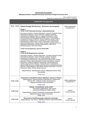PROGRAM WYDARZEŃ Międzynarodowe Targi Mechanizacji Rolnictwa Polagra-Premiery 2012 Stan na dzień 07.02.2012 Organizator zastrzega sobie prawo do zmian w programie CZWARTEK 16 lutego 2012 10:30 – 15:30 Debata Okrągły Stół Rolniczy - Rolnictwo dla energetyki Salka wykładowa w pawilonie 5 Część I 10.30-13.00 Potencjał biomasy i zapotrzebowanie Zaproszeni paneliści: Jarosław Wiśniewski, naczelnik Wydziału Energii Odnawialnej i Biopaliw, Janusz Pilitowski, zastępca dyrektora, Departament Energetyki, MG, prof. Janusz Gołaszewski, UWM, przewodniczący Zespołu OZE przy MRiRW, prof. Anna Grzybek, wiceprzewodnicząca POLBIOM, Ryszard Gajewski, prezes Polskiej Izby Biomasy, Grzegorz Wrona, wiceprezes Tauron Wytwarzanie, Przedstawiciel, Dalkia Polska, Józef Lewandowski, Polska Grupa Agencji Energetycznych, Roman Długi, Związek Pracodawców Forum Energetyki Odnawialnej, Wojciech Mazurkiewicz, AES Toruń, Michała Kacprzyk, PM Group Polska. 13.00-13.30 poczęstunek, sponsor Bank BGś Część II 13.30-16.00 Biogazownie rolnicze Zaproszeni paneliści: Jarosław Wiśniewski, naczelnik Wydziału Energii Odnawialnej i Biopaliw, Janusz Pilitowski, zastępca dyrektora, Departament Energetyki, MG, prof. Andrzej Myczko, Instytut Technologiczno-Przyrodniczy, Oddział Poznań, Michał Ćwil, dyrektor generalny, Polska Izba Gospodarcza Energii Odnawialnej, Grzegorz Wiśniewski, Instytut Energetyki Odnawialnej, Andrzej Bobrowski, dyrektor Agencji Rynku Rolnego, Oddział Poznań, przedstawiciel Agencji Restrukturyzacji i Modernizacji Rolnictwa, przedstawiciel ENEA Operator, Maciej Majewski, Bank BGś, Wiesław Wasilewski, Fundusze Pomocowe, Marek Jóźwiak, Biogaz Zeneris. Organizatorzy: Wydawnictwo Abrys i Międzynarodowe Targi Poznańskie Wstęp wolny 13:00- 15:00 „Znaczenie i przyszłość duŜych dzierŜaw rolnych w Polsce” Organizatorzy: Stowarzyszenie DzierŜawców i Właścicieli Rolnych RP, redakcja portalu Gospodarz.pl i Międzynarodowe Targi Poznańskie Salka wykładowa w pawilonie 5 Wstęp wolny 12:00-13:00 Debata „Perspektywy rynku zbóŜ” Poruszane zagadnienia: stan ozimin, nawoŜenie,Wspólna Polityka Rolna Organizatorzy: Krajowa Federacja Producentów ZbóŜ RP i Międzynarodowe Targi Poznańskie Scena w Alei Lipowej Wstęp wolny 13:00-14:00 Stosowanie kwalifikowanego materiału siewnego – Organizatorzy: Top Farms i Międzynarodowe Targi Poznańskie Scena w Alei Lipowej Wstęp wolny 1 PIĄTEK 17 lutego 2012 10:00-11:00 TOP FUN KLUB – spotkanie młodych entuzjastów techniki rolniczej. Organizatorzy: Top Agrar Polska i Międzynarodowe Targi Poznańskie Scena w Alei Lipowej Wstęp wolny 10:00 – 12:00 Walne zebranie członków Polskiego Związku Producentów Kukurydzy Organizator: PZPK Sala wykładowa na I piętrze Pawilon 7 Wstęp tylko dla członków Warsztaty dla rolników - jak oszczędnie, pod względem zuŜycia paliwa, pracować ciągnikami i innymi maszynami oraz temat pozyskiwania środków unijnych 11:00-13:00 Organizatorzy: redakcja miesięcznika „Agromechanika” i Międzynarodowe Targi Poznańskie Sala wykładowa na I piętrze Pawilon 7 Wstęp wolny 11:00-13:00 Konferencja z okazji 65-lecia PIMR: "Problemy rozwoju technicznych środków produkcji rolniczej" Organizator: PIMR Sala 1.5 Pawilon 8a Wstęp z zaproszeniami 11:00 – 11:30 Otwarcie sesji plenarnej III Europejskiego Dnia Młodego Rolnika Pawilon 12 Wstęp wolny 11:00 – 16:00 Europejski Dzień Młodego Rolnika Organizatorzy: Związek MłodzieŜy Wiejskiej i Międzynarodowe Targi Poznańskie Pawilon 12 Wstęp wolny 11:00 – 13:00 „EGR kontra SCR - dwie drogi do czystych spalin". Organizatorzy: redakcja miesięcznika „Rolniczy Przegląd Techniczny” i Międzynarodowe Targi Poznańskie Salka wykładowa w pawilonie 5 Wstęp wolny 13:00 – 14:00 Jak zaoszczędzić paliwo – panel dyskusyjny „Top Agrar Polska” Wstęp wolny 15:00 -16:00 18:00 Scena w Alei Lipowej Wręczenie nagród w konkursie Innowacyjny Młody Rolnik Pawilon 12 Wieczór branŜowy wystawców Pawilon 11 Wstęp na zaproszenia 2 SOBOTA 18 lutego 2012 9.00 – 9.30 9.00-17.00 Otwarcie Nowoczesnej Gospodyni Nowoczesna Gospodyni – przestrzeń specjalna: - kiermasz biŜuterii - kącik porad - bezpłatne usługi wizaŜysty/ stylisty - Strefa Wypoczynku Scena w Alei Lipowej Pawilon 7 Wstęp wolny 10.00 10:30 – 12:00 Konferencja prasowa Ministra Rolnictwa i Rozwoju Wsi „SprzedaŜ, zakup, dzierŜawa ziemi rolnej w świetle najnowszych przepisów"– panel dyskusyjny ”Tygodnik Rolniczy” Centrum Prasowe – Pawilon 10 Scena w Alei Lipowej Wstęp wolny Warsztaty dla rolników - jak oszczędnie, pod względem zuŜycia paliwa, pracować ciągnikami i innymi maszynami oraz temat pozyskiwania środków unijnych 11:00 – 13:00 Organizatorzy: redakcja miesięcznika „Agromechanika” i Międzynarodowe Targi Poznańskie Sala wykładowa na I piętrze Pawilon 7 Wstęp wolny 11:30 -14:00 Forum Rzepakowe: „Rzepak potencjalne źródło białka” Sala niebieska Pawilon 3 11:30 – 11:40 Uroczyste otwarcie IX Forum Producentów Rzepaku Marek Sawicki - Minister Rolnictwa i Rozwoju Wsi, Andrzej Byrt - Prezes Zarządu Mtp 1. Perspektywy uprawy rzepaku w latach 2012-2015 11:40 – 12:00 Wieloletni program rozwoju produkcji białka roślinnego w Polsce na lata 2011-2015 – prof. dr hab. Jerzy KsiąŜak Instytut Uprawy NawoŜenia i Gleboznawstwa Puławy - Koordynator programu rządowego. 12:00 – 12:30 Czy białko rzepakowe moŜe zastąpić białko sojowe? prof. dr hab. Franciszek Brzóska - Instytut Zootechniki PIB – Kraków, Balice 2. Włłaś ściwy dobór odmiany kluczem do sukcesu hodowlanego 12:30- 13:00 Lista Zalecanych Odmian – dlaczego warto na niej się opierać planując uprawę - prof. dr hab. Edward S. Gacek - COBORU 13:00 -14:00 Debata: Czy Polska moŜe być samowystarczalna w produkcji białka ? Moderator Karol Bujoczek – Top Agrar Polska Organizatorzy: Krajowe Zrzeszenie Producentów Rzepaku i Międzynarodowe Targ