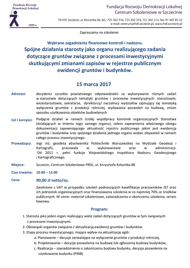 Zapraszamy na szkolenie: Wybrane zagadnienia finansowe kontroli i nadzoru. Spójne działania starosty jako organu realizującego zadania dotyczące gruntów związane z procesami inwestycyjnymi skutkującymi zmianami zapisów w rejestrze publicznym ewidencji gruntów i budynków. 15 marca 2017 Adresaci: decydenci szczebla powiatowego odpowiedzialni za wykonywanie różnych zadań w starostwie dotyczących tematyki gruntów i procesów inwestycyjnych: starostowie, wicestarostowie, sekretarze, dyrektorzy/ naczelnicy wydziałów zajmujący się tematyką wyłączenia gruntów z produkcji rolniczej, wydawania pozwoleń na budowę, zmian sposobu użytkowania obiektów budowlanych Cel i korzyści: Podjęcie działań w ramach ścisłej współpracy komórek organizacyjnych Starostwa (działających w imieniu tego samego organu), celem zapewnienia właściwego obiegu dokumentacji zapewniającego aktualność rejestru publicznego jakim jest ewidencja gruntów i budynków oraz spójnego działania jednego organu wobec obywateli w ramach całego procesu inwestycyjnego. Prowadzący: mgr inż. geodeta absolwentka Politechniki Warszawskiej na Wydziale Geodezji i Kartografii, pracowała w wykonawstwie oraz w administracji. Od 2011 r. pełni funkcje Wojewódzkiego Inspektora Nadzoru Geodezyjnego i Kartograficznego. Miejsce: Szczecin, Centrum Szkoleniowe FRDL, ul. Krzysztofa Kolumba 86 Czas trwania: 10.00 – 13.00 Cena: 90,00 zł netto/os. Zwolnione z VAT w przypadku szkoleń podnoszących kwalifikacje pracowników JST oraz ich jednostek organizacyjnych oraz finansowania szkolenia w co najmniej 70% ze środków publicznych. W cenie: materiał szkoleniowe, zaświadczenia o ukończeniu szkolenia, serwis kawowy. Program: 1. Starosta jako jeden organ realizujący wiele zadań dotyczących gruntów w tym związanych z procesami inwestycyjnymi. 2. Obowiązki organów związane z aktualizacją ewidencji gruntów i budynków. 3. Etapy procesu inwestycyjnego, mające wpływ na aktualizację egib: a. Planowanie – decyzje zezwalające na wyłączenie gruntów z produkcji rolniczej, b. Projektowanie – decyzje pozwolenia na budowę lub zgłoszenia budowy budynków, c. Realizacja – zawiadomienie o zakończeniu budowy budynku, decyzja pozwolenia na użytkowanie budynku (PINB) d. Użytkowanie – zmiana sposobu użytkowania obiektów budowlanych, rozbiórka budynku 4.Funkcja budynku i jej wpływ na ujawnienie użytku gruntowego. 5. Zagadnienia istotne: teren biologicznie czynny, użytek gruntowy, faktyczne wyłączenie gruntów rolnych z produkcji rolniczej