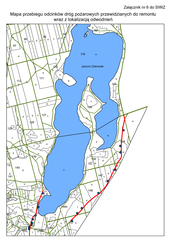 Załącznik nr 6 do SIWZ Mapa przebiegu odcinków dróg pożarowych przewidzianych do remontu wraz z lokalizacją odwodnień c d c b 96 97 d a f b d c f 95 g b a c d m f i j 93 l 112 111 a b k f a d b g b 125 a c a b b d h f f a c 139 h b k a k j a a m n 150 p f h j i l c 151 d i d g k 160h j b c f g a r x f i s d 158 b c h a b g f 157 a b i d f h c 148 c b 149 g a159 c 147 c a d f d f d g b a t 138 d h j f j i c o w i c 137 c g i b d f 141 b a i g g h f a c b h 140 g f a h h d g b c b d a f d f c 126 d g c a b 128 b a f a 127 c a b c d 129 f c Jezioro Ostrowite c b a 152 d k 176 110 113 f a b c g a a f 94 j b a g