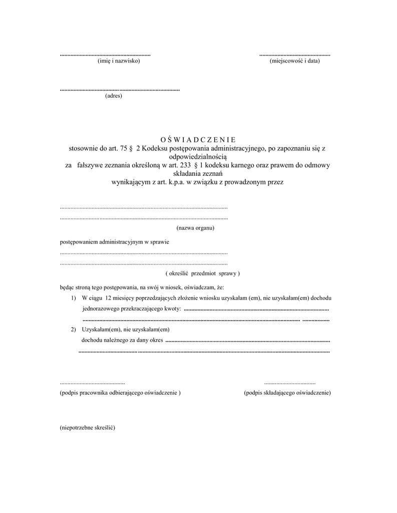 ............................................................ (imię i nazwisko) ............................................... (miejscowość i data) ............................................................................... (adres) OŚWIADCZENIE stosownie do art. 75 § 2 Kodeksu postępowania administracyjnego, po zapoznaniu się z odpowiedzialnością za fałszywe zeznania określoną w art. 233 § 1 kodeksu karnego oraz prawem do odmowy składania zeznań wynikającym z art. k.p.a. w związku z prowadzonym przez ............................................................................................................... ............................................................................................................... (nazwa organu) postępowaniem administracyjnym w sprawie ............................................................................................................... ............................................................................................................... ( określić przedmiot sprawy ) będąc stroną tego postępowania, na swój w niosek, oświadczam, że: 1) W ciągu 12 miesięcy poprzedzających złożenie wniosku uzyskałam (em), nie uzyskałam(em) dochodu jednorazowego przekraczającego kwoty: ................................................................................................ ................................................................................................................................................ .................. 2) Uzyskałam(em), nie uzyskałam(em) dochodu należnego za dany okres ............................................................................................................. ....................................... ............................................................................................................................... ........................................... (podpis pracownika odbierającego oświadczenie ) (niepotrzebne skreślić) .................................. (podpis składającego oświadczenie)