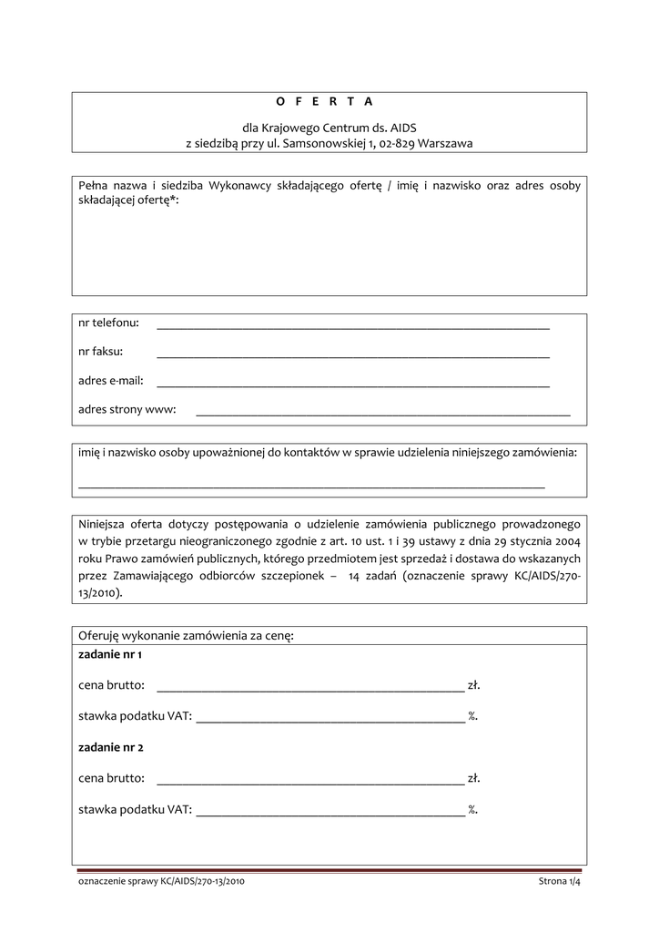 O F E R T A dla Krajowego Centrum ds. AIDS z siedzibą przy ul. Samsonowskiej 1, 02-829 Warszawa Pełna nazwa i siedziba Wykonawcy składającego ofertę / imię i nazwisko oraz adres osoby składającej ofertę*: nr telefonu: ________________________________________________________________ nr faksu: ________________________________________________________________ adres e-mail: ________________________________________________________________ adres strony www: _____________________________________________________________ imię i nazwisko osoby upoważnionej do kontaktów w sprawie udzielenia niniejszego zamówienia: ____________________________________________________________________________ Niniejsza oferta dotyczy postępowania o udzielenie zamówienia publicznego prowadzonego w trybie przetargu nieograniczonego zgodnie z art. 10 ust. 1 i 39 ustawy z dnia 29 stycznia 2004 roku Prawo zamówień publicznych, którego przedmiotem jest sprzedaż i dostawa do wskazanych przez Zamawiającego odbiorców szczepionek – 14 zadań (oznaczenie sprawy KC/AIDS/27013/2010). Oferuję wykonanie zamówienia za cenę: zadanie nr 1 cena brutto: ________________________________________________ zł. stawka podatku VAT: __________________________________________ %. zadanie nr 2 cena brutto: ________________________________________________ zł. stawka podatku VAT: __________________________________________ %. oznaczenie sprawy KC/AIDS/270-13/2010 Strona 1/4 zadanie nr 3 cena brutto: ________________________________________________ zł. stawka podatku VAT: __________________________________________ %. zadanie nr 4 cena brutto: ________________________________________________ zł. stawka podatku VAT: __________________________________________ %. zadanie nr 5 cena brutto: ________________________________________________ zł. stawka podatku VAT: __________________________________________ %. zadanie nr 6 cena brutto: ________________________________________________ zł. stawka podatku VAT: __________________________________________ %. zadanie nr 7 cena brutto: ________________________________________________ zł. stawka podatku VAT: __________________________________________ %. zadanie nr 8 cena brutto: ________________________________________________ zł. stawka podatku VAT: __________________________________________ %. zadanie nr 9 cena brutto: ________________________________________________ zł. stawka podatku VAT: __________________________________________ %. zadanie nr 10 cena brutto: ________________________________________________ zł. stawka podatku VAT: __________________________________________ %. oznaczenie sprawy KC/AIDS/270-13/2010 Strona 2/4 zadanie nr 11 cena brutto: ________________________________________________ zł. stawka podatku VAT: __________________________________________ %. zadanie nr 12 cena brutto: ________________________________________________ zł. stawka podatku VAT: __________________________________________ %. zadanie nr 13 cena brutto: ________________________________________________ zł. stawka podatku VAT: __________________________________________ %. zadanie nr 14 cena brutto: ________________________________________________ zł. stawka podatku VAT: __________________________________________ %. Oświadczam, iż oferowane szczepionki posiadać będą co najmniej 6 miesięczny termin ważności licząc od dnia ich przekazania do odbiorów docelowych. Oświadczam, iż akceptuje termin płatności wynoszący 30 dni licząc od dnia wykonania zamówienia w zakresie dostawy produktów leczniczych do magazynu depozytowego KC AIDS w lokalizacji hurtowni farmaceutycznej Wykonawcy i dostarczenia do siedziby Zamawiającego prawidłowo wystawionej faktury oraz potwierdzeń wykonania dostawy. Oświadczam, że zapoznałem się ze specyfikacją istotnych warunków zamówienia i tym zobowiązuję się spełnić wszystkie zawarte w niej warunki. Oświadczam, że uzyskałem od Zamawiającego wszelkie informacje i wyjaśnienia niezbędne do prawidłowego przygotowania oferty. Oświadczam, że akceptuję załączony do specyfikacji istotnych warunków zamówienia projekt umowy. Jednocześnie zobowiązuję się w przypadku wyboru złożonej przeze mnie oferty podpisać umowę bez zastrzeżeń, w siedzibie Zamawiającego w terminie przez Niego wyznaczonym. oznaczenie sprawy KC/AIDS/270-13/2010 Strona 3/4 Oświadczam, że jestem związany niniejszą ofertą w terminie 90 dni licząc od dnia upływu terminu składania ofert. Do oferty załączam listę podwykonawców, jeżeli zamierzam powierzyć im wykonywanie części zamówienia. Pod groźbą odpowiedzialności karnej oświadczam, że załączone do oferty dokumenty opisują stan prawny i faktyczny aktualny na dzień otwarcia ofert. * - niepotrzebne skreślić załączniki: 1. _____________________________________ 2. _____________________________________ 3. _____________________________________ 4. _____________________________________ 5. _____________________________________ 6. _____________________________________ 7. _____________________________________ 8. _____________________________________ _______________, dnia _______________, _________________________________________ (czytelny podpis lub pieczęć i podpis osoby upoważnionej do występowania w imieniu Wykonawcy) oznaczenie sprawy KC/AIDS/270-13/2010 Strona 4/4