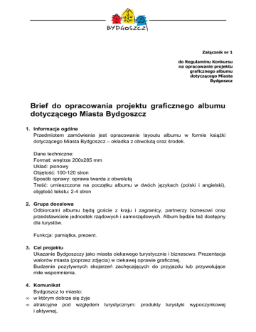 Załącznik nr 1 do Regulaminu Konkursu na opracowanie projektu graficznego albumu dotyczącego Miasta Bydgoszcz Brief do opracowania projektu graficznego albumu dotyczącego Miasta Bydgoszcz 1. Informacje ogólne Przedmiotem zamówienia jest opracowanie layoutu albumu w formie książki dotyczącego Miasta Bydgoszcz – okładka z obwolutą oraz środek. Dane techniczne: Format: wnętrze 200x285 mm Układ: pionowy Objętość: 100-120 stron Sposób oprawy: oprawa twarda z obwolutą Treść: umieszczona na początku albumu w dwóch językach (polski i angielski), objętość tekstu: 2-4 stron 2. Grupa docelowa Odbiorcami albumu będą goście z kraju i zagranicy, partnerzy biznesowi oraz przedstawiciele jednostek rządowych i samorządowych. Album będzie też dostępny dla turystów. Funkcja: pamiątka, prezent. 3. Cel projektu Ukazanie Bydgoszczy jako miasta ciekawego turystycznie i biznesowo. Prezentacja walorów miasta (poprzez zdjęcia) w ciekawej oprawie graficznej. Budzenie pozytywnych skojarzeń zachęcających do przyjazdu lub przywołujące miłe wspomnienia. 4. Komunikat Bydgoszcz to miasto: • w którym dobrze się żyje • atrakcyjne pod względem turystycznym: produkty turystyki wypoczynkowej i aktywnej, • • aktywne sportowo i kulturalnie – uznane wydarzenia kulturalne i sportowe o randze międzynarodowej oraz krajowej o ugruntowanej pozycji na mapie kulturalnej i sportowej Polski, z potencjałem biznesowym. Ważnym aspektem jest położenie miasta nad wodą. Rzeka Brda stanowi potencjał turystyczny oraz komunikacyjny. 5. • • • • Koncepcja i cechy projektu graficznego przejrzystość, prostota, schludność, elegancja, grafika nowoczesna, ale nie surowa, subtelne elementy graficzne. Album może być podzielony tematycznie w sposób jednoznaczny lub tematyka może „przenikać” z jednej w drugą. • • • • • Bloki tematyczne: architektura i przestrzeń – miejsca ciekawe turystycznie (tu także tereny zielone, pomniki, detale architektoniczne…) wydarzenia – kultura i sport atrakcje turystyczne biznes – Bydgoski Park Przemysłowo-Technologiczny, inwestycje drogowe, obecność w Bydgoszczy międzynarodowych firm itp. bydgoszcz – Miasto nad wodą (rzeka Brda).