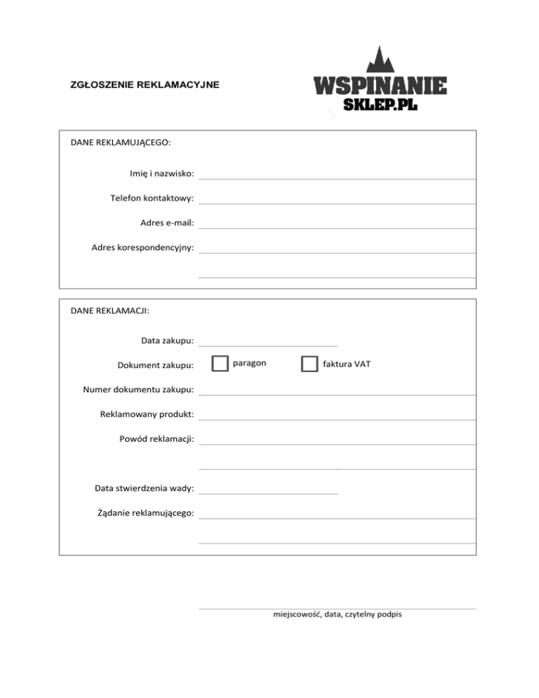 ZGŁOSZENIE REKLAMACYJNE DANE REKLAMUJĄCEGO: Imię i nazwisko: Telefon kontaktowy: Adres e-mail: Adres korespondencyjny: DANE REKLAMACJI: Data zakupu: Dokument zakupu: paragon faktura VAT Numer dokumentu zakupu: Reklamowany produkt: Powód reklamacji: Data stwierdzenia wady: Żądanie reklamującego: miejscowość, data, czytelny podpis