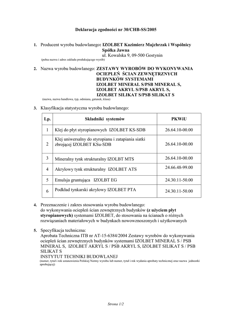 Deklaracja zgodności nr 30/CHB-SS/2005 1. Producent wyrobu budowlanego: IZOLBET Kazimierz Majchrzak i Wspólnicy Spółka Jawna ul. Kowalska 9, 09-500 Gostynin (pełna nazwa i adres zakładu produkującego wyrób) 2. Nazwa wyrobu budowlanego: ZESTAWY WYROBÓW DO WYKONYWANIA OCIEPLEŃ ŚCIAN ZEWNĘTRZNYCH BUDYNKÓW SYSTEMAMI IZOLBET MINERAL S/PSB MINERAL S, IZOLBET AKRYL S/PSB AKRYL S, IZOLBET SILIKAT S/PSB SILIKAT S (nazwa, nazwa handlowa, typ, odmiana, gatunek, klasa) 3. Klasyfikacja statystyczna wyrobu budowlanego: Lp. Składniki systemów PKWiU 1 Klej do płyt styropianowych IZOLBET KS-SDB 26.64.10-00.00 2 Klej uniwersalny do styropianu i zatapiania siatki zbrojącej IZOLBET KSu-SDB 26.64.10-00.00 3 Mineralny tynk strukturalny IZOLBT MTS 26.64.10-00.00 4 Akrylowy tynk strukturalny IZOLBET ATS 24.66.48-99.00 5 Emulsja gruntująca IZOLBT EG 24.30.11-50.00 6 Podkład tynkarski akrylowy IZOLBET PTA 24.30.11-50.00 4. Przeznaczenie i zakres stosowania wyrobu budowlanego: do wykonywania ociepleń ścian zewnętrznych budynków (z użyciem płyt styropianowych) systemami IZOLBET, do stosowania na ścianach o różnych rozwiązaniach materiałowych w budynkach nowowznoszonych i użytkowanych 5. Specyfikacja techniczna: Aprobata Techniczna ITB nr AT-15-6384/2004 Zestawy wyrobów do wykonywania ociepleń ścian zewnętrznych budynków systemami IZOLBET MINERAL S / PSB MINERAL S, IZOLBET AKRYL S / PSB AKRYL S, IZOLBET SILIKAT S / PSB SILIKAT S INSTYTUT TECHNIKI BUDOWLANEJ (numer, tytuł i rok ustanowienia Polskiej Normy wyrobu lub numer, tytuł i rok wydania aprobaty technicznej oraz nazwa jednostki aprobującej) Strona 1/2 6. Deklarowane cechy techniczne typu wyrobu budowlanego: MINERAL S Lp. 1 1. 2. 3. 4. 5. 6. 7. 8. Właściwości 2 Wodochłonność g/m2: - po 8 h, - po 24 h Mrozoodporność Odporność na starzenie Przyczepność międzywarstwowa, MPa: - warunki powietrzno-suche, - po cyklach mrozoodporności Odporność na uderzenie, J: - warunki powietrzno-suche, - po badaniach starzeniowych Opór dyfuzyjny względny warstwy wierzchniej, m Szczelność warstwy wierzchniej („funkcjonalność”) Klasyfikacja ogniowa w zakresie stopnia rozprzestrzeniania ognia przez ściany Wymagania układy ociepleniowe IZOLBET / PSB AKRYL S rodzaje wypraw SILIKAT S IZOLBET MTS BARANEK i KORNIK, IZOLBET ATS BARANEK i KORNIK IZOLBET STS BARANEK i KORNIK 3 4 5 ≤ 600 ≤ 1000 ≤ 600 ≤ 1000 ≤ 600 ≤ 1000 próbki po badaniach nie powinny wykazywać zmian ≥ 0,1 ≥ 0,1 ≥ 0,1 ≥ 0,1 ≥ 0,1 ≥ 0,1 ≥1 ≥1 ≥3 ≥3 ≥1 ≥1 ≤ 0,5 ≤1 ≤ 0,5 brak rys i zawilgocenia spodniej strony warstwy wierzchniej układy nierozprzestrzeniające ognia, o grubości płyt styropianowych ≤ 200 mm, o gęstości ≥15 kg/m3 i grubości wyprawy tynkarskiej ≥1,5 mm 7. Nazwa i numer akredytowanej jednostki certyfikującej lub laboratorium oraz numer certyfikatu lub numer raportu z badań typu, jeżeli taka jednostka brała udział w zastosowanym systemie oceny zgodności wyrobu budowlanego: System oceny zgodności 2+ INSTYTUT TECHNIKI BUDOWLANEJ AC 020, AC 072 Certyfikat Zakładowej Kontroli Produkcji Nr ITB-0025/Z Deklaruję z pełną odpowiedzialnością, że ze specyfikacją techniczną wskazaną w pkt 5. Strona 2/2 wyrób budowlany jest zgodny