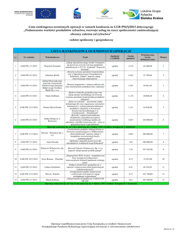 Lista rankingowa ocenionych operacji w ramach konkursu nr LGR-PW/1/2013 dotyczącego „Podnoszenia wartości produktów rybactwa, rozwoju usług na rzecz społeczności zamieszkującej obszary zależne od rybactwa” –sektor społeczny i gospodarczy LISTA RANKINGOWA OCENIONYCH OPERACJI Lp. Nr wniosku Wnioskodawca 1 LGR-PW-1/1/2013 Wojciech Szramek 2 LGR-PW-9/1/2013 Zdzisław Bylok LGR-PW-5/1/2013 Zakład Doświadczalny Instytutu Zootechniki Państwowego Instytutu Badawczego Grodziec Śląski Sp. z o.o. 3 4 LGR-PW-4/1/2013 5 LGR-PW-12/1/2013 6 LGR-PW-8/1/2013 7 LGR-PW-11/1/2013 8 LGR-PW-7/1/2013 9 LGR-PW-6/1/2013 10 LGR-PW-10/1/2013 11 LGR-PW-2/1/2013 12 LGR-PW-13/1/2013 13 LGR-PW-3/1/2013 Tytuł „Zakup specjalistycznego środka Transportu do przewozu żywych ryb oraz produktów schłodzonych w P.U.H. „Fishland” Wojciech Szramek” „Rozwój systemu sprzedaży bezpośredniej ryb w Specjalistycznym Gospodarstwie Rybackim „Nałęże” poprzez zakup innowacyjnego doposażenia” „Remont magazynów i miejsca odłowu ryb oraz uruchomienie produkcji ryby wędzonej” Zgodność z LSROR Liczba punktów Wnioskowana kwota dofinansowania Miejsce zgodna 15,18 64 200,00 1 zgodna 14,82 23 789,06 2 zgodna 13,61 94 861,05 3 40 888,49 4 64 036,00 5 168 000,00 6 200 000,00 7 300 000,00 8 107 285,00 9 74 423,00 10 66 254,85 11 101 780,00 12 104 580,00 13 „Budowa budynku gospodarczego oraz zakup sprzętu niezbędnego do rozwoju Maria Hoffman zgodna 11,78 systemu sprzedaży bezpośredniej produktów rybactwa” „Ryby na warsztat! – utworzenie studia kulinarnego K6 oraz organizacja warsztatów kulinarnych z wykorzystaniem lokalnych Dorota Maria Proske zgodna 11,21 produktów rybackich w Przestrzeni Kreatywnej Kotulińskiego 6 w Czechowicach – Dziedzicach” „Rozwój i wsparcie prowadzonej działalności gospodarczej poprzez Kółko Rolnicze w uruchomienie mobilnego punktu do zgodna 10,67 Bestwince sprzedaży i obróbki termicznej ryb – wraz ze specjalistycznym wyposażeniem” Operacje oznaczone lp. od 1 do 6 mieszczą się w limicie 120% środków dostępnych w konkursie „Uruchomienie punktów obsługi klienta w browarze restauracyjnym w Multicentrum Browar - Dziedzice Sp. z „Stara Kablownia” poprzez zakup 3 zgodna 10,63 o.o. kompletów nowoczesnych barów restauracyjnych” „Spokojna i pogodna jesień życia dla Anna Szweda zgodna 7,83 mieszkańców Lokalnych Grup Rybackich” Piekarnia Wilamowice Sp. z o.o. „Rozwój Piekarni Wilamowice Sp. z o.o. poprzez zakup sprzętu produkcyjnego” zgodna 7,76 „Doposażenie Willi Aviator - kompleksowej bazy noclegowej połączonej z Sawa Roman – Pleschko zgodna 6,72 innowacyjnymi formami spędzania wolnego czasu” Podjęcie działalności gospodarczej w Łukasz Sztafiński zakresie wykonywania robót budowlanych zgodna 6,47 wykończeniowych” „Uruchomienie punktu laminowania Marcin Wakuła i szlifowania szyb poprzez zakup zgodna 6,17 niezbędnego wyposażenia” „Zakup koparki kompaktowej TAKEUCHI Marek Kobiela zgodna 5,61 TB 228” Operacje oznaczone lp. od 7 do 13 nie mieszczą się w limicie 120% środków dostępnych w konkursie Operacja współfinansowana przez Unię Europejską ze środków finansowych Europejskiego Funduszu Rybackiego zapewniającą inwestycje w zrównoważone rybołówstwo Strona 1 z 1