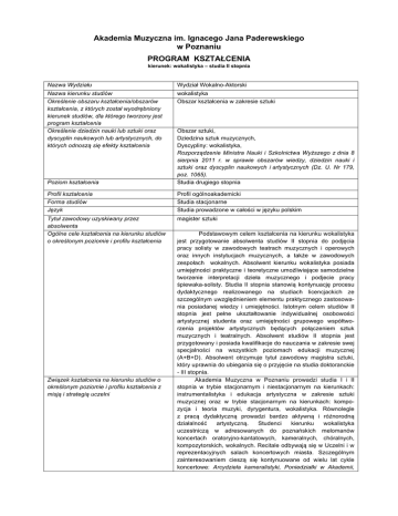 Akademia Muzyczna im. Ignacego Jana Paderewskiego w Poznaniu PROGRAM KSZTAŁCENIA kierunek: wokalistyka – studia II stopnia Nazwa Wydziału Wydział Wokalno-Aktorski Nazwa kierunku studiów Określenie obszaru kształcenia/obszarów kształcenia, z których został wyodrębniony kierunek studiów, dla którego tworzony jest program kształcenia Określenie dziedzin nauki lub sztuki oraz dyscyplin naukowych lub artystycznych, do których odnoszą się efekty kształcenia wokalistyka Obszar kształcenia w zakresie sztuki Poziom kształcenia Obszar sztuki, Dziedzina sztuk muzycznych, Dyscypliny: wokalistyka, Rozporządzenie Ministra Nauki i Szkolnictwa Wyższego z dnia 8 sierpnia 2011 r. w sprawie obszarów wiedzy, dziedzin nauki i sztuki oraz dyscyplin naukowych i artystycznych (Dz. U. Nr 179, poz. 1065). Studia drugiego stopnia Profil kształcenia Forma studiów Język Profil ogólnoakademicki Studia stacjonarne Studia prowadzone w całości w języku polskim Tytuł zawodowy uzyskiwany przez absolwenta Ogólne cele kształcenia na kierunku studiów o określonym poziomie i profilu kształcenia magister sztuki Związek kształcenia na kierunku studiów o określonym poziomie i profilu kształcenia z misją i strategią uczelni Podstawowym celem kształcenia na kierunku wokalistyka jest przygotowanie absolwenta studiów II stopnia do podjęcia pracy solisty w zawodowych teatrach muzycznych i operowych oraz innych instytucjach muzycznych, a także w zawodowych zespołach wokalnych. Absolwent kierunku wokalistyka posiada umiejętności praktyczne i teoretyczne umożliwiające samodzielne tworzenie interpretacji dzieła muzycznego i podjecie pracy śpiewaka-solisty. Studia II stopnia stanowią kontynuację procesu dydaktycznego realizowanego na studiach licencjackich ze szczególnym uwzględnieniem elementu praktycznego zastosowania posiadanej wiedzy i umiejętności. Istotnym celem studiów II stopnia jest pełne ukształtowanie indywidualnej osobowości artystycznej studenta oraz umiejętności grupowego współtworzenia projektów artystycznych będących połączeniem sztuk muzycznych i teatralnych. Absolwent studiów II stopnia jest przygotowany i posiada kwalifikacje do nauczania w zakresie swej specjalności na wszystkich poziomach edukacji muzycznej (A+B+D). Absolwent otrzymuje tytuł zawodowy magistra sztuki, który uprawnia do ubiegania się o przyjęcie na studia doktoranckie - III stopnia. Akademia Muzyczna w Poznaniu prowadzi studia I i II stopnia w trybie stacjonarnym i niestacjonarnym na kierunkach: instrumentalistyka i edukacja artystyczna w zakresie sztuki muzycznej oraz w trybie stacjonarnym na kierunkach: kompozycja i teoria muzyki, dyrygentura, wokalistyka. Równolegle z pracą dydaktyczną prowadzi bardzo aktywną i różnorodną działalność artystyczną. Studenci kierunku wokalistyka uczestniczą w adresowanych do poznańskich melomanów koncertach oratoryjno-kantatowych, kameralnych, chóralnych, kompozytorskich, wokalnych. Recitale odbywają się w Uczelni i w reprezentacyjnych salach koncertowych miasta. Szczególnym zainteresowaniem cieszą się kontynuowane od wielu lat cykle koncertowe: Arcydzieła kameralistyki, Poniedziałki w Akademii, Różnice w stosunku do innych programów o podobnie zdefiniowanych celach i efektach kształcenia prowadzonych na uczelni Pedagodzy i studenci, Wtorki wokalne, Musica Sacra, Letnie koncerty ratuszowe, Festiwal Mozartowski, coroczna gala operowa dla Towarzystwa Przyjaciół Wilna, cykliczne koncerty wokalne w Muzeum F. Nowowiejskiego w Willi wśród Róż, przedstawienia operowe, koncerty w Pałacu Działyńskich i Pałacu w Kórniku. Jedną z najważniejszych sfer aktywności Akademii Muzycznej im. I. J. Paderewskiego stanowi współpraca międzynarodowa, a formy kontaktów z zagranicą mają charakter wielokierunkowy i komplementarny. Umożliwiają one wymianę artystyczną, naukową oraz pedagogiczną pracowników i studentów w oparciu o umowy dwustronne pomiędzy uczelniami. Realizując umowę zawartą z Agencją Narodową FRSE z siedzibą w Warszawie, Akademia Muzyczna im. I. J. Paderewskiego umożliwia wymianę pracowników oraz studentów z uczelniami partnerskimi w Europie w ramach programu Erasmus Współpraca artystyczna, naukowa i dydaktyczna na kierunku wokalistyka realizowana jest w takich formach działania, jak: – występy gościnne (w Poznaniu) pedagogów, studentów i zespołów muzycznych z uczelni zagranicznych; – koncerty pedagogów, studentów i zespołów muzycznych za granicą; – wyjazdy studentów do uczelni zagranicznych w celu realizowania programu edukacyjnego; – przyjmowanie studentów z uczelni zagranicznych na studia w poznańskiej Uczelni; – prowadzenie kursów, klas mistrzowskich, konferencji, seminariów, warsztatów i wykładów Reasumując, pedagodzy i studenci kierunku wokalistyka aktywnie uczestniczą w życiu kulturalnym i naukowym miasta, Wielkopolski i kraju. Prowadzą działalność koncertową i nagraniową, badania naukowe. Współpracują z licznymi uczelniami zagranicznymi. O randze oraz prestiżu kierunku świadczą laury studentów i absolwentów na konkursach krajowych i zagranicznych oraz zaproszenia pedagogów do prowadzenia kursów mistrzowskich oraz prac jury międzynarodowych konkursów wokalnych. Kierunek wokalistyka zorientowany jest na wykształcenie profesjonalnego śpiewaka solisty i aktora scen muzycznych. Z tego założenia wynikają różnice w stosunku do innych kierunków prowadzonych w Akademii Muzycznej. Jest to jedyny kierunek na uczelni, na którym oprócz predyspozycji ogólnomuzycznych rozwijanych podczas studiów, główny nacisk położony jest na kształtowanie naturalnego, własnego instrumentarium jakim jest głos ludzki, zarówno jeśli chodzi o jego strukturę i budowę, jak i umiejętności techniczne. Kształtowanie osobowości artystycznej śpiewaka jest również bardzo zindywidualizowane i znacznie odbiega od innych kierunków prowadzon