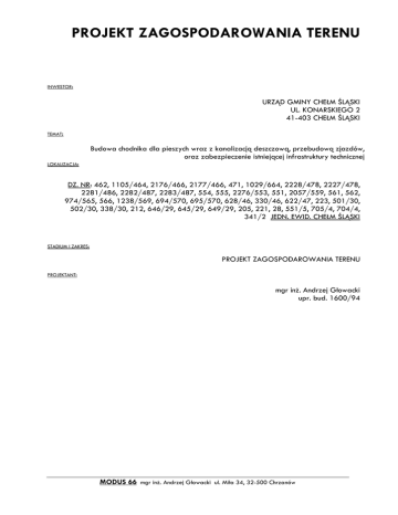 PROJEKT ZAGOSPODAROWANIA TERENU INWESTOR: URZĄD GMINY CHEŁM ŚLĄSKI UL. KONARSKIEGO 2 41-403 CHEŁM ŚLĄSKI TEMAT: Budowa chodnika dla pieszych wraz z kanalizacją deszczową, przebudową zjazdów, oraz zabezpieczenie istniejącej infrastruktury technicznej LOKALIZACJA: DZ. NR: 462, 1105/464, 2176/466, 2177/466, 471, 1029/664, 2228/478, 2227/478, 2281/486, 2282/487, 2283/487, 554, 555, 2276/553, 551, 2057/559, 561, 562, 974/565, 566, 1238/569, 694/570, 695/570, 628/46, 330/46, 622/47, 223, 501/30, 502/30, 338/30, 212, 646/29, 645/29, 649/29, 205, 221, 28, 551/5, 705/4, 704/4, 341/2 JEDN. EWID. CHEŁM ŚLĄSKI STADIUM I ZAKRES: PROJEKT ZAGOSPODAROWANIA TERENU PROJEKTANT: mgr inż. Andrzej Głowacki upr. bud. 1600/94 MODUS 66 mgr inż. Andrzej Głowacki ul. Miła 34, 32-500 Chrzanów SPIS TREŚCI: 1. PODSTAWA PRAWNA DLA POSTĘPOWANIA POPRZEDZAJĄCEGO ROZPOCZĘCIE ROBÓT BUDOWLANYCH ZGODNIE Z USTAWĄ Z DNIA 7 LIPCA 1994 PRAWO BUDOWLANE. .............. 3 2. PRZEDMIOT INWESTYCJI, ZAKRES RZECZOWY PRZEDMIOTU INWESTYCJI ........................... 3 3. ZAGOSPODAROWANIE TERENU W STANIE OBECNYM ......................................................... 6 3.1 3.2 Branża drogowa ............................................................................................................... 6 Infrastruktura techniczna .................................................................................................... 6 4. WARUNKI GRUNTOWE I WODNE. ......................................................................................... 6 5. PROJEKTOWANE ZAGOSPODAROWANIE TERENU ............................................................... 8 5.1 5.2 5.3 5.4 5.5 5.6 6 Drogi ................................................................................................................................. 8 Tereny zielone. .................................................................................................................. 8 Wyłączenia z produkcji rolnej. .......................................................................................... 8 Projektowana inwestycja a osoby trzecie ......................................................................... 8 Podstawowe parametry techniczne projektowanego obiektu. .......................................... 8 Branża wodno-kanalizacyjna. ........................................................................................... 9 ZESTAWIENIE POWIERZCHNI POSZCZEGÓLNYCH CZĘŚCI ZAGOSPODAROWANIA. .......... 9 7 INFORMACJE DOTYCZĄCE WPISU DO REJESTRU KONSERWATORA ZABYTKU ORAZ OCHRONIE WYNIKAJĄCEJ Z MPZP. ............................................................................................... 9 8 OCHRONA GRUNTÓW ROLNYCH I LEŚNYCH. ....................................................................... 9 9 WARUNKI GEOTECHNICZNE I GÓRNICZE. ............................................................................. 9 10 WPŁYW INWESTYCJI NA ŚRODOWISKO ORAZ HIGIENY I ZDROWIA UŻYTKOWNIKÓW PROJEKTOWANEGO OBIEKTU. .................................................................................................... 10 11 ZIELEŃ. .................................................................................................................................... 10 12 OBSZAR ODDZIAŁYWANIA NA DZIAŁKI SĄSIEDNIE. ............................................................. 10 13 INFARMACJE DOTYCZĄCE MAS ZIEMNYCH. ......................................................................... 11 14 INNE KONIECZNE DANE WYNIKAJĄCE ZE SPECYFIKI, CHARAKTERU ORAZ STOPNIA SKOMPLIKOWANIA OBIEKTU BUDOWLANEGO LUB ROBÓT BUDOWLANYCH. ........................ 11 14.1 14.2 14.3 Wpływ w zakresie hałasu i zanieczyszczenia powietrza. ........................................... 11 Wpływ na świat roślinny i zwierzęcy........................................................................... 11 Wpływ w zakresie wód powierzchniowych. ................................................................ 12 15 OBSŁUGA OSÓB NIEPEŁNOSPRAWNYCH. ........................................................................... 12 MODUS 66 mgr inż. Andrzej Głowacki ul. Miła 34, 32-500 Chrzanów 1. PODSTAWA PRAWNA DLA POSTĘPOWANIA POPRZEDZAJĄCEGO ROZPOCZĘCIE ROBÓT BUDOWLANYCH ZGODNIE Z USTAWĄ Z DNIA 7 LIPCA 1994 PRAWO BUDOWLANE. Podstawą opracowania niniejszej dokumentacji projektowej jest: - Ustawa z dnia 21 marca 1985 r. o drogach publicznych - Rozporządzenie Ministra Transportu i Gospodarki Morskiej z dnia 30 maja 2000 roku w sprawie warunków technicznych, jakimi powinny odpowiadać drogowe obiekty inżynierskie i ich usytuowanie (Dz. U. Nr 63, poz. 735); - Rozporządzenie Ministra Transportu i Gospodarki Morskiej z dnia 2 marca 1999 r. w sprawie warunków technicznych, jakim powinny odpowiadać drogi publiczne i ich usytuowanie (Dz. U. Nr 43 poz. 430). - Rozporządzenie MTiGM oraz SWiA z dnia 21 czerwca 2002 w sprawie znaków i sygnałów drogowych - Rozporządzenie Ministra Infrastruktury z dnia 23 września 2003 w sprawie szczegółowych warunków zarządzania ruchem na drogach oraz wykonania nadzoru nad tym zarządzaniem. - Rozporządzenie Ministra Infrastruktury z dnia 3 lipca 2003 r. w sprawie szczegółowego zakresu i formy projektu budowlanego (Dz. U. Nr 120 poz. 1133) - Aktualny podkład mapowy, sytuacyjno - wysokościowy - mapa do celów projektowych w skali 1:500 wykonana przez Firma Geodezyjna - Mapa topograficzna w skali 1:10 000 - Mapa ewidencyjna - Wypisy z rejestru ewidencji gruntów dla działek objętych opracowaniem i sąsiednich - Uzgodnienia zawarte z inwestorem - Wizje lokalne i pomiary uzupełniające w terenie - Normy: - PN-87 S-02201 DROGI SAMOCHODOWE. Nawierzchnie drogowe. Pod4 S-96023 KONSTRUKCJE DROGOWE. Podbudowa i nawierzchnie z tłucznia kamiennego. - PN-73 S-02202 PRZEPUSTY. Podział, nazwy, określenia. - PN-85/S-10030 OBIEKTY MOSTOWE. Obciążenia - PN-91/S-10042 OBIEKTY MOSTOWE. Konstrukcje betonowe, żelbetowe i spr