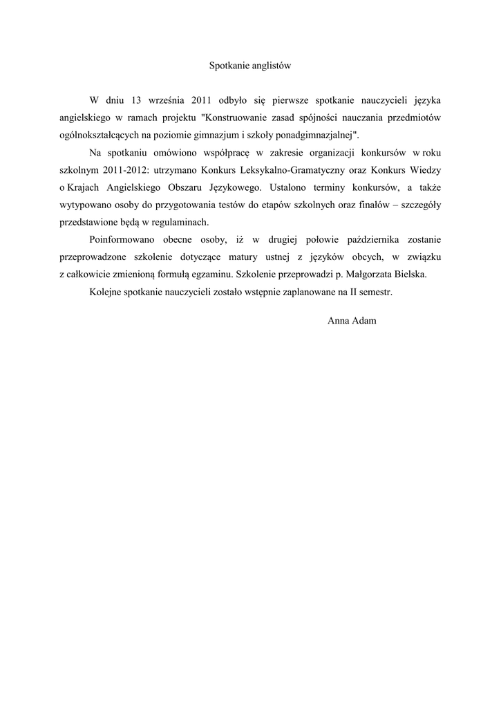 Spotkanie anglistów W dniu 13 września 2011 odbyło się pierwsze spotkanie nauczycieli języka angielskiego w ramach projektu "Konstruowanie zasad spójności nauczania przedmiotów ogólnokształcących na poziomie gimnazjum i szkoły ponadgimnazjalnej". Na spotkaniu omówiono współpracę w zakresie organizacji konkursów w roku szkolnym 2011-2012: utrzymano Konkurs Leksykalno-Gramatyczny oraz Konkurs Wiedzy o Krajach Angielskiego Obszaru Językowego. Ustalono terminy konkursów, a także wytypowano osoby do przygotowania testów do etapów szkolnych oraz finałów – szczegóły przedstawione będą w regulaminach. Poinformowano obecne osoby, iż w drugiej połowie października zostanie przeprowadzone szkolenie dotyczące matury ustnej z języków obcych, w związku z całkowicie zmienioną formułą egzaminu. Szkolenie przeprowadzi p. Małgorzata Bielska. Kolejne spotkanie nauczycieli zostało wstępnie zaplanowane na II semestr. Anna Adam