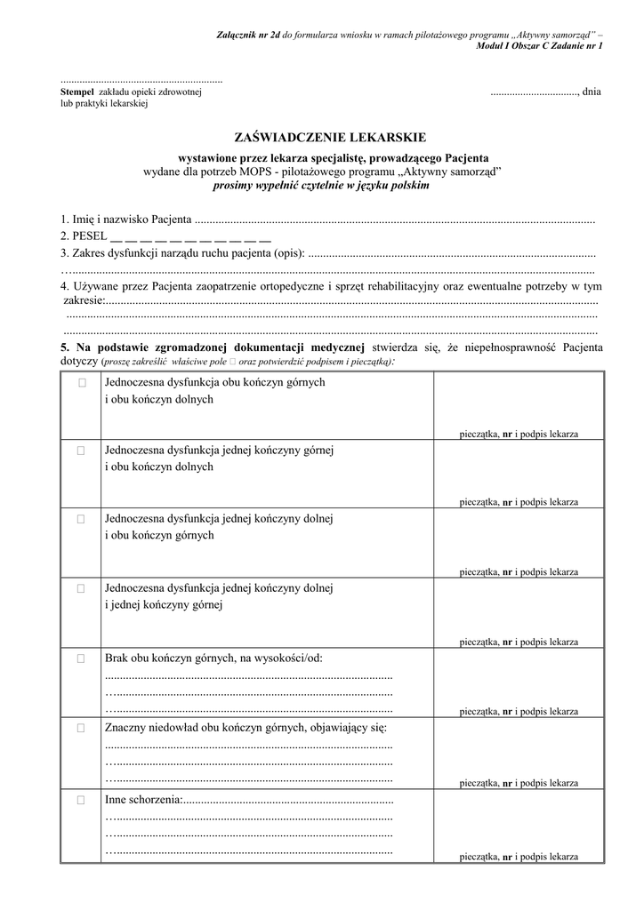 Załącznik nr 2d do formularza wniosku w ramach pilotażowego programu „Aktywny samorząd” – Moduł I Obszar C Zadanie nr 1 ............................................................ ................................, dnia Stempel zakładu opieki zdrowotnej lub praktyki lekarskiej ZAŚWIADCZENIE LEKARSKIE wystawione przez lekarza specjalistę, prowadzącego Pacjenta wydane dla potrzeb MOPS - pilotażowego programu „Aktywny samorząd” prosimy wypełnić czytelnie w języku polskim 1. Imię i nazwisko Pacjenta ....................................................................................................................................... 2. PESEL __ __ __ __ __ __ __ __ __ __ __ 3. Zakres dysfunkcji narządu ruchu pacjenta (opis): ................................................................................................. …................................................................................................................................................................................ 4. Używane przez Pacjenta zaopatrzenie ortopedyczne i sprzęt rehabilitacyjny oraz ewentualne potrzeby w tym zakresie:...................................................................................................................................................................... ................................................................................................................................................................................... .................................................................................................................................................................................... 5. Na podstawie zgromadzonej dokumentacji medycznej stwierdza się, że niepełnosprawność Pacjenta dotyczy (proszę zakreślić właściwe pole oraz potwierdzić podpisem i pieczątką): Jednoczesna dysfunkcja obu kończyn górnych i obu kończyn dolnych pieczątka, nr i podpis lekarza Jednoczesna dysfunkcja jednej kończyny górnej i obu kończyn dolnych pieczątka, nr i podpis lekarza Jednoczesna dysfunkcja jednej kończyny dolnej i obu kończyn górnych pieczątka, nr i podpis lekarza Jednoczesna dysfunkcja jednej kończyny dolnej i jednej kończyny górnej pieczątka, nr i podpis lekarza Brak obu kończyn górnych, na wysokości/od: ................................................................................................. …............................................................................................. …............................................................................................. pieczątka, nr i podpis lekarza Znaczny niedowład obu kończyn górnych, objawiający się: ................................................................................................. …............................................................................................. …............................................................................................. pieczątka, nr i podpis lekarza Inne schorzenia:....................................................................... …............................................................................................. …............................................................................................. …............................................................................................. pieczątka, nr i podpis lekarza Str. 2 Załącznika nr 2d do formularza wniosku w ramach pilotażowego programu „Aktywny samorząd” – Moduł I Obszar C Zadanie nr 1 6. Ponadto (pole obowiązkowe w przypadku Pacjenta ubiegającego się o dofinansowanie w ramach obszaru C programu) - na podstawie zgromadzonej dokumentacji medycznej stwierdza się, że: proszę zakreślić właściwe pola 1. Pacjent może poruszać się na wózku inwalidzkim o napędzie ręcznym: tak nie 2. Korzystanie z wózka o napędzie elektrycznym jest niewskazane, gdyż może spowodować wstrzymanie lub pogorszenie procesu rehabilitacji lub wpłynie niekorzystnie na sprawność kończyn górnych: tak nie 3. Przeciwwskazania do korzystania z wózka o napędzie elektrycznym (np. utraty przytomności, epilepsja): ........................................................................................... …................................................................................................................................. …................................................................................................................................ brak przeciwwskazań pieczątka, nr i podpis lekarza Dotyczy wyłącznie Wnioskodawców ubiegających się o zwiększenie kwoty dofinansowania na zakup wózka inwalidzkiego o napędzie elektrycznym Pacjent z uwagi na ograniczenia funkcjonalne, stan i zakres dysfunkcji narządu ruchu powodującej niepełnosprawność wymaga zakupu wózka inwalidzkiego o napędzie elektrycznym z ponadstandardowym wyposażeniem, w tym: (proszę zakreślić właściwe pola ) niestandardowe sterowniki umożliwiające sterowanie wózkiem za pomocą jedynie władnych części ciała jak np.: ręki, palca, brody, stopy, warg lub wdechu i wydechu powietrza itp. urządzenia umożliwiające prowadzenie wózka także przez osobę towarzyszącą (hamulec, sterownik itp.) niestandardowe siedzisko (np. z windą podnoszącą, rehabilitacyjne, zapewniające maksymalną stabilizację, przeciwodleżynowe, itp.) specjalne, regulowane (w tym elektrycznie i w różnych płaszczyznach): podnóżki, podłokietniki lub oparcia nadgarstków kliny zapobiegające zsuwaniu się Pacjenta z wózka lub podpórki boczne, peloty piersiowe zagłówek stabilizujący głowę i szyję (w kształcie litery U) specjalne pasy bezpieczeństwa (np. dwupunktowe zapinane na biodrach, czteropunktowe) taki sposób, aby wózek był indywidualnie dopasowany do sylwetki Pacjenta (np. w przypadku niestandardowego wzrostu czy wagi Pacjenta) inne elementy i urządzenia (np.