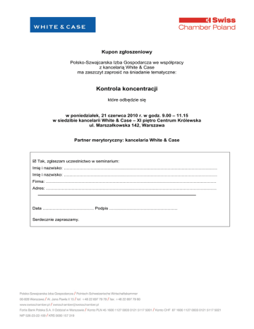 Kupon zgłoszeniowy Polsko-Szwajcarska Izba Gospodarcza we współpracy z kancelarią White & Case ma zaszczyt zaprosić na śniadanie tematyczne: Kontrola koncentracji które odbędzie się w poniedziałek, 21 czerwca 2010 r. w godz. 9.00 – 11.15 w siedzibie kancelarii White & Case – XI piętro Centrum Królewska ul. Marszałkowska 142, Warszawa Partner merytoryczny: kancelaria White & Case ; Tak, zgłaszam uczestnictwo w seminarium: Imię i nazwisko: ……………………………………………………………………………………………… Imię i nazwisko: ……………………………………………………………………………………………… Firma: ………………………………………………………………………………………………………… Adres: ………………………………………………………………………………………………………… Data ……………………………… Podpis ………………………………………… Serdecznie zapraszamy. Warsaw 5065459.1