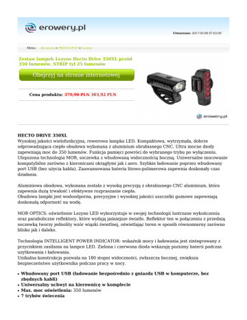 Utworzono: 2017-03-08 07:02:09 Menu: Akcesoria > PRODUCENT > Lezyne Zestaw lampek Lezyne Hecto Drive 350XL przód 350 lumenów, STRIP tył 25 lumenów Obejrzyj na stronie internetowej Cena produktu: 379,90 PLN 303,92 PLN HECTO DRIVE 350XL Wysokiej jakości wielofunkcyjna, rowerowa lampka LED. Kompaktowa, wytrzymała, dobrze odprowadzająca ciepło obudowa wykonana z aluminium obrabianego CNC. Ultra mocne diody zapewniają moc do 350 lumenów. Funkcja pamięci powróci do wybranego trybu po wyłączeniu. Ulepszona technologia MOR, soczewka z wbudowaną widocznością boczną. Uniwersalne mocowanie kompatybilne zarówno z kieronicami okrągłymi jak i aero. Szybkie ładowanie poprzez wbudowany port USB (bez użycia kabla). Zaawansowana bateria litowo-polimerowa zapewnia doskonały czas działania. Aluminiowa obudowa, wykonana została z wysoką precyzją z obrabianego CNC aluminium, która zapewnia dużą trwałość i efektywne rozpraszanie ciepła. Obudowa lampki jest wodoodporna, precyzyjne i wysokiej jakości uszczelki gumowe zapewniają doskonałą odporność na wodę. MOR OPTICS: oświetlenie Lezyne LED wykorzystuje w swojej technologii lustrzane wykończenia oraz paraboliczne reflektory, które wydają jaśniejsze światło. Reflektor ten w połączeniu z przednią soczewką tworzy jednolity wzór wiązki świetlnej, oświetlając teren w sposób równomierny zarówno blisko jak i daleko. Technologia INTELLIGENT POWER INDICATOR: wskaźnik mocy i ładowania jest zintegrowany z przyciskiem zasilania na lampce LED. Zielona i czerwona dioda wskazuję poziomy baterii podczas uzytkowania i ładowania. Unikalna konstrukcja pozwala na 180 stopni widoczności, zwłaszcza bocznej, zwiększa bezpieczeństwo użytkownika podczas pracy w nocy. ● ● ● ● Wbudowany port USB (ładowanie bezpośrednio z gniazda USB w komputerze, bez zbędnych kabli) Uniwersalny uchwyt na kierownicę w komplecie Max. moc oświetlenia: 350 lumenów 7 trybów świecenia ● ● Waga: 82 g Czas ładowania: 2:00 godziny STRIP DRIVE 25 Mocna tylna lampka rowerowa z 5 diodami LED. Lekka, wytrzymała konstrukcja. Unikalny design kompatybilny z okrągłymi i aerodynamicznymi ramami. Ultra mocne diody zapewniają moc do 25 lumenów. Funkcja pamięci powróci do wybranego trybu po wyłączeniu. Ulepszona technologia MOR, soczewka z wbudowaną widocznością boczną. Szybkie ładowanie poprzez port USB. Lezyne STRIP DRIVE 25 to kompaktowa i bardzo wytrzymała tylna lampka rowerowa. Obudowa z lekkiego i wytrzymałego materiału Composite Matrix. MOR OPTICS: oświetlenie Lezyne LED wykorzystuje w swojej technologii lustrzane wykończenia oraz paraboliczne reflektory, które wydają jaśniejsze światło. Reflektor ten w połączeniu z przednią soczewką tworzy jednolity wzór wiązki świetlnej, oświetlając teren w sposób równomierny zarówno blisko jak i daleko. Technologia INTELLIGENT POWER INDICATOR: wskaźnik mocy i ładowania jest zintegrowany z przyciskiem zasilania na lampce LED. Zielona i czerwona dioda wskazuję poziomy baterii podczas uzytkowania i ładowania. Wbudowany port USB (ładowanie bezpośrednio z gniazda USB w komputerze, bez zbędnych kabli) Uniwersalny uchwyt na kierownicę w komplecie Max. moc oświetlenia: 25 lumenów 9 trybów świecenia Waga: 69 g Wymiary: 87x37x34 mm TECHNOLOGIE: ALUMINIUM CONSTRUCTION - aluminiowa konstrukcja lampek. Kompaktowa obudowa, która jest cakowicie wykonana z wysoką precyzją z obrabianego CNC aluminium zapewnia dużą trwałość i efektywne rozpraszanie ciepła. COMPOSITE MATRIX - materiał kompozytowy Composite Matrix jest wzmocnionym materiałem o wysokiej wytrzymałości, używanym zamiast aluminium do produkcji elementów, w celu obniżenia kosztów produkcji. CNC-MACHINED / Obróbka CNC - Elementy w całości wykonane są z aluminium obrabianego CNC, co powoduje, że konstrukcja jest niezwykle precyzyjna i trwała. MEMORY MODE - Światło pozostaje w ustawieniu wyjściowym po wyłączeniu MOR OPTICS - Oświetlenie Lezyne LED wykorzystuje w swojej technologii lustrzane wykończenia oraz paraboliczne reflektory, które wydają jaśniejsze światło. Reflektor ten w połączeniu z przednią soczewką tworzy jednolity wzór wiązki świetlnej, oświetlając teren w sposób równomierny zarówno blisko jak i daleko. INTELLIGENT POWER INDICATOR - Wskaźnik mocy i ładowania jest zintegrowany z przyciskiem zasilania na lampce LED. Zielona i czerwona dioda wskazuje poziomy baterii podczas użytkowania i ładowania. USB RECHARGEABLE - Wbudowany port USB (ładowanie bezpośrednio z gniazda USB w komputerze, bez zbędnych kabli). SIDE VISIBILITY - Unikalna konstrukcja pozwala na 180 stopni widoczności, zwłaszcza bocznej, zwiększa bezpieczeństwo użytkownika podczas pracy w nocy. WATER RESISTANT - Wodoodporne, precyzyjne i wysokiej jakości uszczelki gumowe zapewniają doskonałą odporność na wodę we wszystkich lampach Lezyne LED. O marce Lezyne: Lezyne to firma znana każdemu zakręconemu maniakowi na punkcie sprzętu. Powiedzmy to od razu, maniakowi z klasą i ... kasą. Produkty bowiem tej firmy to małe dziełka sztuki. Biorąc każdy z ich produktow do ręki doświadczasz czegoś niesamowitego. Trzymasz produkt dopracowany do najmniejszego elementu z którego się składa. Do wykonania dochodzą jeszcze użyte materiały - aluminium, karbon... ach :) Lezyne została założona 1 marca 2007 roku, przez byłego triathlonistę Mickiego Kozuscheka. Na początku Kozuschek wniósł na niemiecki rynek niedrogie, wysokiej jakości rowery i odzież rowerową. Obecnie firma Lezyne jest liderem branży akcesoriów rowerowych z liczną pulą nagradzanych produktów na całym świecie. Lezyne to połączenie miłości do kolarstwa i pasji do projektowania. Producent Lezyne Rodzaj Zestaw Zasilanie Akumulator Akcesoria - Kolor Czarny_#000000 Mimo dołożenia wszelkich starań nie gwarantujemy, że publikowane opisy i specyfikacje techniczne niezawierają uchybień lub b