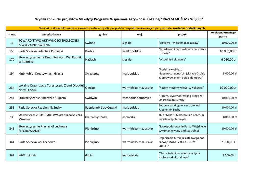 Wyniki konkursu projektów VII edycji Programu Wspierania Aktywności Lokalnej "RAZEM MOŻEMY WIĘCEJ" Wnioski zakwalifikowane w ramach preferencji dla projektów współfinansowanych przy udziale środków dodatkowych nr ew. wnioskodawca gmina woj. projekt 11 TOWARZYSTWO AKTYWNOŚCI SPOŁECZNEJ "ZWYCZAJNI" ŚWINNA Świnna śląskie "Enklawa - wiejskim plac zabaw" 159 Rada Sołecka Sołectwa Pudliszki Krobia wielkopolskie "Żyj zdrowo i bądź aktywny na ścieżce zdrowia" 170 Stowarzyszenie na Rzecz Rozwoju Wsi Rudnik w Rudniku Hażlach śląskie "Wspólnie i aktywnie" małopolskie "Rodzina w obliczu niepełnosprawności - jak radzić sobie ze sprawowaniem opieki domowej" Skrzyszów kwota przyznanego grantu 10 000,00 zł 10 000,00 zł 6 010,00 zł 194 Klub Kobiet Kreatywnych Gracja 234 Lokalna Organizacja Turystyczna Ziemi Oleckiej Olecko z/s w Olecku. warmińsko-mazurskie "Razem możemy więcej w Kukowie" 241 Stowarzyszenie Smardzko "Razem" Świdwin zachodniopomorskie "Razem, wyremontowaną drogą ze Smardzka do Europy" 10 000,00 zł 253 Rada Sołecka Rzepiennik Suchy Rzepiennik Strzyżewski małopolskie Budowa parkingu w centrum wsi Rzepiennik Suchy 10 000,00 zł 335 Stowarzyszenie LOKO-MOTYWA oraz Rada Sołecka Mikorowo Czarna Dąbrówka pomorskie Klub "Miko" - Mikorowskie Centrum Inicjatyw Społecznych 343 Stowarzyszenie Przyjaciół Lechowa "LECHOWIANIE" Pieniężno warmińsko-mazurskie "Zagospodarowanie Parku Wiejskiego Wykonanie wiaty amfiteatralnej" 10 000,00 zł 7 000,00 zł 344 Rada Sołecka wsi Lechowo Pieniężno warmińsko-mazurskie Organizacja turnieju siatkowego pod nazwą "MAŁA SZKOŁA - DUŻY SUKCES" 363 KGW Lipińskie Gąbin mazowieckie "Nasza świetlica - miejscem życia społeczno-kulturalnego" 5 000,00 zł 10 000,00 zł 8 000,00 zł 7 500,00 zł 394 OSP w Niemstowie Cieszanów podkarpackie "OSP aktywizuje społeczeństwo Niemstowa" 5 460,00 zł 423 Rada Sołecka Mełpina Dolsk wielkopolskie Budowa wiejskiego placu spotkań. 10 000,00 zł 531 Stowarzyszenie Park Inicjatyw Frysztak podkarpackie "Ziemia Strzyżowska od kuchni" 7 500,00 zł 606 Rada Sołecka Sołectwa Solanka Srokowo warmińsko-mazurskie "Świetlica - nasze miejsce" 671 Rada Sołecka wsi Strachów Sobótka dolnośląskie "Stworzenie grupy zabawowej dla dzieci we wsi Strachów" 9 250,00 zł 713 Stowarzyszenie Aktywna Wieś Wołów dolnośląskie "Koniec z nudą i chipsami - na świetlicy ćwicz dziś z nami" 9 500,00 zł 9 500,00 zł Wnioski zakwalifikowane obejmujące projekty realizowane bez udziału środków dodatkowych nr ew. wnioskodawca gmina woj. projekt kwota przyznanego grantu lubelskie "Strefa aktywności społecznej socjoterapia osób z niepełnosprawnością intelektualną i zaburzeniami psychicznymi" 5 070,00 zł Malechowo zachodniopomorskie "Dawniej a dziś - ścieżka historyczna" 3 000,00 zł Złotniki Kujawskie kujawsko-pomorskie "Kujawy, Kujawy, ty stara ziemico…" 41 Stowarzyszenie Wspierania Osób Niepełnosprawnych "Res Sacra Miser" Goscieradów 54 Rada Sołecka wsi Malechowo 58 Stowarzyszenie Na Rzecz Środowiska Lokalnego Gminy Złotniki Kujawskie "Równe Szanse" 88 Stowarzyszenie Gospodyń Wiejskich w Głogoczowie 124 Stowarzyszenie Niezależnych Inicjatyw "NASZA Juchnowiec Kościelny NATURA" podlaskie 142 Stowarzyszenie Rozwoju i Współpracy Wsi Moszczanka i Skrzebowa wielkopolskie Myślenice Raszków małopolskie "Ludowa moda - Gospodynie i Przedszkolaki kultywują lokalne zwyczaje" "Na pograniczu - warsztaty edukacyjne" "Promujemy lokalne dziedzictwo kulturalno-przyrodnicze" 7 000,00 zł 9 000,00 zł 6 100,00 zł 7 010,00 zł 143 Stowarzyszenie Pomocy Szkole Małopolska Społeczny Komitet przy Zespole Placówek Oświatowych 155 małopolskie "Przekroczyć próg sztuki" - stworzenie Teatru Młodego Aktora 7 500,00 zł Stowarzyszenie na Rzecz Rozwoju Wsi Turowo Duże Pisz warmińsko-mazurskie "Teatr Ludowy w Gminie Pisz" warsztaty i przedstawienia tradycyjnych obrzędów kulturowych 9 170,00 zł 171 Dziedzictwo Kulturowe Igrył Sokółka podlaskie "Potrawy regionalne" - zajęcia praktyczne dla młodzieży i wydanie lokalnej książki kucharskiej 7 000,00 zł 182 Rada Sołecka wsi Podwiesk Chełmno kujawsko-pomorskie 216 Stowarzyszenie Integracja Kultura Edukacja Miłakowo warmińsko-mazurskie 218 Rada Sołecka Sołectwa Bardyny Wilczeta warmińsko-mazurskie "Nasza Dolina" 223 Stowarzyszenie na rzecz rozwoju wsi Sokule Drelów lubelskie Organizacja zajęć cyrkowoteatralnych. 247 Stowarzyszenie Wspierania Rodziny "Przyjaźń" Supraśl w Supraślu podlaskie "Poznajemy świat" 316 Sołectwo Pawłów RejowiecFabryczny lubelskie Remont nawierzchni chodników 10 000,00 zł 334 Stowarzyszenie Koło Gospodyń Barwy Rokit Czarna Dąbrówka pomorskie "Jedzmy zdrowo, żyjmy dłużej" 7 500,00 zł 345 Rada Sołecka Gruszczyna Swarzędz wielkopolskie "Do szkoły z górki" 360 Stowarzyszenie Dębowa Kraina Miękinia dolnośląskie "Niech Świat Nasz się Zazieleni" 2 850,00 zł 364 Klub Młodych Traperów - nieformalna grupa młodzieży Mała Wieś mazowieckie "WISŁA Z SIODEŁKA" 8 000,00 zł 368 Stowarzyszenie Rozwoju Sołectwa Mściszewice Sulęczyno pomorskie "Ratujmy kurhany" 392 Stowarzyszenie "RAZEM W PRZYSZŁOŚĆ" Brzostek podkarpackie 421 Stowarzyszenie Kobiet Gminy Uchanie Uchanie lubelskie Sułkowice "Park rehabilitacyjno-rekreacyjny dla dorosłych" "Klub Wolontariuszy - Dreams and Teams" "Uśmiech i pogoda ducha z placem zabaw dla malucha" "Zapraszamy na spacer po zdrowie z Nordic Walking" 10 000,00 zł 5 000,00 zł 7 500,00 zł 5 200,00 zł 10 000,00 zł 5 600,00 zł 2 500,00 zł 9 250,00 zł 4 850,00 zł 444 Stowarzyszenie Miłośników Chróściny Dąbrowa opolskie 458 Rada Sołecka soł. Srebrna Góra Stoszowice dolnośląskie 468 Stowarzyszenie Społeczno-Kulturalne "Burchat" Gostycyn kujawsko-pomorskie "Wioska Kolejarska … cdn." 470 Rada Sołecka wsi Mursk Włocławek kujawsko-pomorskie "Mursk w kolorze" 634 Rada Sołecka Soł. Sanice Przewóz lubuskie "Wiata integracyj