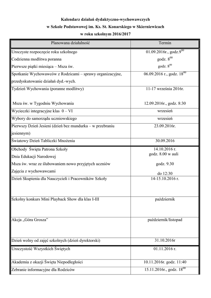 Kalendarz działań dydaktyczno-wychowawczych w Szkole Podstawowej im. Ks. St. Konarskiego w Skierniewicach w roku szkolnym 2016/2017 Planowana działalność Uroczyste rozpoczęcie roku szkolnego Termin 01.09.2016r., godz.900 Codzienna modlitwa poranna godz. 800 Pierwsze piątki miesiąca – Msza św. godz. 800 Spotkanie Wychowawców z Rodzicami – sprawy organizacyjne, 06.09.2016 r., godz. 1800 przedyskutowanie działań dyd.-wych. Tydzień Wychowania (poranne modlitwy) 11-17 września 2016r. Msza św. w Tygodniu Wychowania 12.09.2016r., godz. 8:30 Wycieczki integracyjne klas 0 – VI wrzesień Wybory do samorządu uczniowskiego wrzesień Pierwszy Dzień Jesieni (dzień bez mundurka – w przebraniu 23.09.2016r. jesiennym) Światowy Dzień Tabliczki Mnożenia Obchody Święta Patrona Szkoły Dnia Edukacji Narodowej Msza św. wraz ze ślubowaniem nowo przyjętych uczniów Zajęcia z wychowawcami Dzień Skupienia dla Nauczycieli i Pracowników Szkoły Szkolny konkurs Mini Playback Show dla klas I-III Akcja „Góra Grosza” 30.09.2016 14.10.2016 r. godz. 8.00 w auli godz. 9.30 do 12:30 14-15.10.2016 r. październik październik/listopad Dzień wolny od zajęć szkolnych (dzień dyrektorski) 31.10.2016r Uroczystość Wszystkich Świętych 01.11.2016 r. Akademia z okazji Święta Niepodległości 10.11.2016r. godz. 11:40 Zebranie informacyjne dla Rodziców 15.11.2016r., godz. 1800 Bożonarodzeniowe akcje charytatywne Mikołajki dla dzieci w Specjalnym Ośrodku Szkolno- grudzień grudzień Wychowawczym w Skierniewicach Mikołajki klasowe Niepokalane Poczęcie NMP – Msza św. Wigilia szkolna Adwentowy Dzień Skupienia grudzień 8.12.2016r. godz. 9:00 21.12.2106r. godz. 18:00 22.12.2016r. 8:00 Klasowe kolędowanie Ferie świąteczne Spotkanie z przedstawicielem Miejskiej Komendy Policji na temat 23.12.2016r. – 31.12.2016r. Początek stycznia bezpiecznego wypoczynku podczas ferii zimowych Uroczystość Objawienia Pańskiego 06.01.2017r. Zebranie informacyjne dla rodziców 10.01.2017r. godz. 18:00 Ferie zimowe Szkolny Konkurs Recytatorski (kl.0-VI) Zebranie informacyjne dla Rodziców 16.01. – 29.01.2017r. styczeń 07.02.2017r., godz. 1800 Koniec I semestru 10.02.2017r. Bal karnawałowy 0-III i dyskoteka karnawałowa IV-VI 16.02.2017r. Apel podsumowujący I semestr 22.02.2017r. Środa Popielcowa – Msza św. Zebranie informacyjne dla rodziców Dzień Języków Obcych Szlachetna paczka wielkanocna – akcja charyt. 01.03.2017 godz.9:00 28.03.2017 r. godz. 1800 marzec 2017r. Marzec/kwiecień 2017 Światowy Dzień Zdrowia 07.04.2017r. Rekolekcje Wielkopostne 10-12.04.2017r. Wiosenna przerwa świąteczna 13-18.04.2017r. Akademia z okazji rocznicy uchwalenia Konstytucji 3 Maja 27.04.2017 r. godz. 11:30 Dzień wolny od zajęć szkolnych (dzień dyrektorski) 02.05.2017r. Zebranie informacyjne z rodzicami na miesiąc przed zakończeniem 16.05.2017r. roku szkolnego Dzień Mamy i Taty 26.05.2017r. Klasowy Dzień Dziecka 01.06.2017r. Dni Lasu i Zadrzewień 01-07.06.2017r. Boże Ciało 15.06.2017r. Dzień wolny od zajęć szkolnych (dzień dyrektorski) 16.06.2017r. Spotkanie z przedstawicielem Miejskiej Komendy Policji na temat Czerwiec bezpiecznego wypoczynku podczas wakacji Dzień Sportu 20.06.2017r. Pokaz talentów 21.06.2017 r. Zajęcia z wychowawcami 22.06.2017 r. Uroczyste zakończenie roku szkolnego 23.06. 2017 r. Uczestnictwo w imprezach kulturalnych (teatr, kino, koncerty muzyczne) Koncerty Filharmonii Narodowej Filmoteka szkolna. Nowe Horyzonty Edukacji Filmowej przynajmniej raz w każdym semestrze 19.09.16, 17.1016, 14.11.16, 19.1216, 09.01.17, 06.0217, 06.03.17, 05.06.17 cztery wyjścia w roku Udział w akcjach: „szklanka mleka” klasy 0-VI październik-maj „owoce i warzywa w szkole” kl. I-III październik-maj