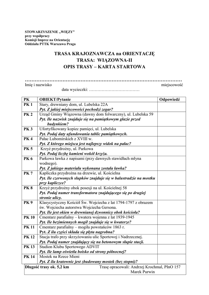 STOWARZYSZENIE „WIĘZY” przy współpracy Komisji Imprez na Orientację Oddziału PTTK Warszawa Praga TRASA KRAJOZNAWCZA na ORIENTACJĘ TRASA: WIĄZOWNA-II OPIS TRASY – KARTA STARTOWA …………………………………………………………………………………… Imię i nazwisko miejscowość data wycieczki: ……………………………… OBIEKT/Pytanie Odpowiedź Stary, drewniany dom, ul. Lubelska 22A Pyt. Z jakiej miejscowości pochodzi zegar? Urząd Gminy Wiązowna (dawny dom folwarczny), ul. Lubelska 59 PK 2 Pyt. Ile nazwisk znajduje się na pamiątkowym głazie przed budynkiem? Ufortyfikowany kopiec pamięci, ul. Lubelska PK 3 Pyt. Podaj daty ufundowania tablic pamiątkowych. Pałac Lubomirskich z XVIII w. PK 4 Pyt. Z którego miejsca jest najlepszy widok na pałac? Krzyż przydrożny, ul. Parkowa PK 5 Pyt. Podaj liczbę kamieni wokół krzyża. Parkowa ławka z napisami (przy dawnych stawidłach młyna PK 6 wodnego). Pyt. Z jakiego materiału wykonana została ławka? Kapliczka przydrożna na drzewie, ul. Kościelna PK 7 Pyt. Ile czerwonych słupków znajduje się w balustradzie na mostku przy kapliczce? Krzyż przydrożny obok posesji na ul. Kościelnej 58 PK 8 Pyt. Podaj numer transformatora znajdującego się po drugiej stronie ulicy. Klasycystyczny Kościół Św. Wojciecha z lat 1794-1797 z obrazem PK 9 św. Wojciecha autorstwa Wojciecha Gersona. Pyt. Ile jest okien w drewnianej dzwonnicy obok kościoła? PK 10 Cmentarz parafialny – kwatera wojenna z lat 1939-1945 Pyt. Ile bezimiennych mogił znajduje się w kwaterze? PK 11 Cmentarz parafialny – mogiła powstańców 1863 r. Pyt. Z ilu części składa się płyta nagrobna? PK 12 Stacja trafo przy skrzyżowaniu ulic Sportowej i Nadrzecznej. Pyt. Podaj numer znajdujący się na betonowym słupie stacji. PK 13 Stadion Klubu Sportowego ADVIT Pyt. Ile lamp oświetla boisko od strony północnej? PK 14 Mostek na Rzece Mieni Pyt. Z ilu kratownic jest zbudowany mostek (bez stopni)? Długość trasy ok. 5,2 km Trasę opracowali: Andrzej Krochmal, PInO 157 Marek Purwin PK PK 1 STOWARZYSZENIE „WIĘZY” przy współpracy Komisji Imprez na Orientację Oddziału PTTK Warszawa Praga TRASA KRAJOZNAWCZA na ORIENTACJĘ TRASA: WIĄZOWNA-II OPIS TRASY – KARTA STARTOWA ……………………………………………………………………………………. Imię i nazwisko miejscowość data wycieczki: ……………………………… OBIEKT/Pytanie Odpowiedź Stary, drewniany dom, ul. Lubelska 22A Pyt. Z jakiej miejscowości pochodzi zegar? Urząd Gminy Wiązowna (dawny dom folwarczny), ul. Lubelska 59 PK 2 Pyt. Ile nazwisk znajduje się na pamiątkowym głazie przed budynkiem? Ufortyfikowany kopiec pamięci, ul. Lubelska PK 3 Pyt. Podaj daty ufundowania tablic pamiątkowych. Pałac Lubomirskich z XVIII w. PK 4 Pyt. Z którego miejsca jest najlepszy widok na pałac? Krzyż przydrożny, ul. Parkowa PK 5 Pyt. Podaj liczbę kamieni wokół krzyża. Parkowa ławka z napisami (przy dawnych stawidłach młyna PK 6 wodnego). Pyt. Z jakiego materiału wykonana została ławka? Kapliczka przydrożna na drzewie, ul. Kościelna PK 7 Pyt. Ile czerwonych słupków znajduje się w balustradzie na mostku przy kapliczce? Krzyż przydrożny obok posesji na ul. Kościelnej 58 PK 8 Pyt. Podaj numer transformatora znajdującego się po drugiej stronie ulicy. Klasycystyczny Kościół Św. Wojciecha z lat 1794-1797 z obrazem PK 9 św. Wojciecha autorstwa Wojciecha Gersona. Pyt. Ile jest okien w drewnianej dzwonnicy obok kościoła? PK 10 Cmentarz parafialny – kwatera wojenna z lat 1939-1945 Pyt. Ile bezimiennych mogił znajduje się w kwaterze? PK 11 Cmentarz parafialny – mogiła powstańców 1863 r. Pyt. Z ilu części składa się płyta nagrobna? PK 12 Stacja trafo przy skrzyżowaniu ulic Sportowej i Nadrzecznej. Pyt. Podaj numer znajdujący się na betonowym słupie stacji. PK 13 Stadion Klubu Sportowego ADVIT Pyt. Ile lamp oświetla boisko od strony północnej? PK 14 Mostek na Rzece Mieni Pyt. Z ilu kratownic jest zbudowany mostek (bez stopni)? Długość trasy ok. 5,2 km Trasę opracowali: Andrzej Krochmal, PInO 157 Marek Purwin PK PK 1