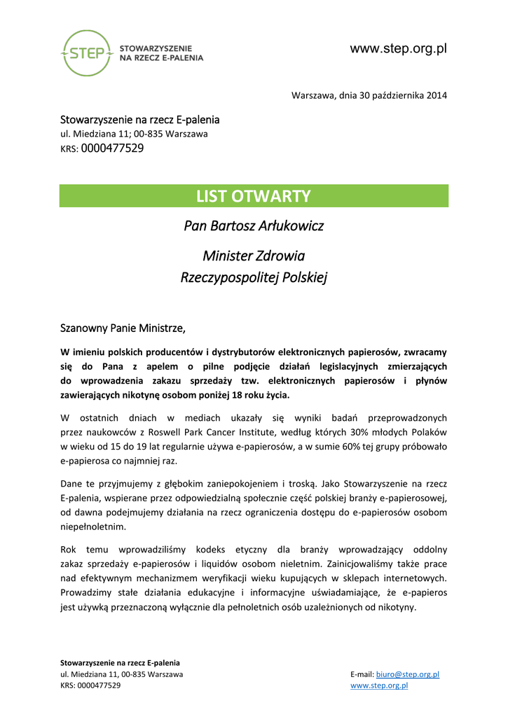 www.step.org.pl Warszawa, dnia 30 października 2014 Stowarzyszenie na rzecz E-palenia ul. Miedziana 11; 00-835 Warszawa KRS: 0000477529 LIST OTWARTY Pan Bartosz Arłukowicz Minister Zdrowia Rzeczypospolitej Polskiej Szanowny Panie Ministrze, W imieniu polskich producentów i dystrybutorów elektronicznych papierosów, zwracamy się do Pana z apelem o pilne podjęcie działań legislacyjnych zmierzających do wprowadzenia zakazu sprzedaży tzw. elektronicznych papierosów i płynów zawierających nikotynę osobom poniżej 18 roku życia. W ostatnich dniach w mediach ukazały się wyniki badań przeprowadzonych przez naukowców z Roswell Park Cancer Institute, według których 30% młodych Polaków w wieku od 15 do 19 lat regularnie używa e-papierosów, a w sumie 60% tej grupy próbowało e-papierosa co najmniej raz. Dane te przyjmujemy z głębokim zaniepokojeniem i troską. Jako Stowarzyszenie na rzecz E-palenia, wspierane przez odpowiedzialną społecznie część polskiej branży e-papierosowej, od dawna podejmujemy działania na rzecz ograniczenia dostępu do e-papierosów osobom niepełnoletnim. Rok temu wprowadziliśmy kodeks etyczny dla branży wprowadzający oddolny zakaz sprzedaży e-papierosów i liquidów osobom nieletnim. Zainicjowaliśmy także prace nad efektywnym mechanizmem weryfikacji wieku kupujących w sklepach internetowych. Prowadzimy stałe działania edukacyjne i informacyjne uświadamiające, że e-papieros jest używką przeznaczoną wyłącznie dla pełnoletnich osób uzależnionych od nikotyny. Stowarzyszenie na rzecz E-palenia ul. Miedziana 11, 00-835 Warszawa KRS: 0000477529 E-mail: [email protected] www.step.org.pl www.step.org.pl Opisane wyżej inicjatywy STEP przyniosły pewne efekty. Zgodnie z raportem „Młodzież 2013”, przygotowanym przez CBOS i Krajowe Biuro D Spraw Przeciwdziałania Narkomanii, 21% młodzieży w wieku szkolnym pali tradycyjne papierosy regularnie, a kolejne 21% przyznaje się do okazjonalnego palenia papierosów tradycyjnych (Raport „Konsumpcja substancji psychoaktywnych przez młodzież szkolną – Młodzież 2013”, str. 155, Tabela 120). W odniesieniu do elektronicznych papierosów, zgodnie z danymi Roswell Park Cancer Institute, w obydwu przypadkach odsetek jest większy zaledwie o 9%, przy braku analogicznych restrykcji prawnych. Jednak oddolnie wprowadzony zakaz sprzedaży e-papierosów osobom nieletnim wzbudził wiele kontrowersji w środowisku użytkowników. W przestrzeni publicznej pojawiły się propozycje występowania na drogę sądową przeciw firmom odmawiającym sprzedaży osobom nieletnim, z uwagi na brak podstawy prawnej. W ostatnim roku na tym polu dochodziło także do incydentów z udziałem Policji i służb porządkowych. Zdajemy sobie jednocześnie sprawę z tego, że zarówno złożoność procesu legislacyjnego, jak i trwające obecnie prace nad implementacją Dyrektywy 2014/40/WE (tzw. dyrektywy tytoniowej) mogą stwarzać trudności, mające istotny wpływ na tempo prac. Dlatego zwracamy się do Pana Ministra z prośbą o pilne podjęcie działań legislacyjnych zmierzających do powstania odrębnej ustawy o e-papierosach, wprowadzającej zakaz sprzedaży urządzeń i płynów zawierających nikotynę osobom poniżej 18 roku życia. Taka ustawa w dalszej kolejności może posłużyć za podstawę do szczegółowej regulacji tego, niewątpliwie nowego i specyficznego produktu. Wierzymy, że połączenie wysiłków branży, z dobrym i jednoznacznym prawem, pomoże ukrócić opisany proceder i przyczyni się do znaczącego ograniczenia dostępności używek, jakimi są e-papierosy i płyny zawierające nikotynę, osobom nieletnim. W imieniu Zarządu Stowarzyszenia na rzecz E-palenia, ……………………………….…………………. (Artur Ziółkowski – Członek Zarządu) Stowarzyszenie na rzecz E-palenia ul. Miedziana 11, 00-835 Warszawa KRS: 0000477529 E-mail: [email protected] www.step.org.pl