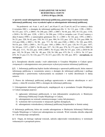 ZARZĄDZENIE NR 94/2012 BURMISTRZA CEDYNI Z DNIA 09 lipca 2012R. w sprawie zasad udostępniania informacji publicznej, ponownego wykorzystywania informacji publicznej oraz wysokości opłat za udostępnienie informacji publicznej Na podstawie art. 4 ust. 1, art.5, art.7, art.10,art.13, art.15,art.16, art.23 a-i ustawy z dnia 6 września 2001 r. o dostępie do informacji publicznej (Dz. U. Nr 112, poz. 1198, z 2002 r. Nr 153, poz. 1271, z 2004 r. Nr 240, poz. 2407, z 2005 r. Nr 64, poz. 565, Nr 132, poz. 1110, z 2010 r. Nr 182, poz. 1228, z 2011 r. Nr 204, poz. 1195) w związku z art. 33 ust.3 ustawy z dnia 8 marca 1990 r. o samorządzie gminnym /Dz. U. z 2001 r. Nr 142, poz. 1591; z 2002 r. Nr 23, poz. 220, Nr 62, poz. 558, Nr 113, poz. 984, Nr 153, poz. 1271, Nr 214, poz.1806. Nr 214 poz.1806; z 2003 r. Nr 80, poz. 717, Nr 162, poz.1568; z 2004 r. Nr 102, poz.1055, Nr116, poz. 1203; z 2005 r. , Nr 172, poz. 1441; z 2006 r. Nr 17, poz. 128, Nr 175, poz. 1457, Nr 181,poz. 1337; z 2007 r. Nr 48, poz. 327 , Nr 138, poz. 974, Nr 173, poz.1218;z 2008 Nr 180, poz. 1111, Nr 223, poz. 1458 z 2009 r. Nr 52 poz. 420, Nr 157, poz. 1241; z 2010 Nr 28 poz. 142, Nr 28 poz. 146, Nr 40, poz. 230, Nr 106, poz. 675; Dz. U. z 2011r. Nr 117 poz. 679, Nr 21 poz.113, Nr 134, poz.777, Nr 217, poz.1281, Nr 149, poz. 887) / zarządzam, co następuje: § 1. Zarządzenie określa zasady i tryb załatwiania w Urzędzie Miejskim w Cedyni spraw związanych z udostępnieniem oraz ponownym wykorzystywaniem informacji publicznej. § 2. 1. Informacją publiczną będzie każda informacja o sprawach publicznych, która stanowi informację publiczną w rozumieniu ustawy o dostępie do informacji publicznej i podlega udostępnieniu i ponownemu wykorzystaniu na zasadach i w trybie określonym w danej ustawie. 2. Prawo do informacji publicznej podlega ograniczeniu w zakresie określonym w art.5 ustawy z dnia 06 września 2001r.o dostępie do informacji publicznej. 3. Udostępnienie informacji publicznych, znajdujących się w posiadaniu Urzędu Miejskiego w Cedyni następuje poprzez: 1) ogłaszanie informacji publicznych, w tym dokumentów urzędowych, w Biuletynie Informacji Publicznej Urzędu Miejskiego w Cedyni, 2) udostępnianie na wniosek zainteresowanego ( ustny lub pisemny) , 3) wyłożenie lub wywieszenie w miejscach ogólnie dostępnych, 4) udostępnienie wnioskodawcy informacji publicznej bezpośrednie w formie ustnej. 4. Informacja publiczna, która nie została udostępniona w Biuletynie Informacji Publicznej Urzędu Miejskiego w Cedyni jest udostępniana na wniosek. Wzór wniosku określa załącznik nr 1 do niniejszego zarządzenia. § 3. Organ, do którego wpłynął wniosek, udziela odpowiedzi wnioskodawcy w terminach wskazanych w przepisach prawa. § 4. 1. Jeżeli w wyniku rozpatrywania wniosku o udostępnienie informacji publicznej Urząd ma ponieść dodatkowe koszty związane ze wskazanym we wniosku sposobem udostępnienia lub koniecznością przekształcenia informacji w formę wskazaną we wniosku, opłatę wnosi wnioskodawca. 2. W przypadkach, gdy Urząd ponosi dodatkowe koszty pobiera się opłatę: 1) za sporządzenie kserokopii dokumentu lub wydruku komputerowego: a) format A-4-0,50 zł za każdą stronę, b) format A-3-1,00 zł za każdą stronę. 2) za przegranie informacji na płytę CD-ROM będącą własnością Urzędu-2,00zł, 3) za przesłanie informacji pocztą pobiera się dodatkowo koszty przesyłki pocztowej, 4) za przekształcenie informacji w formę wskazaną przez wnioskodawcę, to koszt jednej strony A4 informacji przekształconej wynosi 15,00 zł. 3. Wysokość opłat za udostępnienie informacji zostanie każdorazowo ustalona na podstawie pkt.2. 4. Odstępuje się od pobrania dodatkowych opłat, jeżeli koszty udzielenia informacji nie przekraczają 5,00 zł ( słownie : pięć złotych) 5. W terminie 14 dni od daty złożenia wniosku, organ rozpatrujący wniosek wydaje powiadomienie o konieczności wniesienia opłaty w związku z udostępnieniem informacji publicznej z zastrzeżeniem sytuacji o której mowa w pkt.4 niniejszego zarządzenia. 6. Wnioskodawca w terminie 14 dni od dnia otrzymania powiadomienia może: 1) potwierdzić zakres żądanych we wniosku informacji- wówczas wnioskowana informacja udostępniona jest wnioskodawcy po upływnie terminu określonego przepisami prawa 2) zmienić wniosek o udostępnienie informacji publicznej- wówczas zmodyfikowany wniosek rozpatruje się ponownie, 3) wycofać wniosek o udostępnienie informacji publicznej- wówczas wniosek nie podlega dalszemu rozpatrywaniu. 7. W przypadku, gdy wnioskodawca w terminie 14 dni od dnia doręczenia powiadomienia potwierdzi zakres żądanych we wniosku informacji, nie wycofa wniosku, ani nie dokona zmiany wniosku w zakresie sposobu lub formy udostępnienia informacji publicznej, udostępnia się wnioskowaną informacje publiczną, a w przypadku nie uiszczenia opłaty dokonuje się wyegzekwowania jej na podstawie ustawy z dnia 17 czerwca 1966r. o postępowaniu egzekucyjnym w administracji. 8. Wnioskodawca dokuje opłaty w kwocie wskazanej w powiadomieniu na rachunek bankowy Urzędu Miejskiego w Cedyni, Bank Spółdzielczy Chojna o/Cedynia nr 18 9370 1017 0100 0185 2001 0002. § 5. 1. Poprzez ponowne wykorzystywanie informacji publicznej należy rozumieć wykorzystywanie przez osoby fizyczne, osoby prawne i jednostki organizacyjne nieposiadające osobowości prawnej, informacji publicznej lub każdej jej części, będącej w posiadaniu Urzędu Miejskiego w Cedyni niezależnie od sposobu jej utrwalenia w celach komercyjnych lub niekomercyjnych, innych niż pierwotny publiczny cel wykorzystywania, dla którego informacja została wytworzona. 2. Udostępnienie informacji publicznych w celu ich ponownego wykorzystywania następuje na wniosek w przypadkach gdy: 1) informacja publiczna nie została udostępniona w Biuletynie Informacji Publicznej Urzędu Miejskiego w Cedyni, 2) wnioskodawca zamierza wykorzystyw