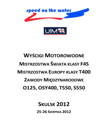 WYŚCIGI MOTOROWODNE MISTRZOSTWA ŚWIATA KLASY F4S MISTRZOSTWA EUROPY KLASY T400 ZAWODY MIĘDZYNARODOWE O125, OSY400, T550, S550 SKULSK 2012 25-26 SIERPNIA 2012 PROGRAM WSTĘPNY 1. Zawody – miejsce, czas SKULSK 2012 – WYŚCIGI MOTOROWODNE 62-560 Skulsk, Polska 25-26 sierpnia 2012 Zawody będą rozgrywane zgodnie z Regulaminami UIM oraz PZMWiNW. Organizator: Komitet Organizacyjny Zawodów Motorowodnych Skulsk, ul. Targowa 2 62-560 Skulsk, Polska Klasy oraz Mistrzostwa: Finał Mistrzostw Świata F4S, Mistrzostwa Europy T400, Zawody Międzynarodowe klasy O125 Zawody Międzynarodowe klasy OSY400 Zawody Międzynarodowe klasy T 455 2. Organizacja Zawodów Przewodniczący Komitetu Organizacyjnego Komandor Zawodów Rzecznik medialny Sędzia Główny Sędzia ds Bezpieczeństwa Sekretarz Zawodów Komisarz UIM Przewodniczący Międzynarodowego Kolegium Orzekającego Komisja Techniczna Pomiar Czasu Robert Reszkowski Jarosław Świerczyński Andrzej Radomski Jerzy Wojewoda Remigiusz Nowak Katarzyna Stańczak Dieter Komm Joanna Rau Szymon Nowak Mirosław Marek Poznań Ślesin Piła Łódź Chodzież Poznań Niemcy Poznań Chodzież Żnin Międzynarodowe Kolegium Orzekające: Kolegium będzie złożone z: Przewodniczącego, Komisarza UIM oraz wszystkich, oficjalnie zgłoszonych przedstawicieli współzawodniczących krajów (na piśmie, autoryzowane i podpisane w odpowiednim Przedstawicielstwie Narodowym). Każdy członek Kolegium może reprezentować tylko jeden kraj (UIM Art. 402.01.1). 3. Zawody – trasa: SKULSK 2012 WYŚCIGI MOTOROWODNE na Jeziorze Skulska Wieś, 62-560 Skulsk, Polska. Trasa: 4 boje, w kierunku przeciwnym do ruchu wskazówek zegara. Długość okrążenia: 1450 (1500) metrów. Akwen dopuszczony dla: 12 łodzi. 4. Klasy i Mistrzostwa, biegi: Klasa Ilość biegów Ilość okrążeń Całkowita Długość każdego z biegów F4S 4 start + 9 10 okrążeń 13.85 km T400 4 start + 9 10 okrążeń 13.85 km O125 3 start + 4 5 okrążeń 6.60 km OSY400 3 start + 4 5 okrążeń 6.60 km S550 3 start + 9 10 okrążeń 13.85 km T550 3 start + 9 10 okrążeń 13.85 km 5. Rozgrywanie zawodów Zgodnie z: • Regulaminem Wyścigów po Obwodzie UIM 2012, • dodatkowymi poleceniami, ewentualnie przekazanymi na Odprawie Zawodników, • niniejszym Programem Wstępnym. Kara za zniszczenie boi wynosi 200 Euro, za każdą. Start: z pomostu startowego (UIM Art. 307). Re-Start: odpowiednio do Art. 311 UIM. 6. Zgłoszenia Należy nadsyłać do Organizatora: Komitet Organizacyjny Zawodów Motorowodnych Skulsk, ul. Targowa 2 62-560 Skulsk, Polska Tel: + 48 63 2682018 Fax: +48 63 2682018 Email: [email protected] Termin zgłoszeń: 10 sierpnia, 2012. W przypadku zgłoszeń spóźnionych, decyzja należy do Organizatora. Zgłoszenia mają być składane z wykorzystaniem załączonego, oficjalnego formularza. Zgłoszenia muszą zostać własnoręcznie podpisane przez zawodnika. Zgłoszenia zawodników zagranicznych muszą być potwierdzone przez ich Przedstawicielstwo Narodowe (z pieczątką/podpisem na Formularzu Zgłoszeniowym). Zgłoszenia zawodników niemających jeszcze 18 lat, muszą być podpisane przez rodziców lub opiekunów prawnych. 7. Kontrola / Dokumenty • Piątek, 24 sierpnia, 2012, 10:00 – 18:00, • Sobota, 25 sierpnia, 2012, 09:00 – 12:00. Rejestracja odbywać się będzie w Biurze Zawodów. Zawodnicy muszą przedstawić następujące dokumenty: • Międzynarodową licencję zawodniczą ważną na rok 2012. • Aktualne zaświadczenie o zaliczeniu testu na zatapianie (tylko dla zawodników używających wzmocnionych kokpitów bezpieczeństwa). • Poświadczenia ubezpieczeń, jak w punkcie 11 niniejszego Regulaminu. Przed początkiem treningów każda łódź i jej silnik musi zostać przedstawiona do Kontroli Technicznej łącznie z następującym wyposażeniem: • Ważnym certyfikatem pomiarowym oraz w F4S – obowiązkowym Logbook’iem. • Kaskiem ochronnym (UIM Art. 205.07). • Kamizelką ratunkową (UIM Art. 205.06) oraz ubraniem ochronnym (UIM Art. 205.11). Należy pamiętać o płycie ochronnej w ubiorze dla kierowców łodzi bez kokpitów. • Wiosłem, jeśli jest wymagane. Karta (obiegowa) zawodnika, która będzie wręczana w Biurze Zawodów, powinna zostać przekazana sędziom podczas Kontroli Technicznej. Zmiana podparcia silnika oraz wyposażenia układu sterowego wymaga przeprowadzenia nowej kontroli technicznej. Po każdym wypadku zaistniałym na treningu czy podczas wyścigu uszkodzona łódź musi zostać ponownie przedstawiona do kontroli technicznej! Każdy zawodnik jest zobowiązany do umieszczenia nalepek reklamowych sponsorów zawodów w dobrze widocznym miejscu na obu stronach łodzi. Kontrola techniczna po zawodach. Po zakończeniu biegów pierwsze trzy sklasyfikowane łodzie muszą zostać przedstawione sędziom technicznym w wydzielonej części parku maszyn (parc fermé). Mogą oni zażądać dostarczenia kolejnych łodzi. 8. Poziom hałasu Jak w Art. 504 UIM. 9. Treningi Jak w załączonym programie minutowym. Trasa treningu = trasa wyścigu. Wejście/Wyjście z trasy jedynie poprzez zaznaczone strefy Wejścia/Wyjścia. Patrz załączony szkic. 10. Odprawy Zawodników Obecność zawodników jest obowiązkowa. Odprawy Zawodników odbędą się w wyznaczonym miejscu Parku Maszyn. Czas – jak w załączonym programie. a. Test na obecność alkoholu (Art. UIM 205.02.02) Organizator zastrzega sobie prawo przeprowadzenia oddechowego testu na obecność alkoholu wszystkich osób w parku maszyn, w każdej chwili podczas dni z treningami i wyścigami (Art. UIM 205.02.02). Jeśli wykaże on wynik wyższy niż dopuszczalny, to osoba taka zostanie usunięta z parku maszyn, a zawodnik, którego ekipy jest na członkiem zostanie zdyskwalifikowany w zawodach. Taka sama kara spotka osoby odmawiające poddanie się testowi. b. Kontrola na obecność narkotyków w organizmie Organizator zastrzega sobie prawo przeprowadzenia kontroli każdej osoby w parku maszyn na obe