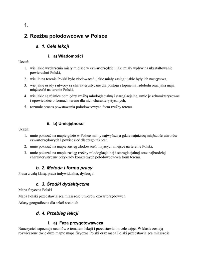 1. 2. Rzeźba polodowcowa w Polsce a. 1. Cele lekcji i. a) Wiadomości Uczeń: 1. wie jakie wydarzenia miały miejsce w czwartorzędzie i jaki miały wpływ na ukształtowanie powierzchni Polski, 2. wie ile na terenie Polski było zlodowaceń, jakie miały zasięg i jakie były ich następstwa, 3. wie jakie osady i utwory są charakterystyczne dla postoju i topnienia lądolodu oraz jaką mają miąższość na terenie Polski, 4. wie jakie są różnice pomiędzy rzeźbą młodoglacjalną i staroglacjalną, umie je zcharakteryzować i opowiedzieć o formach terenu dla nich charakterystycznych, 5. rozumie proces powstawania polodowcowych form rzeźby terenu. ii. b) Umiejętności Uczeń: 1. umie pokazać na mapie gdzie w Polsce mamy najwyższą a gdzie najniższą miąższość utworów czwartorzędowych i powiedzieć dlaczego tak jest, 2. umie pokazać na mapie zasięg zlodowaceń mających miejsce na terenie Polski, 3. umie pokazać na mapie zasięg rzeźby młodoglacjalnej i staroglacjalnej oraz najbardziej charakterystyczne przykłady konkretnych polodowcowych form terenu. b. 2. Metoda i forma pracy Praca z całą klasą, praca indywidualna, dyskusja. c. 3. Środki dydaktyczne Mapa fizyczna Polski Mapa Polski przedstawiająca miąższość utworów czwartorzędowych Atlasy geograficzne dla szkół średnich d. 4. Przebieg lekcji i. a) Faza przygotowawcza Nauczyciel zapoznaje uczniów z tematem lekcji i przedstawia im cele zajęć. W klasie zostają rozwieszone dwie duże mapy: mapa fizyczna Polski oraz mapa Polski przedstawiająca miąższość utworów czwartorzędowych. Nauczyciel prosi uczniów o wyjęcie atlasów geograficznych (co najmniej 1 atlas na dwie osoby). ii. b) Faza realizacyjna 1. Nauczyciel zapoznaje uczniów z wydarzeniami mającymi miejsce w czwartorzędzie oraz ich skutkami na terenie Polski. Nauczyciel opowiada uczniom ile było zlodowaceń na terenie Polski, jaki miały one zasięg, jaka część kraju była pokryta lodem, jakie są na to dowody. 2. Nauczyciel przechodzi do omawiania skutków nasunięcia się na Polskę lodowca – znacznych przekształceń rzeźby Polski. Opowiada uczniom jakie osady i utwory są charakterystyczne dla postoju i topnienia lądolodu. Nauczyciel pokazuje uczniom na mapie gdzie w Polsce utwory czwartorzędowe mają największą miąższość. Pada pytanie do klasy: czy uczniowie rozumieją dlaczego w jednych miejscach miąższość tych utworów jest wyższa a w innych niższa. 3. Nauczyciel omawia rzeźbę polodowcową w Polsce z podziałem na rzeźbę młodoglacjalną i starogalcjalną. Nauczyciel tłumaczy uczniom jakie formy krajobrazu polodowcowego są charakterystyczne dla rzeźby młodoglacjalnej (m.in. moreny czołowe, sandry, jeziora polodowcowe, pradoliny, ozy, duże różnice wysokości) i staroglacjalnej (m.in. moreny denne, brak jezior, tereny równinne, małe różnice wysokości). Proces powstawania każdej z wymienionych form jest przez nauczyciela dokładnie opisywany. Następnie nauczyciel pokazuje na mapie Polski zasięg rzeźby młodoglacjalnej i staroglacjalnej oraz konkretne, przykładowe formy krajobrazu polodowcowego np. moreny czołowe, pola sandrowe, jeziora polodowcowe itp. 4. Nauczyciel rysuje na tablicy tabelę (załącznik 1) składającą się z czterech kolumn – każda przypisana innym warunkom powstawania krajobrazu polodowcowego ale w różnych warunkach. Następnie prosi uczniów o zgłaszanie swoich propozycji i wpisywanie ich do tabeli. Nauczyciel wspólnie z uczniami uzupełnia tabelę, jednocześnie uczniowie przerysowują ją do swoich zeszytów. iii. c) Faza podsumowująca 1. Nauczyciel przypomina uczniom czemu zawdzięczamy rzeźbę polodowcową w Polsce i jakie formy rzeźby polodowcowej znajdują się w Polsce 2. Nauczyciel w celu lepszego zapamiętania przez uczniów przypomina najpopularniejsze przykłady konkretnych form polodowcowych w Polsce 3. Nauczyciel prosi aby w domu uczniowie zastanowili się i znaleźli informacje o innych krajach objętych niegdyś zlodowaceniem i dowiedzieli się czy występują tam te same polodowcowe formy ukształtowania terenu co w Polsce czy może jakieś inne? Jeśli inne to jakie? e. 5. Bibliografia 1. Harasymowicz J., Wojtkowicz Z., Polska w Europie, Stowarzyszenie Oświatowców Polskich, Toruń 1998. 2. Kozioł T., Geografia. Zagadnienia maturalne, Wydawnictwo Szkolne Omega, Kraków 1999. 3. Libner P., Stefaniak G., Geografia od A do Z, Kram, Warszawa 1998. f. 6. Załączniki i. a) Karta pracy ucznia załącznik 1 Formy powstałe przed czołem lądolodu np. moreny czołowe Formy powstałe na terenie objętym lądolodem np. kemy ii. b) Zadanie domowe brak g. 7. Czas trwania lekcji 45 minut h. 8. Uwagi do scenariusza brak Formy powstałe poprzez Formy powstałe w działalność lodowców warunkach klimatu górskich peryglacjalnego np. doliny U-kształtne np. gołoborza