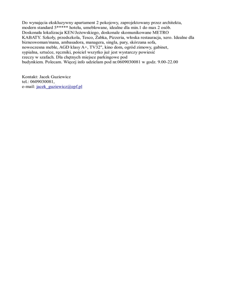 Do wynajęcia ekskluzywny apartament 2 pokojowy, zaprojektowany przez architekta, modern standard 5***** hotelu, umeblowane, idealne dla min.1 do max 2 osób. Doskonała lokalizacja KEN/Jeżewskiego, doskonale skomunikowane METRO KABATY. Szkoły, przedszkola, Tesco, Żabka, Pizzeria, włoska restauracja, xero. Idealne dla bizneswoman/mana, ambasadora, managera, singla, pary, skórzana sofa, nowoczesna meble, AGD klasy A+, TV32", kino dom, ogród zimowy, gabinet, sypialna, sztućce, ręczniki, pościel wszytko już jest wystarczy powiesić rzeczy w szafach. Dla chętnych miejsce parkingowe pod budynkiem. Polecam. Więcej info udzielam pod nr.0609030081 w godz. 9.00-22.00 Kontakt: Jacek Guziewicz tel.: 0609030081, e-mail: [email protected]