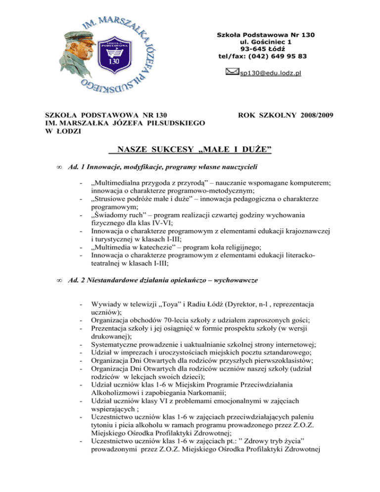 Szkoła Podstawowa Nr 130 ul. Gościniec 1 93-645 Łódź tel/fax: (042) 649 95 83 [email protected] SZKOŁA PODSTAWOWA NR 130 IM. MARSZAŁKA JÓZEFA PIŁSUDSKIEGO W ŁODZI ROK SZKOLNY 2008/2009 NASZE SUKCESY „MAŁE I DUśE” • Ad. 1 Innowacje, modyfikacje, programy własne nauczycieli - • „Multimedialna przygoda z przyrodą” – nauczanie wspomagane komputerem; innowacja o charakterze programowo-metodycznym; „Strusiowe podróŜe małe i duŜe” – innowacja pedagogiczna o charakterze programowym; „Świadomy ruch” – program realizacji czwartej godziny wychowania fizycznego dla klas IV-VI; Innowacja o charakterze programowym z elementami edukacji krajoznawczej i turystycznej w klasach I-III; „Multimedia w katechezie” – program koła religijnego; Innowacja o charakterze programowym z elementami edukacji literackoteatralnej w klasach I-III; Ad. 2 Niestandardowe działania opiekuńczo – wychowawcze - - Wywiady w telewizji „Toya” i Radiu Łódź (Dyrektor, n-l , reprezentacja uczniów); Organizacja obchodów 70-lecia szkoły z udziałem zaproszonych gości; Prezentacja szkoły i jej osiągnięć w formie prospektu szkoły (w wersji drukowanej); Systematyczne prowadzenie i uaktualnianie szkolnej strony internetowej; Udział w imprezach i uroczystościach miejskich pocztu sztandarowego; Organizacja Dni Otwartych dla rodziców przyszłych pierwszoklasistów; Organizacja Dni Otwartych dla rodziców uczniów naszej szkoły (udział rodziców w lekcjach swoich dzieci); Udział uczniów klas 1-6 w Miejskim Programie Przeciwdziałania Alkoholizmowi i zapobiegania Narkomanii; Udział uczniów klasy VI z problemami emocjonalnymi w zajęciach wspierających ; Uczestnictwo uczniów klas 1-6 w zajęciach przeciwdziałających paleniu tytoniu i picia alkoholu w ramach programu prowadzonego przez Z.O.Z. Miejskiego Ośrodka Profilaktyki Zdrowotnej; Uczestnictwo uczniów klas 1-6 w zajęciach pt.: ” Zdrowy tryb Ŝycia” prowadzonymi przez Z.O.Z. Miejskiego Ośrodka Profilaktyki Zdrowotnej • Ad. 5 Realizacja projektów szkolnych - • - - • Organizacja obchodów „Dni Ciszy” w ramach realizacji elementów programu społecznego „Szkoła bez przemocy”; Realizacja projektu pod hasłem: „Postaci bajkowe z wybranego kraju europejskiego”, przeprowadzonego we współpracy Klubu Europejskiego oraz Samorządu Uczniowskiego, zakończonego prezentacją podczas obchodów „Spring Day”; Kontynuacja działań w projekcie społecznym „Szkoła bez przemocy”. Kontynuacja działań w projekcie „Pogotowie naukowe II”. Ad. 6 Osiągnięcia, postępy dydaktyczne ze szczególnym zwróceniem uwagi na specyfikę szkoły absolwenci szkoły w gimnazjum osiągają wyniki z przedmiotów edukacyjnych i zachowania bardzo zbliŜone do wyników po klasie VI (analiza wyników absolwentów) stosowane metody pracy z dzieckiem z mutyzmem powodują jego sukcesy w nauce (uczennica klasy III) sukcesy w pracy z dzieckiem ze stwierdzonym ADHD w wyniku indywidualizacji nauczania w ciągu ostatnich 7 lat zanotowano tylko jeden przypadek niepromowania ucznia uczniowie klasy VI na sprawdzianie zewnętrznym poprawili swój wynik w porównaniu z klasą III z niskiego na średni, w wyniku trudnej sytuacji absolwenta nauczyciele szkoły udzielali bezpłatnie korepetycji z zajęć edukacyjnych przez drugi semestr, w wyniku pomocy chłopiec został promowany do klasy programowo wyŜszej (Publiczne Gimnazjum 39) Mimo „kameralnej placówki” (po jednym oddziale w poziomie) uczniowie osiągają znaczące sukcesy w konkursach przedmiotowych, Ad. 7 Osiągnięcia w konkursach, zawodach sportowych (ranga konkursu) - Organizacja konkursu międzyszkolnego „Omnibus” dla klas IV-VI – II miejsce; - Organizacja konkursu piosenki turystycznej i wiedzy o Polsce „Wagabunda”III miejsce; - Zdobycie wyróŜnienia w III konkursie informatycznym „Tradycje Świąt Wielkiej Nocy” (org. ŁCDNiKP); - Udział w finale wojewódzkiego konkursu matematyczno-przyrodniczego „Pryzmat” (org. SPnr 4 w Sieradzu); - III miejsce w konkursie Łódzkie Malowanie Ortografii (org. ŁCDNiKP); - Udział w VII konkursie przyrodniczym – finał pisemny (org. ŁCDNiKP); - II miejsce w świątecznym konkursie boŜonarodzeniowym (org. PG 44); - Rozbudzenie pasji i zainteresowań twórczych uczniów klas I-VI – duŜe zainteresowanie kołem plastycznym, zmobilizowanie uczniów do estetycznego działania plastycznego (okolicznościowe wystawy prac na korytarzach szkolnych) - Organizacja konsultacji grupowej „Integracja międzyprzedmiotowa w szkole podstawowej) – (org. ŁCDNiKP wraz z metodykiem) • Ad. 8 Efekty współpracy z instytucjami i rodzicami - • Ad. 9 Modernizacja bazy szkoły - - • Zakup mebli (sekretariat, pokój nauczycielski, gabinet księgowej, częściowo gabinet pedagoga, półki w bibliotece); Zakup wieŜy na uroczystości szkolne; Zakup urządzenia wielofunkcyjnego – księgowość; Zakup ksero, komputera, monitora – sekretariat; Zakup biurka – gabinet dyrektora; budowa dwu nowocześnie wyposaŜonych boisk sportowych wraz z kontenerami na szatnię i prysznice w ramach rządowego projektu „Orlik 2012” remont klasy języka angielskiego wymiana lamp jarzeniowych w szkole (sale lekcyjne, korytarze) pomalowanie świetlicy szkolnej Ad. 10 Wzbogacenie pomocy dydaktycznych • Udział rodziców w organizacji wycieczek, spotkań integrujących klasę, imprez i uroczystości szkolnych (Wigilia klasowa, Dzień Sportu, Pikniki klasowe); Współpraca z Poradnią Psychologiczno-Pedagogiczną nr 6 w Łodzi – organizacja szkoleń dla rodziców, badania przesiewowe dla uczniów klasy I; Prowadzenie nauczania dziecka z mutyzmem wybiórczym we współpracy z rodzicem; Znaczniki do zajęć sportowych; Zakup lup, kompasów; Zakup przenośnej stacji dyskietek, myszki komputerowych; ksiąŜki do szkolnej biblioteki, filmy, programy multimedialne Ad. 11 Sponsorzy - współpraca - - Pozyskanie funduszy (sponsorów
