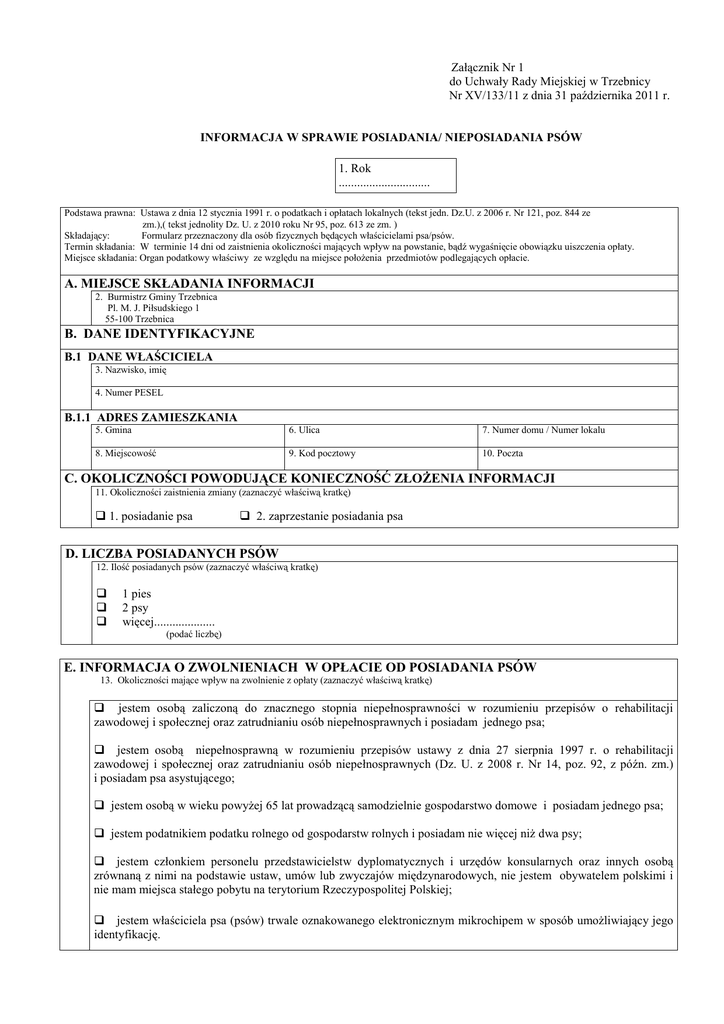 Załącznik Nr 1 do Uchwały Rady Miejskiej w Trzebnicy Nr XV/133/11 z dnia 31 października 2011 r. INFORMACJA W SPRAWIE POSIADANIA/ NIEPOSIADANIA PSÓW 1. Rok .............................. Podstawa prawna: Ustawa z dnia 12 stycznia 1991 r. o podatkach i opłatach lokalnych (tekst jedn. Dz.U. z 2006 r. Nr 121, poz. 844 ze zm.),( tekst jednolity Dz. U. z 2010 roku Nr 95, poz. 613 ze zm. ) Składający: Formularz przeznaczony dla osób fizycznych będących właścicielami psa/psów. Termin składania: W terminie 14 dni od zaistnienia okoliczności mających wpływ na powstanie, bądź wygaśnięcie obowiązku uiszczenia opłaty. Miejsce składania: Organ podatkowy właściwy ze względu na miejsce położenia przedmiotów podlegających opłacie. A. MIEJSCE SKŁADANIA INFORMACJI 2. Burmistrz Gminy Trzebnica Pl. M. J. Piłsudskiego 1 55-100 Trzebnica B. DANE IDENTYFIKACYJNE B.1 DANE WŁAŚCICIELA 3. Nazwisko, imię 4. Numer PESEL B.1.1 ADRES ZAMIESZKANIA 5. Gmina 6. Ulica 7. Numer domu / Numer lokalu 8. Miejscowość 9. Kod pocztowy 10. Poczta C. OKOLICZNOŚCI POWODUJĄCE KONIECZNOŚĆ ZŁOŻENIA INFORMACJI 11. Okoliczności zaistnienia zmiany (zaznaczyć właściwą kratkę) 1. posiadanie psa 2. zaprzestanie posiadania psa D. LICZBA POSIADANYCH PSÓW 12. Ilość posiadanych psów (zaznaczyć właściwą kratkę) 1 pies 2 psy więcej.................... (podać liczbę) E. INFORMACJA O ZWOLNIENIACH W OPŁACIE OD POSIADANIA PSÓW 13. Okoliczności mające wpływ na zwolnienie z opłaty (zaznaczyć właściwą kratkę) jestem osobą zaliczoną do znacznego stopnia niepełnosprawności w rozumieniu przepisów o rehabilitacji zawodowej i społecznej oraz zatrudnianiu osób niepełnosprawnych i posiadam jednego psa; jestem osobą niepełnosprawną w rozumieniu przepisów ustawy z dnia 27 sierpnia 1997 r. o rehabilitacji zawodowej i społecznej oraz zatrudnianiu osób niepełnosprawnych (Dz. U. z 2008 r. Nr 14, poz. 92, z późn. zm.) i posiadam psa asystującego; jestem osobą w wieku powyżej 65 lat prowadzącą samodzielnie gospodarstwo domowe i posiadam jednego psa; jestem podatnikiem podatku rolnego od gospodarstw rolnych i posiadam nie więcej niż dwa psy; jestem członkiem personelu przedstawicielstw dyplomatycznych i urzędów konsularnych oraz innych osobą zrównaną z nimi na podstawie ustaw, umów lub zwyczajów międzynarodowych, nie jestem obywatelem polskimi i nie mam miejsca stałego pobytu na terytorium Rzeczypospolitej Polskiej; jestem właściciela psa (psów) trwale oznakowanego elektronicznym mikrochipem w sposób umożliwiający jego identyfikację. F. INFORMACJE DODATKOWE 14. Telefon kontaktowy 15. Data zaistnienia zmiany G. OŚWIADCZENIE I PODPIS SKŁADAJĄCEGO / OSOBY REPREZENTUJĄCEJ SKŁADAJĄCEGO Oświadczam, że powyższe oświadczenie składam ze świadomością odpowiedzialności z art. 233§ 1 Kodeksu Karnego przewidującego karę za składanie fałszywych zeznań. 16. Imię 17. Nazwisko 18. Data wypełnienia (dzień - miesiąc - rok) 19. Podpis (pieczęć) składającego / osoby reprezentującej składającego H. ADNOTACJE ORGANU PODATKOWEGO 20. Uwagi organu podatkowego 21. Data 22. Podpis przyjmującego formularz