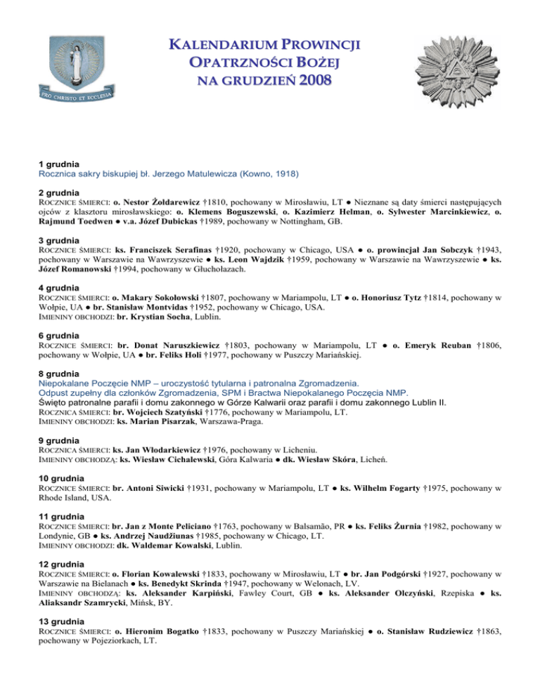 KALENDARIUM PROWINCJI OPATRZNOŚCI BOśEJ NA GRUDZIEŃ 2008 1 grudnia Rocznica sakry biskupiej bł. Jerzego Matulewicza (Kowno, 1918) 2 grudnia ROCZNICE ŚMIERCI: o. Nestor śołdarewicz †1810, pochowany w Mirosławiu, LT ● Nieznane są daty śmierci następujących ojców z klasztoru mirosławskiego: o. Klemens Boguszewski, o. Kazimierz Helman, o. Sylwester Marcinkiewicz, o. Rajmund Toedwen ● v.a. Józef Dubickas †1989, pochowany w Nottingham, GB. 3 grudnia ROCZNICE ŚMIERCI: ks. Franciszek Serafinas †1920, pochowany w Chicago, USA ● o. prowincjał Jan Sobczyk †1943, pochowany w Warszawie na Wawrzyszewie ● ks. Leon Wajdzik †1959, pochowany w Warszawie na Wawrzyszewie ● ks. Józef Romanowski †1994, pochowany w Głuchołazach. 4 grudnia ROCZNICE ŚMIERCI: o. Makary Sokołowski †1807, pochowany w Mariampolu, LT ● o. Honoriusz Tytz †1814, pochowany w Wołpie, UA ● br. Stanisław Montvidas †1952, pochowany w Chicago, USA. IMIENINY OBCHODZI: br. Krystian Socha, Lublin. 6 grudnia ROCZNICE ŚMIERCI: br. Donat Naruszkiewicz †1803, pochowany w Mariampolu, LT ● o. Emeryk Reuban †1806, pochowany w Wołpie, UA ● br. Feliks Holi †1977, pochowany w Puszczy Mariańskiej. 8 grudnia Niepokalane Poczęcie NMP – uroczystość tytularna i patronalna Zgromadzenia. Odpust zupełny dla członków Zgromadzenia, SPM i Bractwa Niepokalanego Poczęcia NMP. Święto patronalne parafii i domu zakonnego w Górze Kalwarii oraz parafii i domu zakonnego Lublin II. ROCZNICA ŚMIERCI: br. Wojciech Szatyński †1776, pochowany w Mariampolu, LT. IMIENINY OBCHODZI: ks. Marian Pisarzak, Warszawa-Praga. 9 grudnia ROCZNICA ŚMIERCI: ks. Jan Włodarkiewicz †1976, pochowany w Licheniu. IMIENINY OBCHODZĄ: ks. Wiesław Cichalewski, Góra Kalwaria ● dk. Wiesław Skóra, Licheń. 10 grudnia ROCZNICE ŚMIERCI: br. Antoni Siwicki †1931, pochowany w Mariampolu, LT ● ks. Wilhelm Fogarty †1975, pochowany w Rhode Island, USA. 11 grudnia ROCZNICE ŚMIERCI: br. Jan z Monte Peliciano †1763, pochowany w Balsamão, PR ● ks. Feliks śurnia †1982, pochowany w Londynie, GB ● ks. Andrzej Naudžiunas †1985, pochowany w Chicago, LT. IMIENINY OBCHODZI: dk. Waldemar Kowalski, Lublin. 12 grudnia ROCZNICE ŚMIERCI: o. Florian Kowalewski †1833, pochowany w Mirosławiu, LT ● br. Jan Podgórski †1927, pochowany w Warszawie na Bielanach ● ks. Benedykt Skrinda †1947, pochowany w Welonach, LV. IMIENINY OBCHODZĄ: ks. Aleksander Karpiński, Fawley Court, GB ● ks. Aleksander Olczyński, Rzepiska ● ks. Aliaksandr Szamrycki, Mińsk, BY. 13 grudnia ROCZNICE ŚMIERCI: o. Hieronim Bogatko †1833, pochowany w Puszczy Mariańskiej ● o. Stanisław Rudziewicz †1863, pochowany w Pojeziorkach, LT. 14 grudnia ROCZNICE ŚMIERCI: ks. Bronisław Valpitrs †1976, pochowany w Welonach, LV ● ks. Henryk Utykański †2005, pochowany w Kurytybie, BR. 15 grudnia ROCZNICA ŚMIERCI: ks. Bogumił Teofil Lubecki †2007, pochowany w Kurytybie, BR. 16 grudnia ROCZNICE ŚMIERCI: o. Karol Iwaszewski †1861, pochowany w Świętych Jeziorach k. Mirosławia, LT ● br. Andrzej Stepanavičius †1959, pochowany w Chicago, USA. 17 grudnia ROCZNICE ŚMIERCI: o. Stanisław Jabłonowski †1906, pochowany w Bednarach ● ks. Eugeniusz Chajęcki †1983, pochowany w Warszawie na Wawrzyszewie. 18 grudnia ROCZNICE ŚMIERCI: o. Leopold Wawrau †1799, pochowany w Goźlinie ● o. Ignacy Mekelberg †1822, pochowany w Puszczy Mariańskiej. 19 grudnia ROCZNICE ŚMIERCI: dk. Hieronim Dąbrowski †1754, pochowany w Puszczy Mariańskiej ● o. Michał Moczulski †1809, pochowany w Górze Kalwarii ● br. Władysław Mickevičius †1933, pochowany w Mariampolu, LT. IMIENINY OBCHODZĄ: ks. Dariusz Drzewiecki, Lublin ● ks. Dariusz Hirsch, Medlingen, D ● ks. Dariusz Kwiatkowski, Londyn, GB ● ks. Dariusz MaŜewski, Warszawa-Stegny. 20 grudnia ROCZNICA ŚMIERCI: o. Maciej Dauksza †1889, pochowany w Mariampolu, LT. 21 grudnia ROCZNICE ŚMIERCI: o. Teodor Nowicki †1819, pochowany w Goźlinie ● o. Mikołaj Szląskowski †1861, pochowany w Jazgarzewie ● ks. Józef Packevičius †1941 ● ks. Fidelis Grabowski †2002, pochowany w Stockbridge, USA. 22 grudnia ROCZNICE ŚMIERCI: br. Gabriel Gilis †1931, pochowany w PoniewieŜu, LT ● ks. Józef Mačiulonis †1977, pochowany w Chicago, USA ● ks. Władysław Czarniauski †2002, pochowany w Wiszniewie, BY. 23 grudnia ROCZNICE ŚMIERCI: ks. Władysław Lewicki †1957, pochowany w Warszawie na Wawrzyszewie ● ks. Hilary Misiunas †1996, pochowany w Mariampolu, LT. 24 grudnia ROCZNICE ŚMIERCI: ks. Jerzy Tylvitys †1931, pochowany w Mariampolu, LT ● ks. Witalis Chamionek †1971, pochowany w Warszawie na Wawrzyszewie. IMIENINY OBCHODZĄ: ks. Adam Boniecki, Kraków ● ks. Adam Jaskulski, Grudziądz ● ks. Adam Kowal, Licheń ● ks. Adam Sikorski, Sulejówek ● ks. Adam Stankiewicz, Rzym, IT. 25 grudnia Narodzenie Pańskie. Odpust zupełny dla członków Bractwa Niepokalanego Poczęcia NMP. ROCZNICE ŚMIERCI: ks. Stefan Warszawski †1932, pochowany w Warszawie na Wawrzyszewie ● ks. Franciszek Opieczonek †1997, pochowany w Skórcu. 26 grudnia ROCZNICE ŚMIERCI: o. Dionizy Kisieliński †1782, pochowany w Goźlinie ● ks. Józef Hermanowicz †1978, pochowany w Londynie, GB. 27 grudnia ROCZNICE ŚMIERCI: o. Jan a Rosario †1763, pochowany w Balsamão, PR ● br. Wiktor Mockievičius †1982, pochowany w Druskiennikach, LT. IMIENINY OBCHODZĄ: Ojciec Generał Jan Mikołaj Rokosz, Rzym, IT ● ks. Jan Sucharzewski, Grudziądz. 28 grudnia ROCZNICE ŚMIERCI: o. Łukasz Paluszkiewicz †1754, pochowany w Skórcu ● br. Symeon Radziszewski †1796, pochowany w Skórcu ● o. Antoni Kowalewski †1812, pochowany w Mariampolu, LT. 29 grudnia ROCZNICE ŚMIERCI: br. Franciszek Ksawery Pławiński †1812, pochowany w Skórcu ● o. Walenty Wilczyński †1832, pochowany w Kutnie ● o. Franciszek Głowacki †1847, pochowany w Mariampolu, LT ● ks. Jan Al